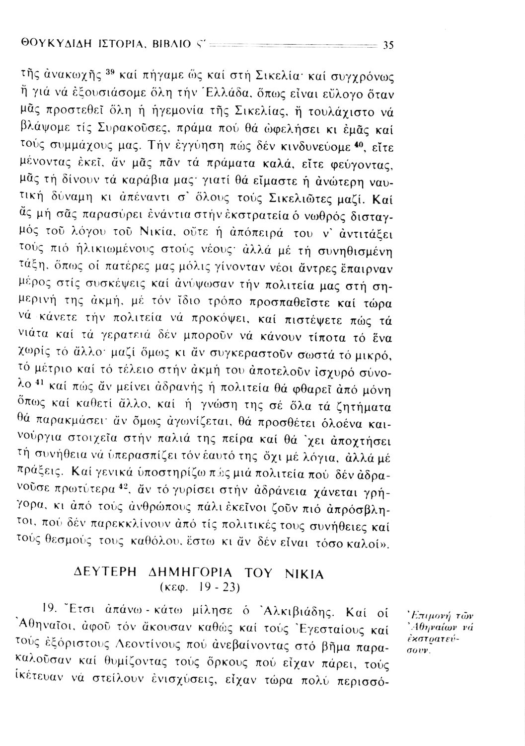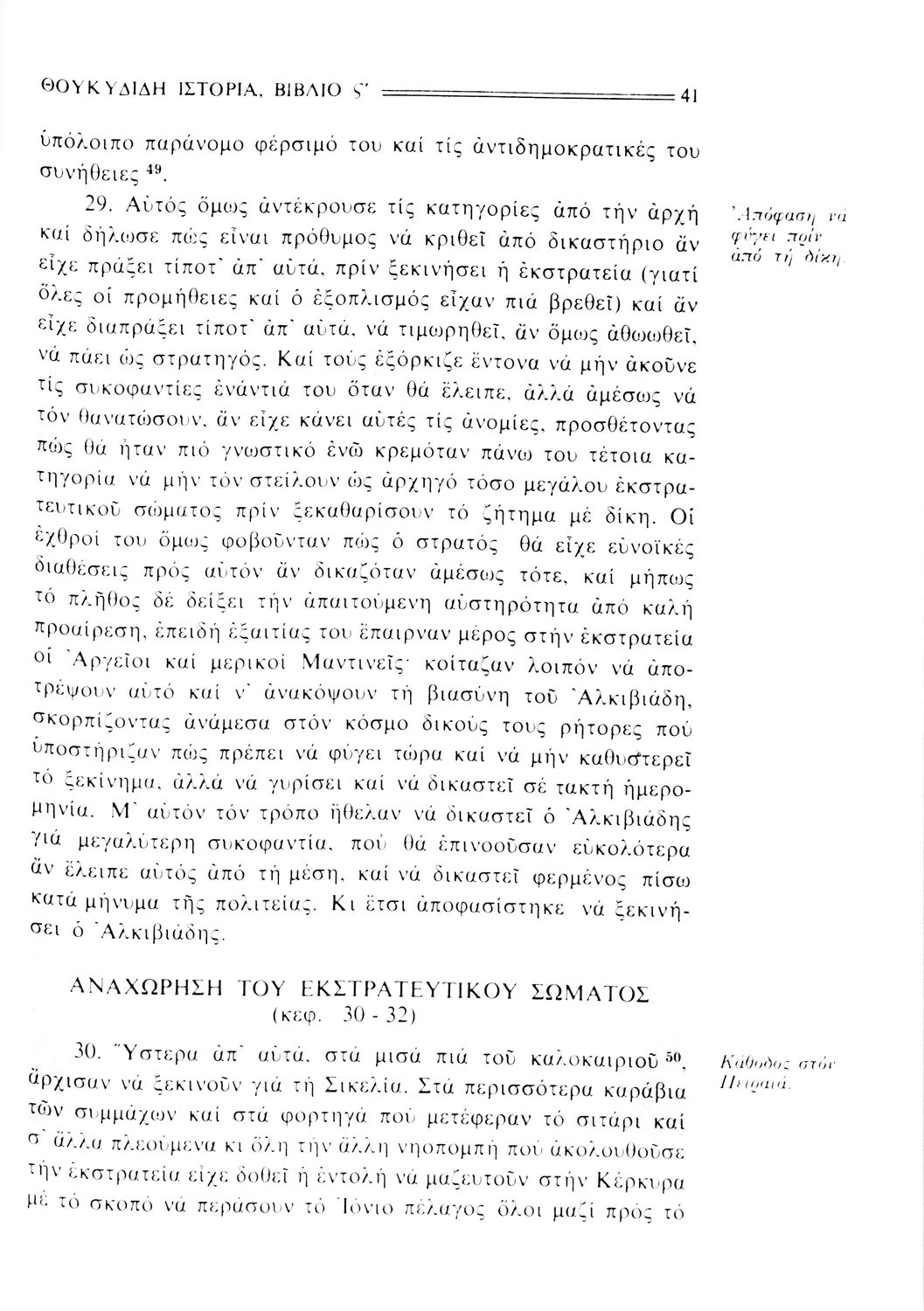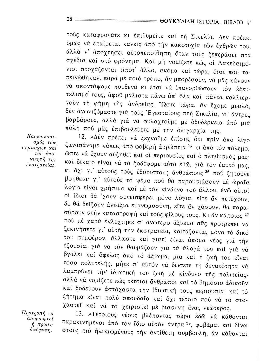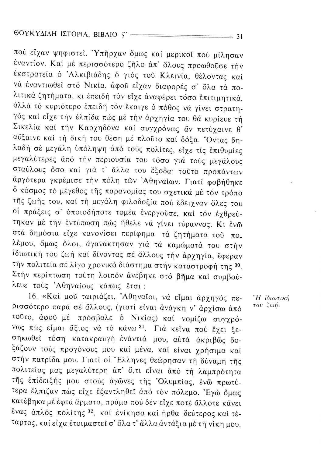 Σχολικό εγχειρίδιο Αρχαίων Ελληνικών Β΄ Γυμνασίου που περιλαμβάνει την μετάφραση των βιβλίων ΣΤ΄ και Ζ΄ της Ιστορίας του Θουκυδίδη, εισαγωγή στη ζωή και το έργο του, και ερμηνευτικά και πραγματολογικά σχόλια.
