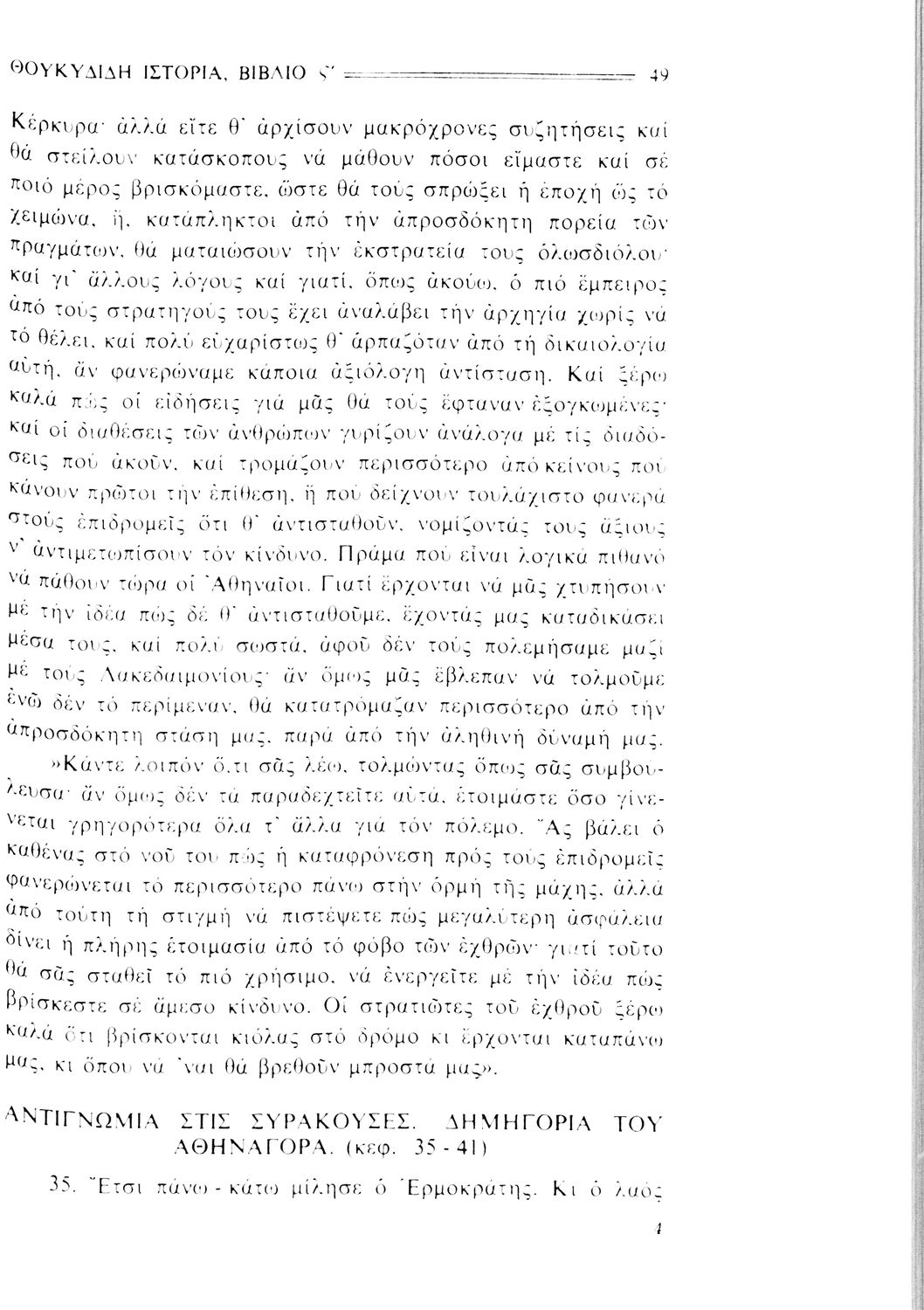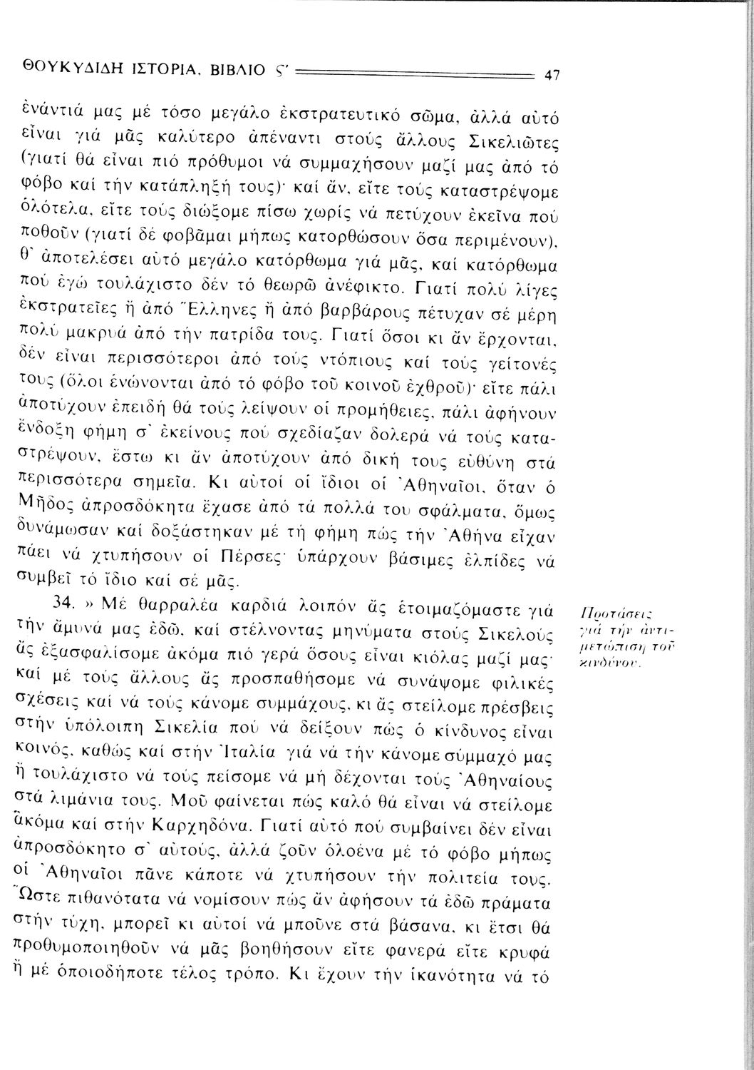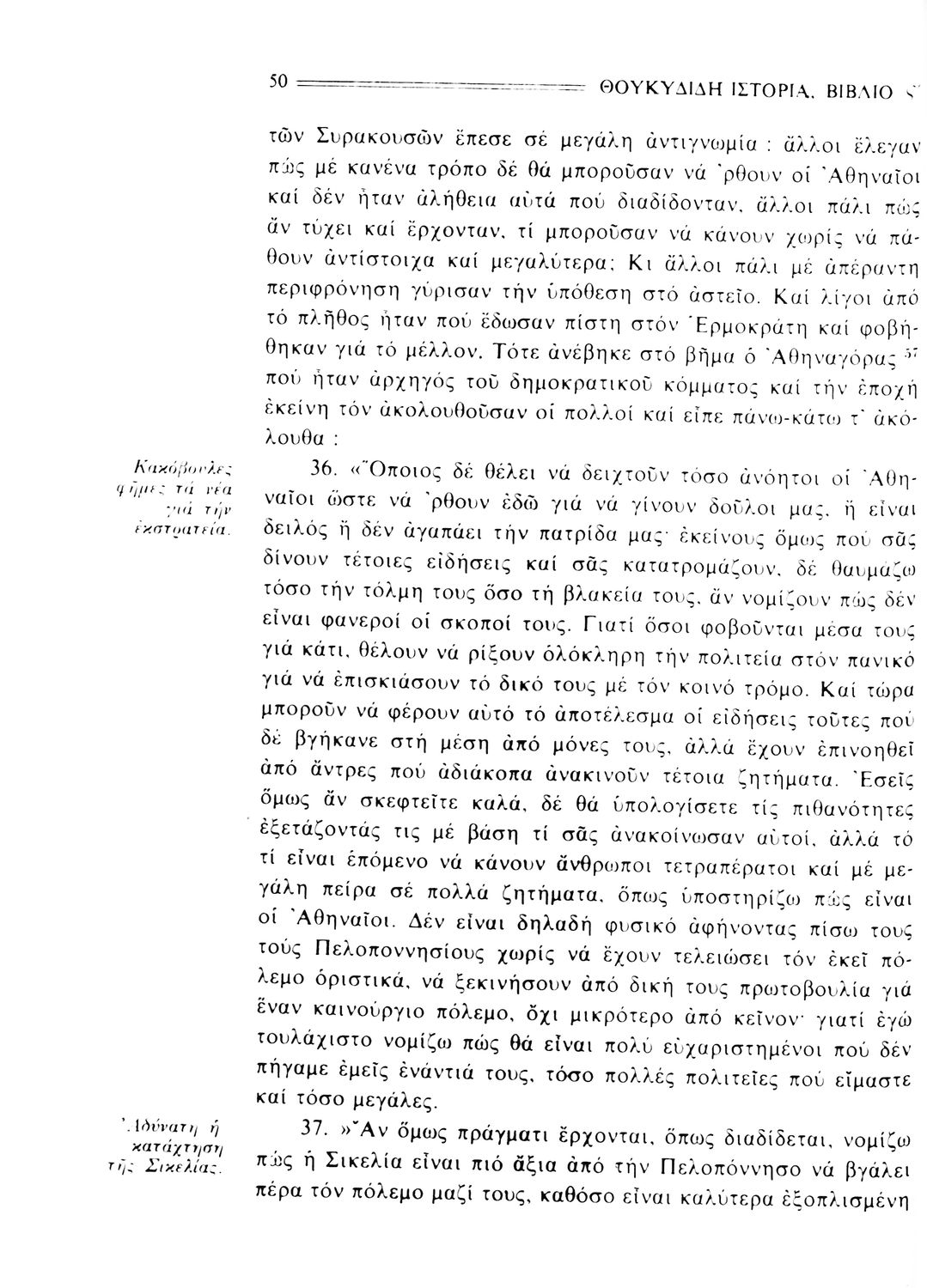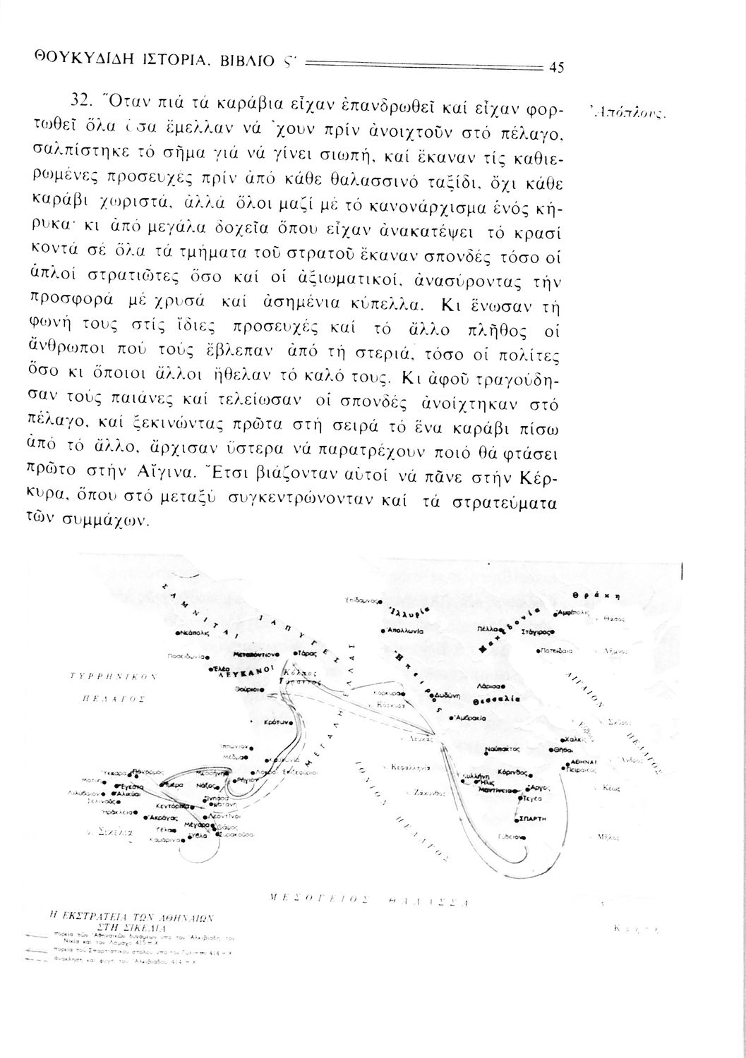 Σχολικό εγχειρίδιο Αρχαίων Ελληνικών Β΄ Γυμνασίου που περιλαμβάνει την μετάφραση των βιβλίων ΣΤ΄ και Ζ΄ της Ιστορίας του Θουκυδίδη, εισαγωγή στη ζωή και το έργο του, και ερμηνευτικά και πραγματολογικά σχόλια.