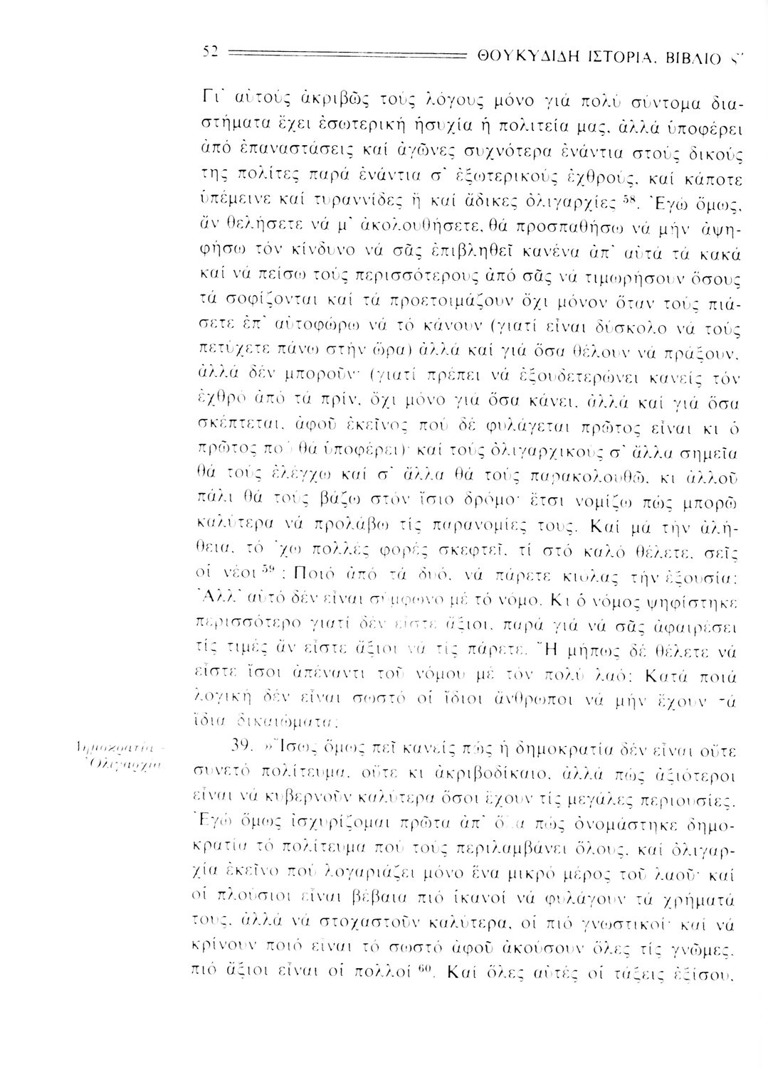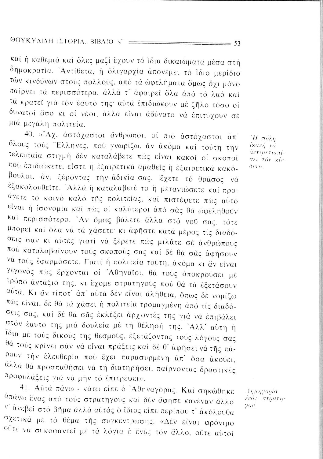 Σχολικό εγχειρίδιο Αρχαίων Ελληνικών Β΄ και Γ΄ Γυμνασίου που περιέχει αποσπάσματα από το έργο του Θουκυδίδη Ιστορία, και με ερμηνευτικές και πραγματολογικές παρατηρήσεις.