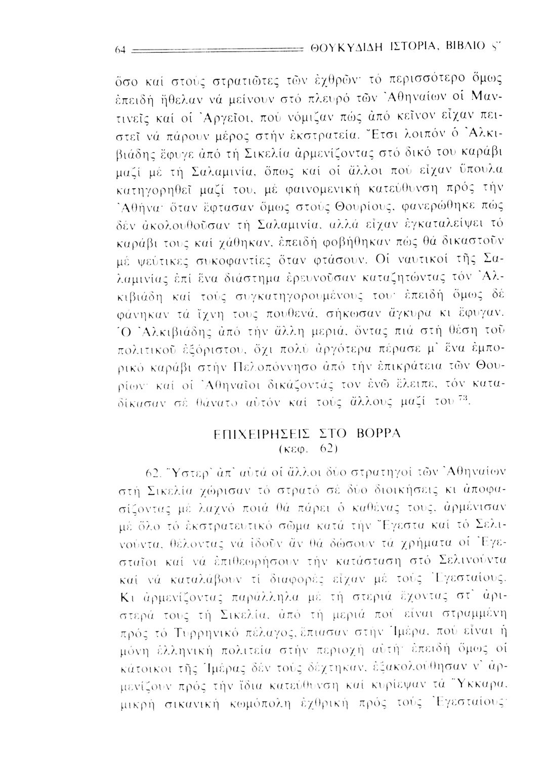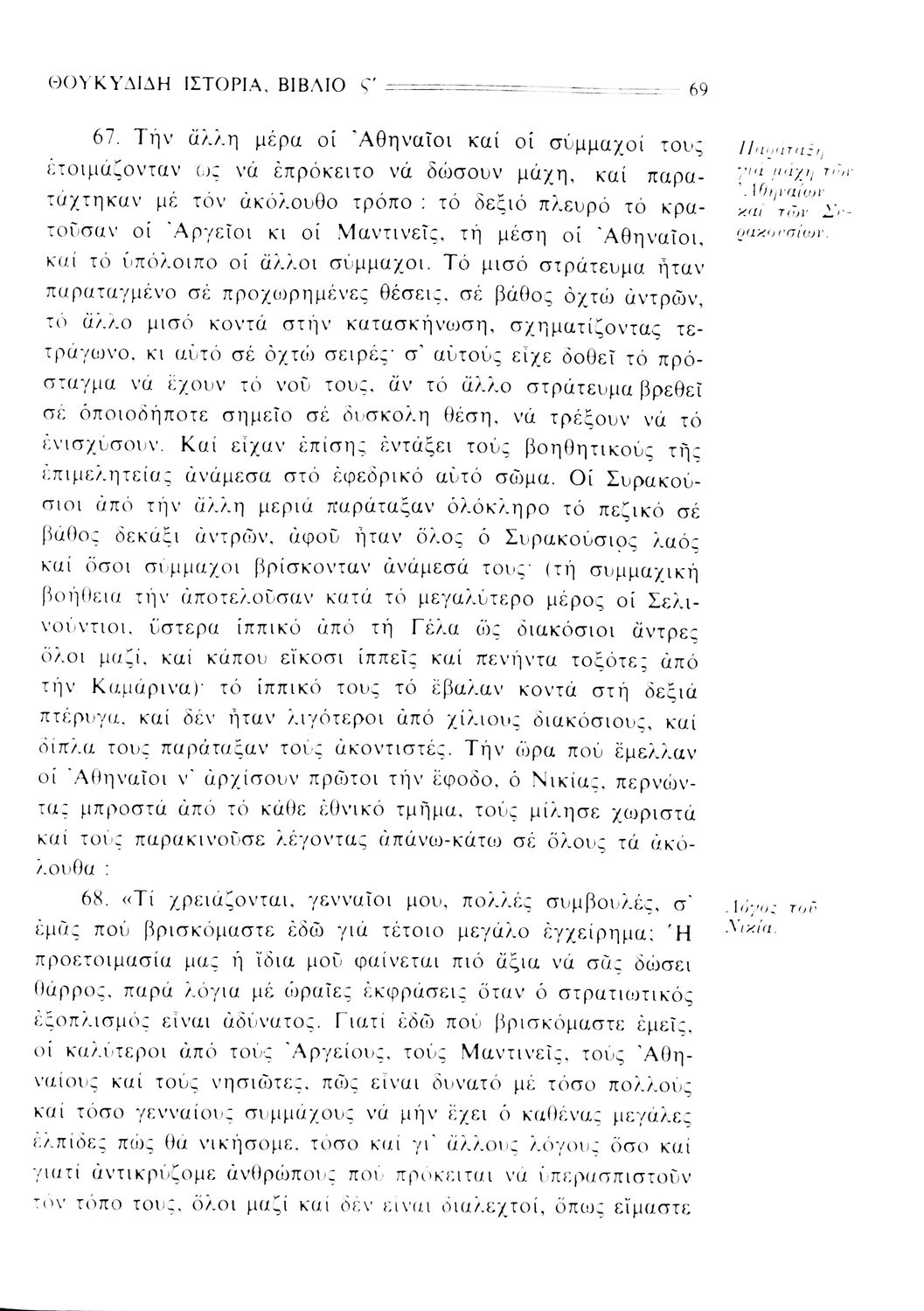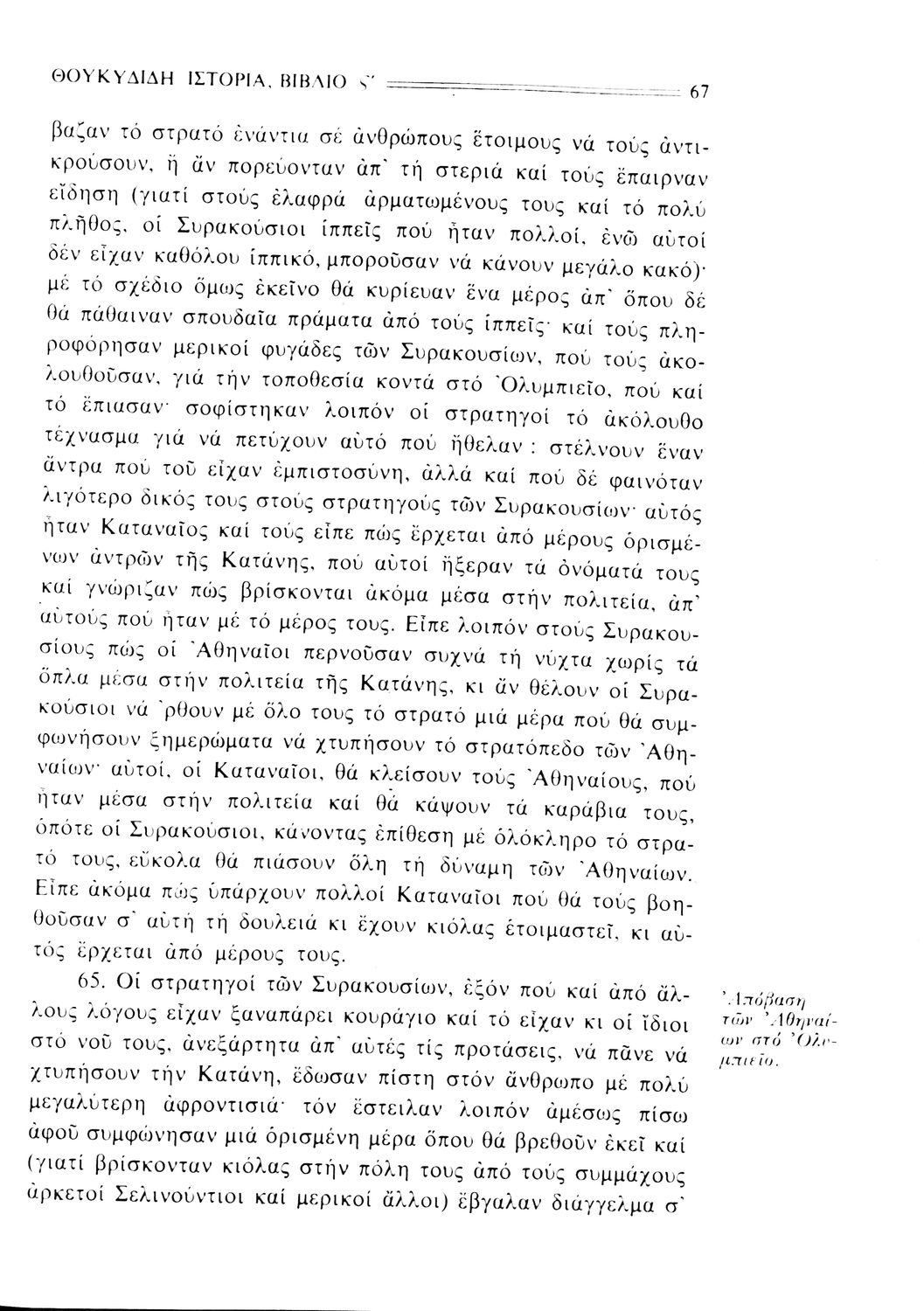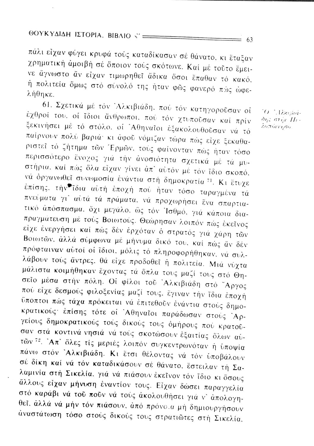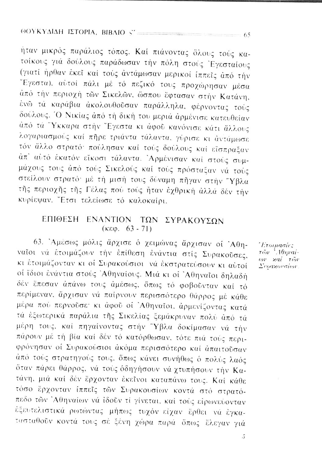 Σχολικό εγχειρίδιο Αρχαίων Ελληνικών Β΄ Γυμνασίου που περιλαμβάνει την μετάφραση των βιβλίων ΣΤ΄ και Ζ΄ της Ιστορίας του Θουκυδίδη, εισαγωγή στη ζωή και το έργο του, και ερμηνευτικά και πραγματολογικά σχόλια.