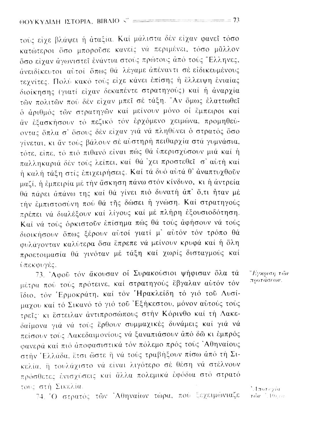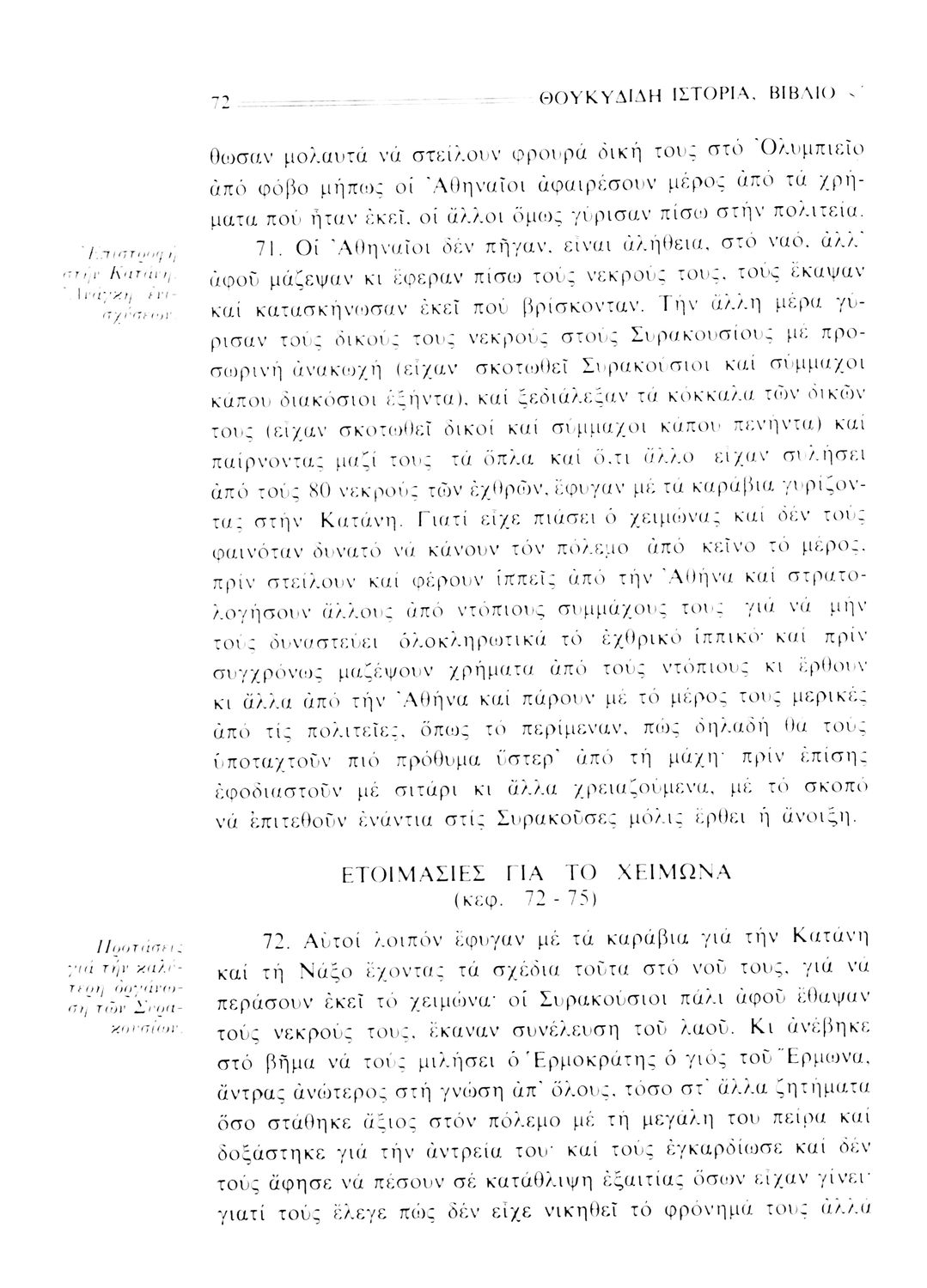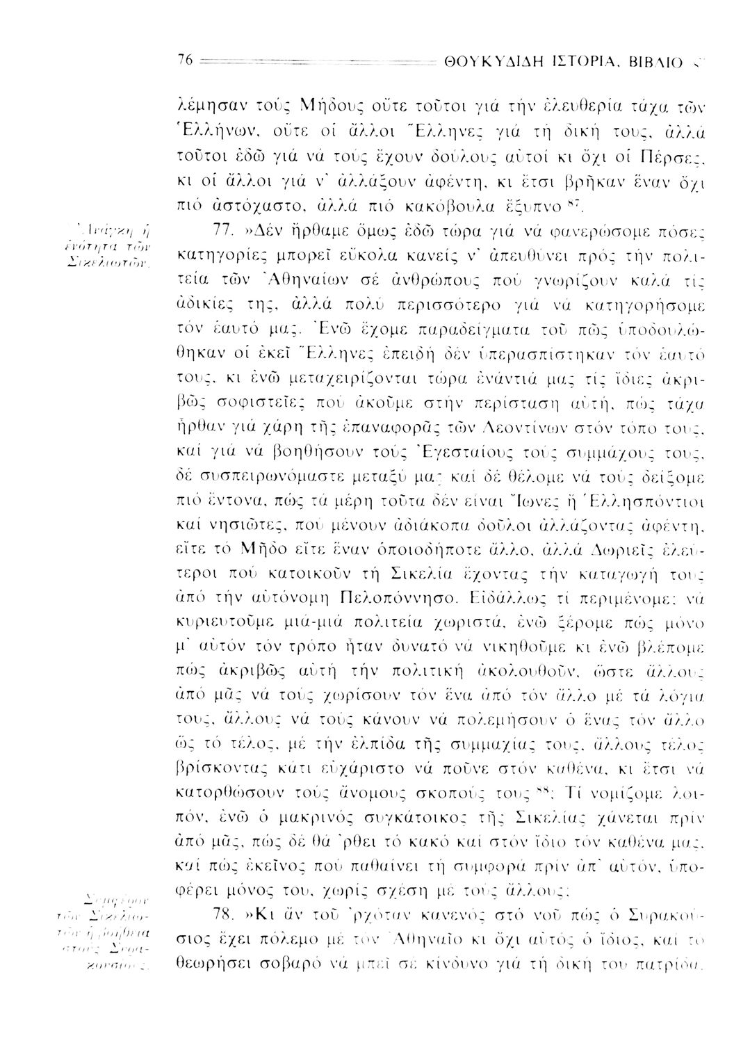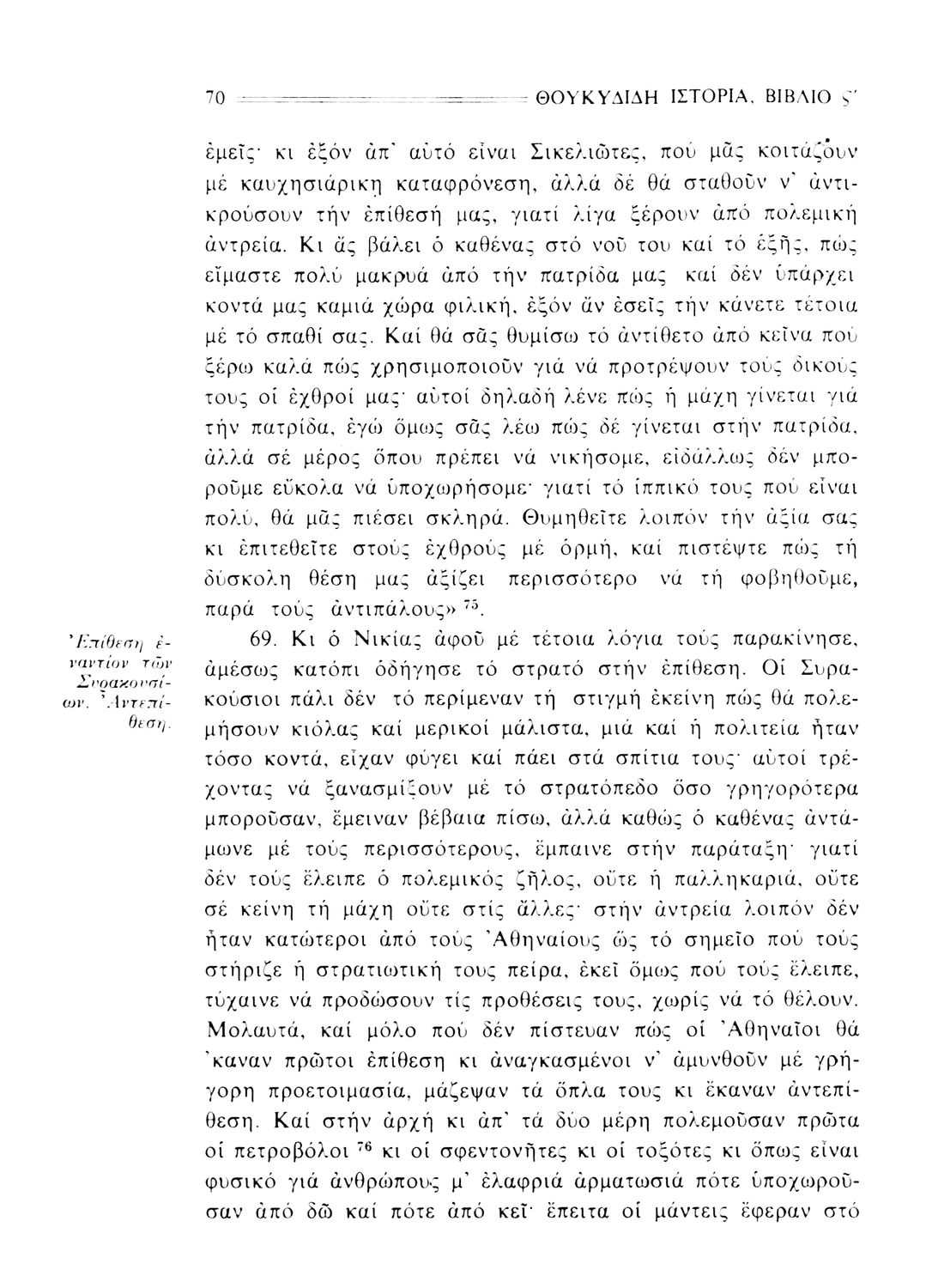 Σχολικό εγχειρίδιο Αρχαίων Ελληνικών Β΄ Γυμνασίου που περιλαμβάνει την μετάφραση των βιβλίων ΣΤ΄ και Ζ΄ της Ιστορίας του Θουκυδίδη, εισαγωγή στη ζωή και το έργο του, και ερμηνευτικά και πραγματολογικά σχόλια.