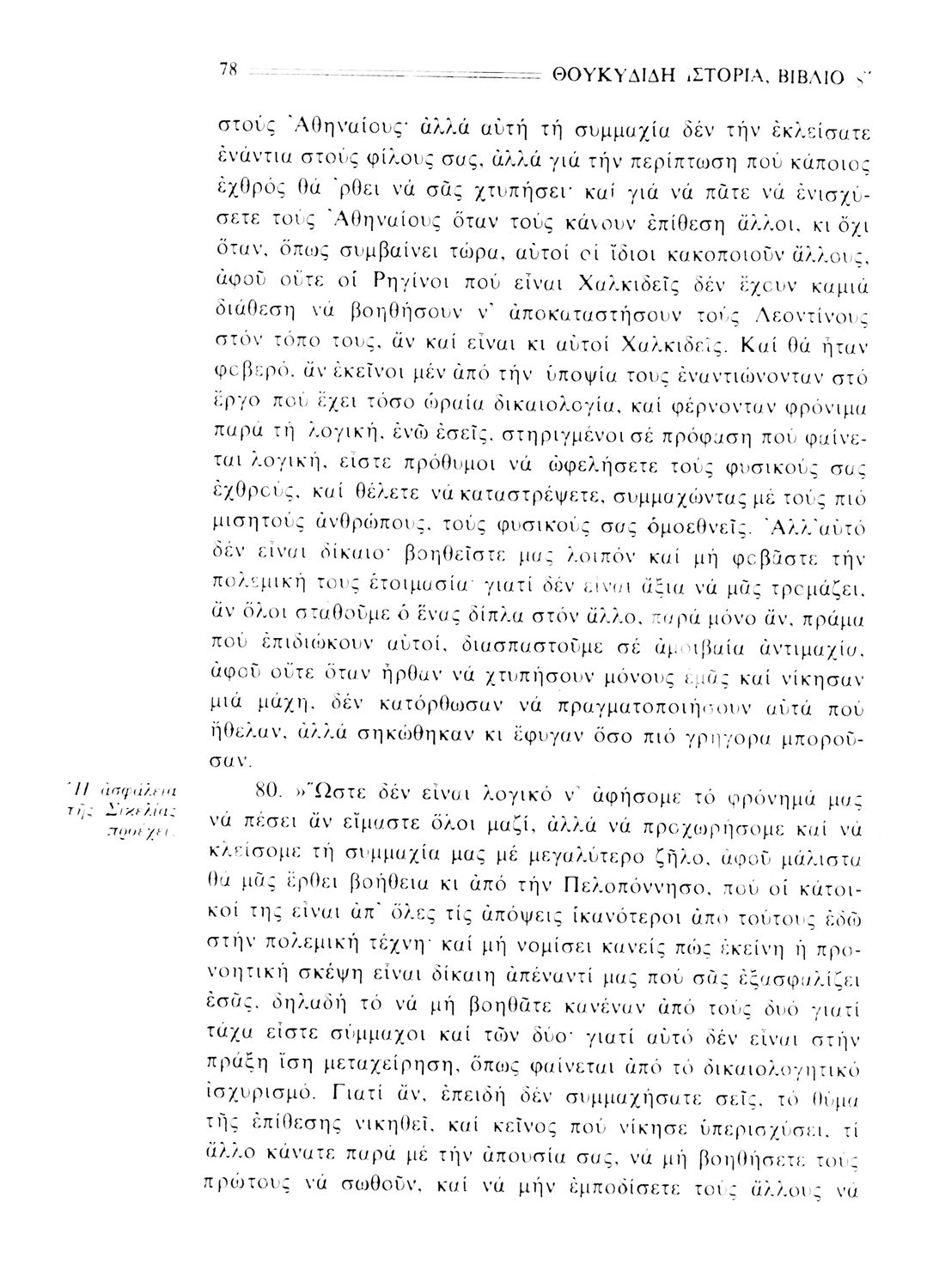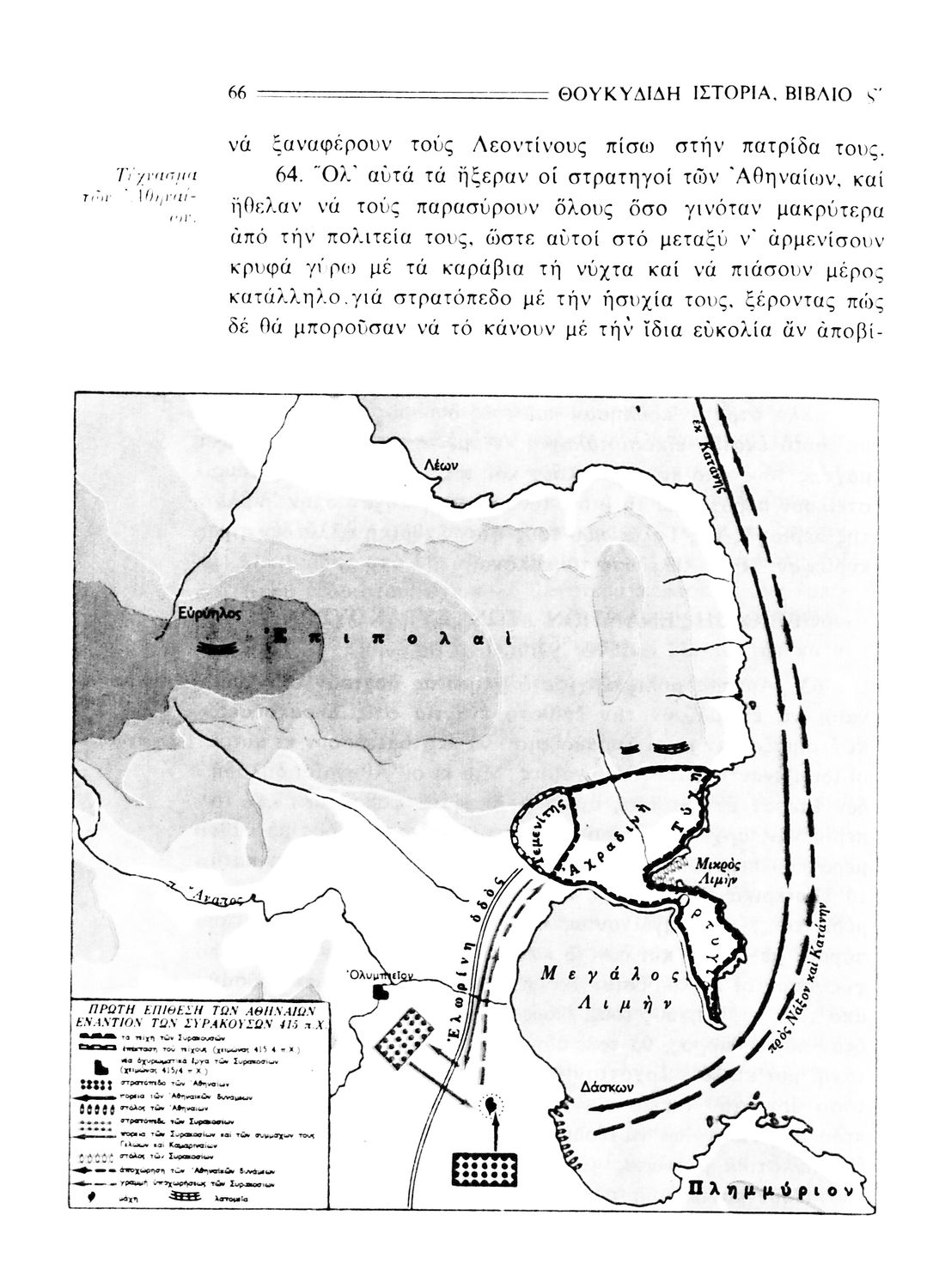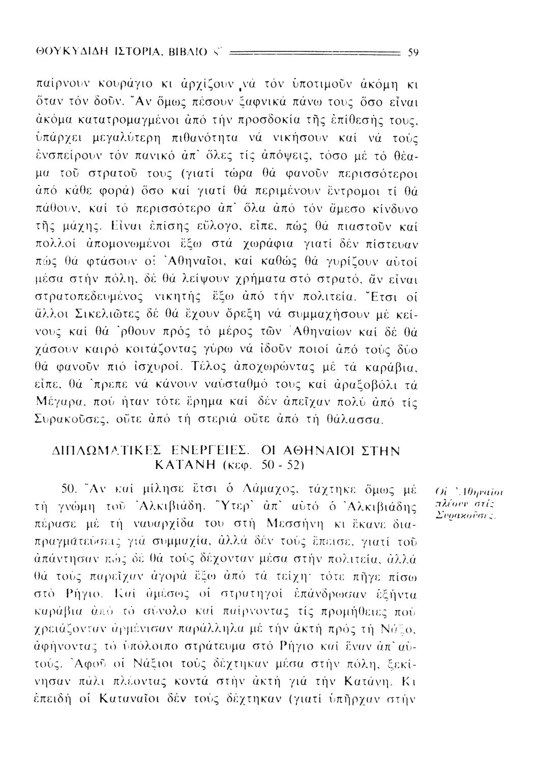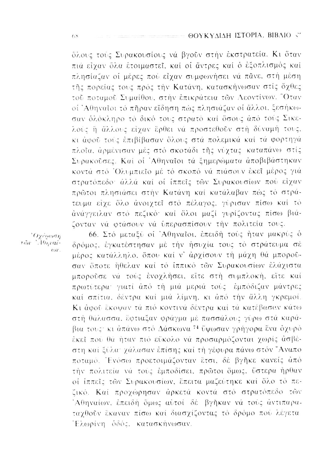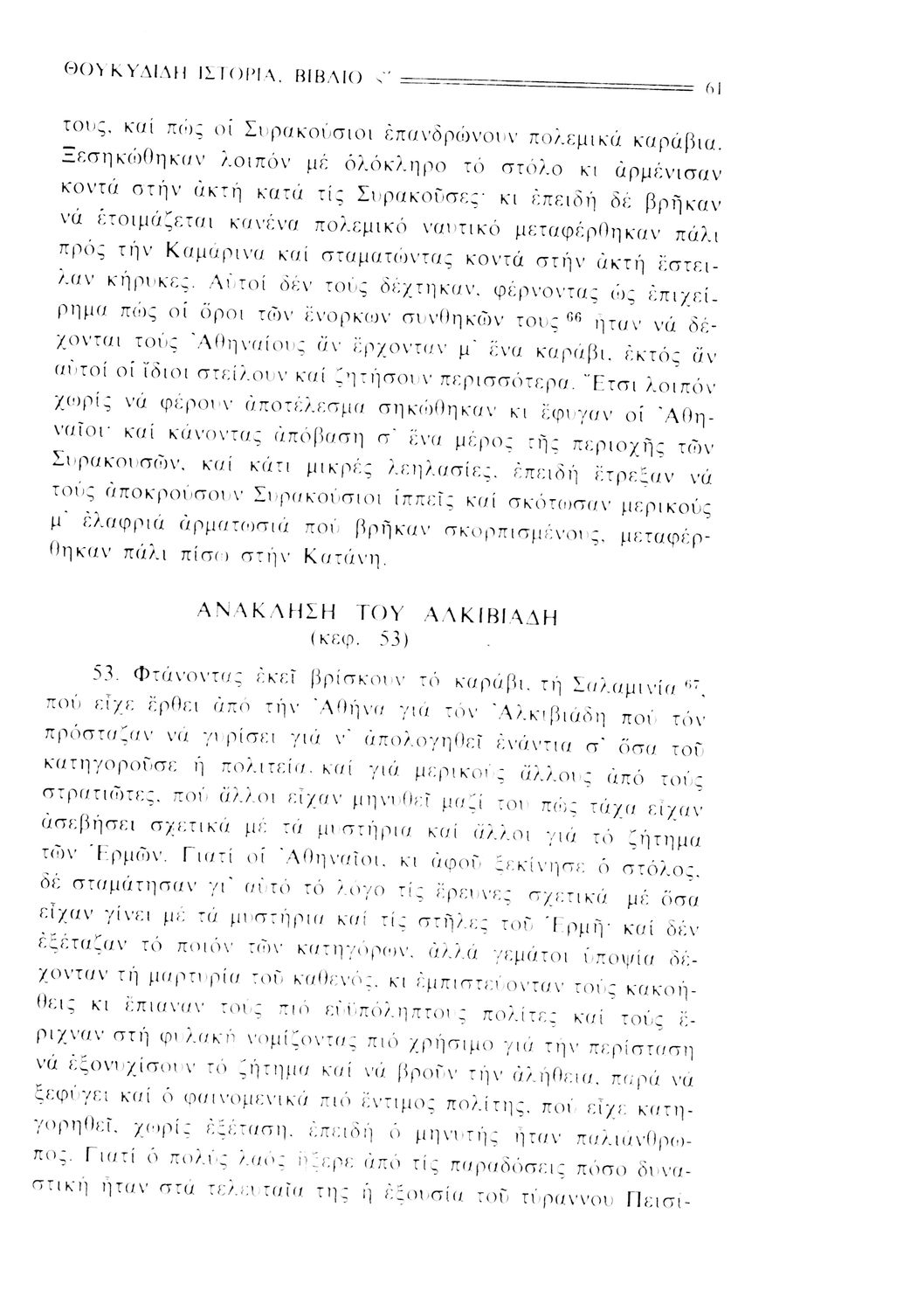 Σχολικό εγχειρίδιο Αρχαίων Ελληνικών Β΄ Γυμνασίου που περιλαμβάνει την μετάφραση των βιβλίων ΣΤ΄ και Ζ΄ της Ιστορίας του Θουκυδίδη, εισαγωγή στη ζωή και το έργο του, και ερμηνευτικά και πραγματολογικά σχόλια.