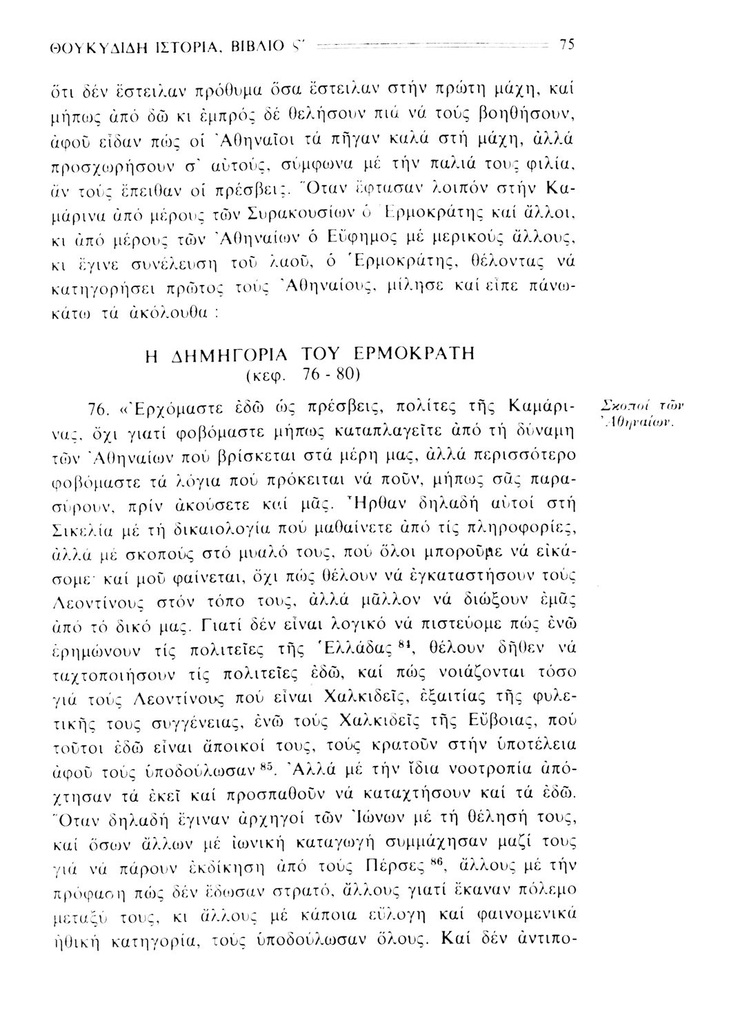 Σχολικό εγχειρίδιο Αρχαίων Ελληνικών Β΄ και Γ΄ Γυμνασίου που περιέχει αποσπάσματα από το έργο του Θουκυδίδη Ιστορία, και ερμηνευτικές και πραγματολογικές παρατηρήσεις.