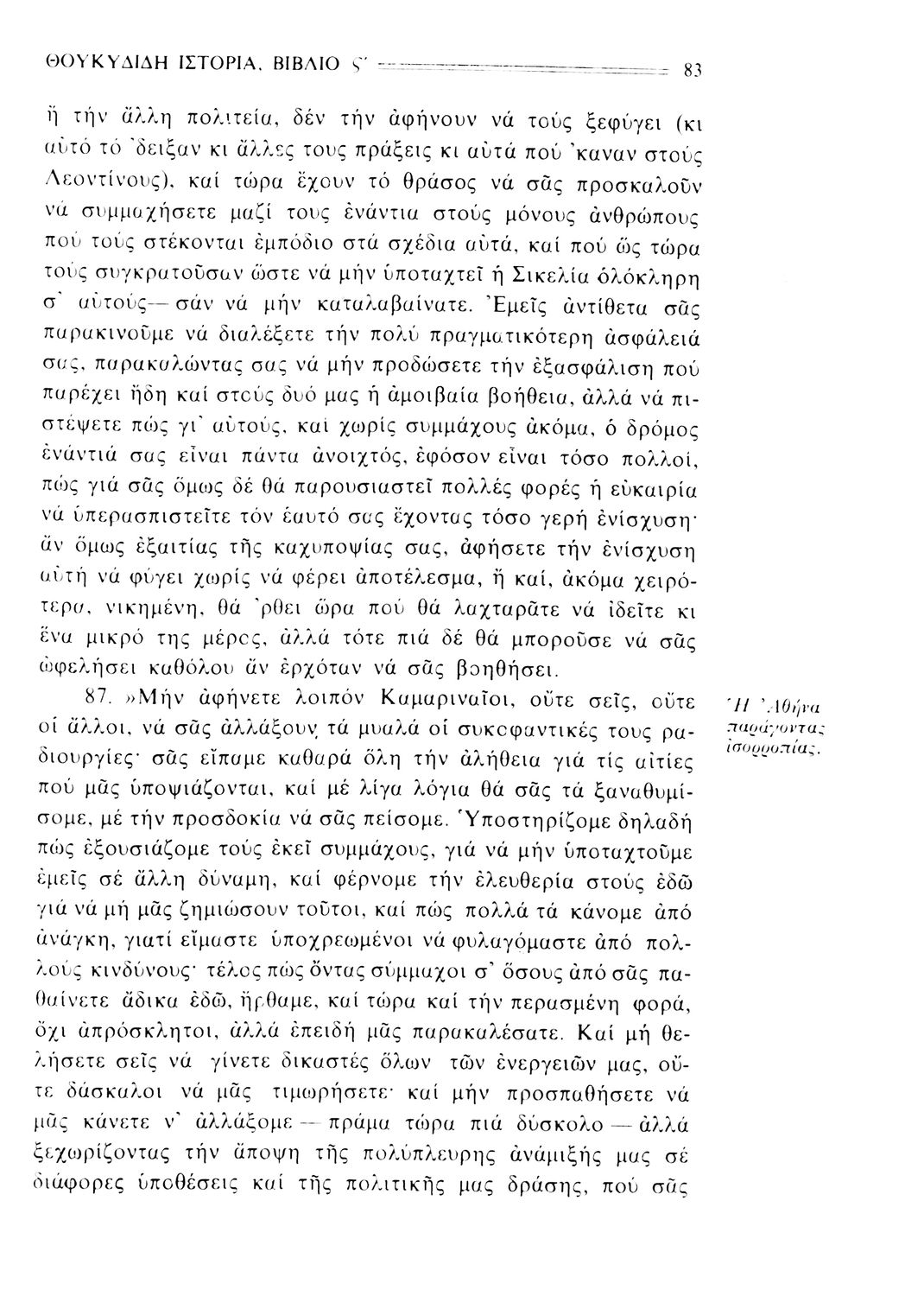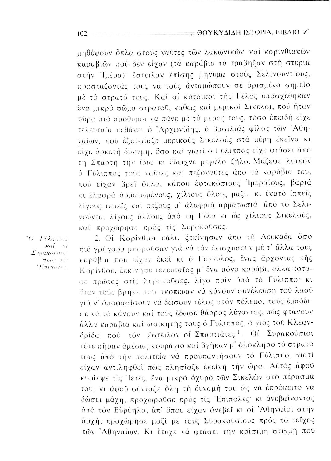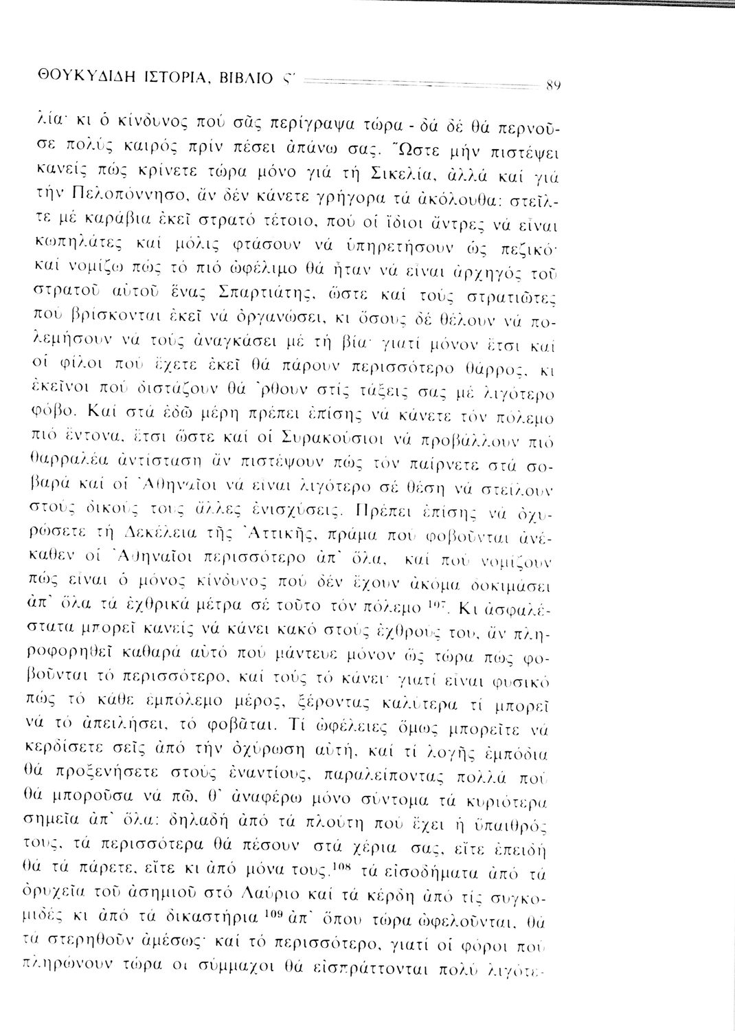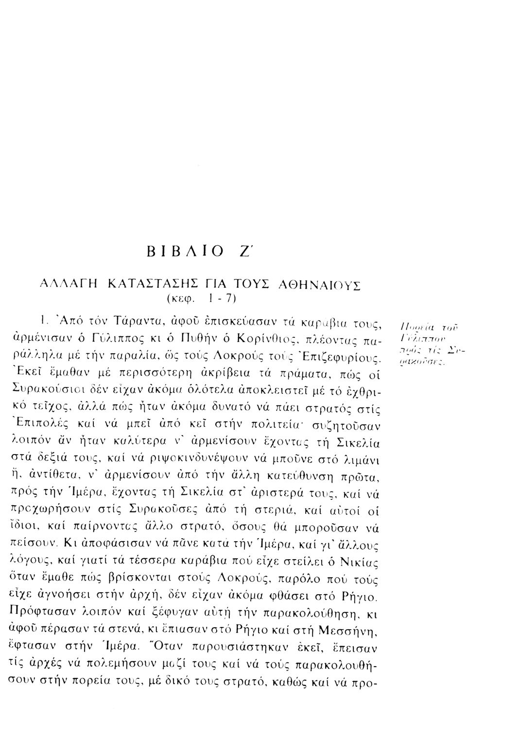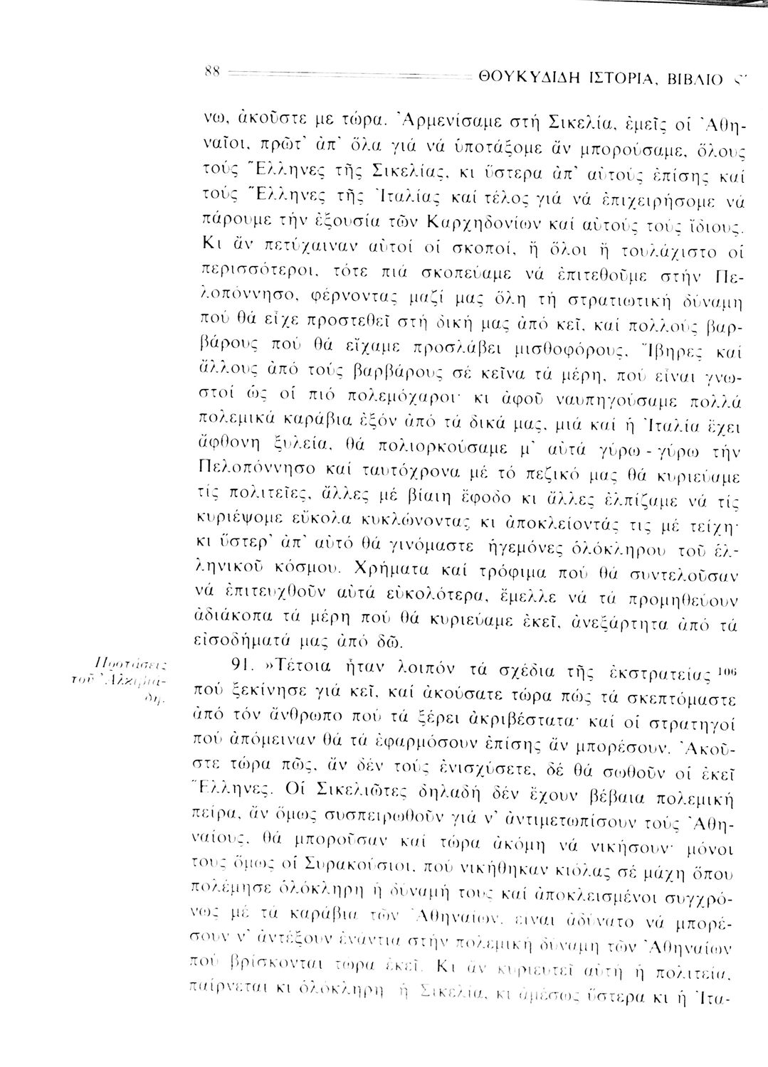 Σχολικό εγχειρίδιο Αρχαίων Ελληνικών Β΄ Γυμνασίου που περιλαμβάνει την μετάφραση των βιβλίων ΣΤ΄ και Ζ΄ της Ιστορίας του Θουκυδίδη, εισαγωγή στη ζωή και το έργο του, και ερμηνευτικά και πραγματολογικά σχόλια.
