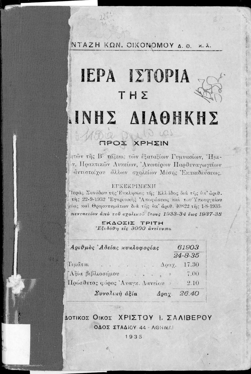 Εκδότης: Χρήστος Ι. Σαλίβερος Έτος έκδοσης: 1935 Τόπος έκδοσης: Αθήνα Έκδοση: 3η Υπουργική απόφαση / Σύμβαση: 40822/1-8-1933 Έτος έγκρισης: 1933 |