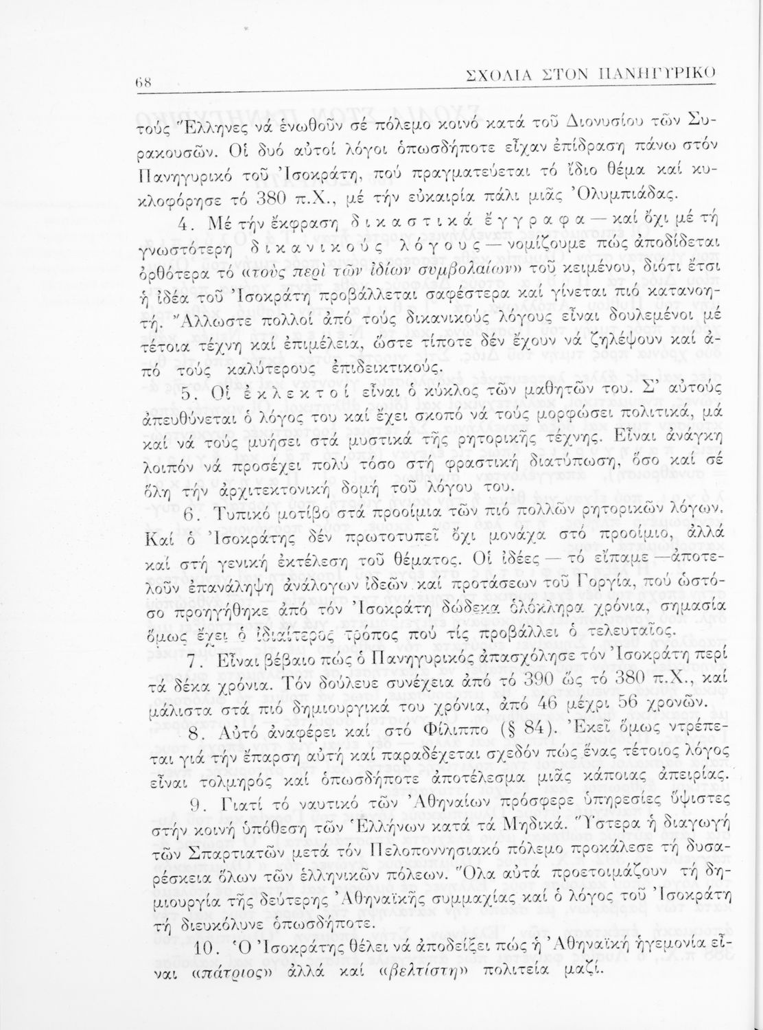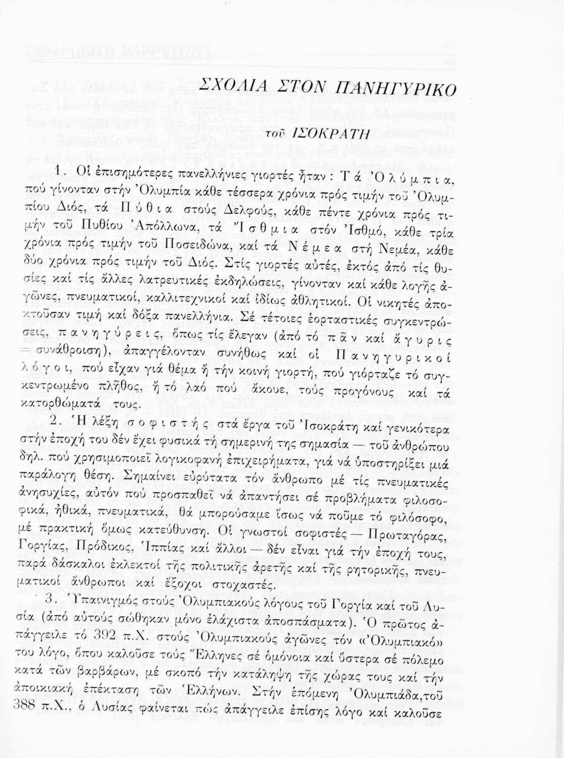 Σχολικό εγχειρίδιο Αρχαίων Ελληνικών Β΄ Γυμνασίου που περιλαμβάνει εισαγωγή στη ζωή και το έργο του Ισοκράτη, τον Πανηγυρικό, μετάφραση και ερμηνευτικές σημειώσεις.