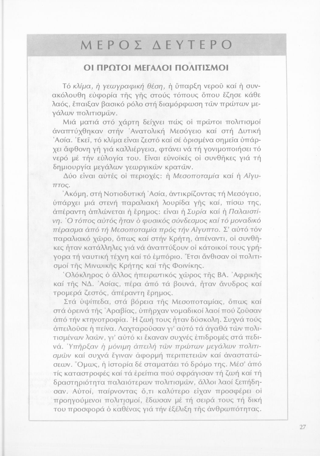 Σχολικό εγχειρίδιο Ιστορίας Α΄ Γυμνασίου και Α΄ Λυκείου που καλύπτει την περίοδο από την περίοδο από την εμφάνιση των πρώτων πολιτισμών μέχρι τους Καρχηδονικούς Πολέμους. Περιλαμβάνει χρονολόγιο και γλωσσάριο ...