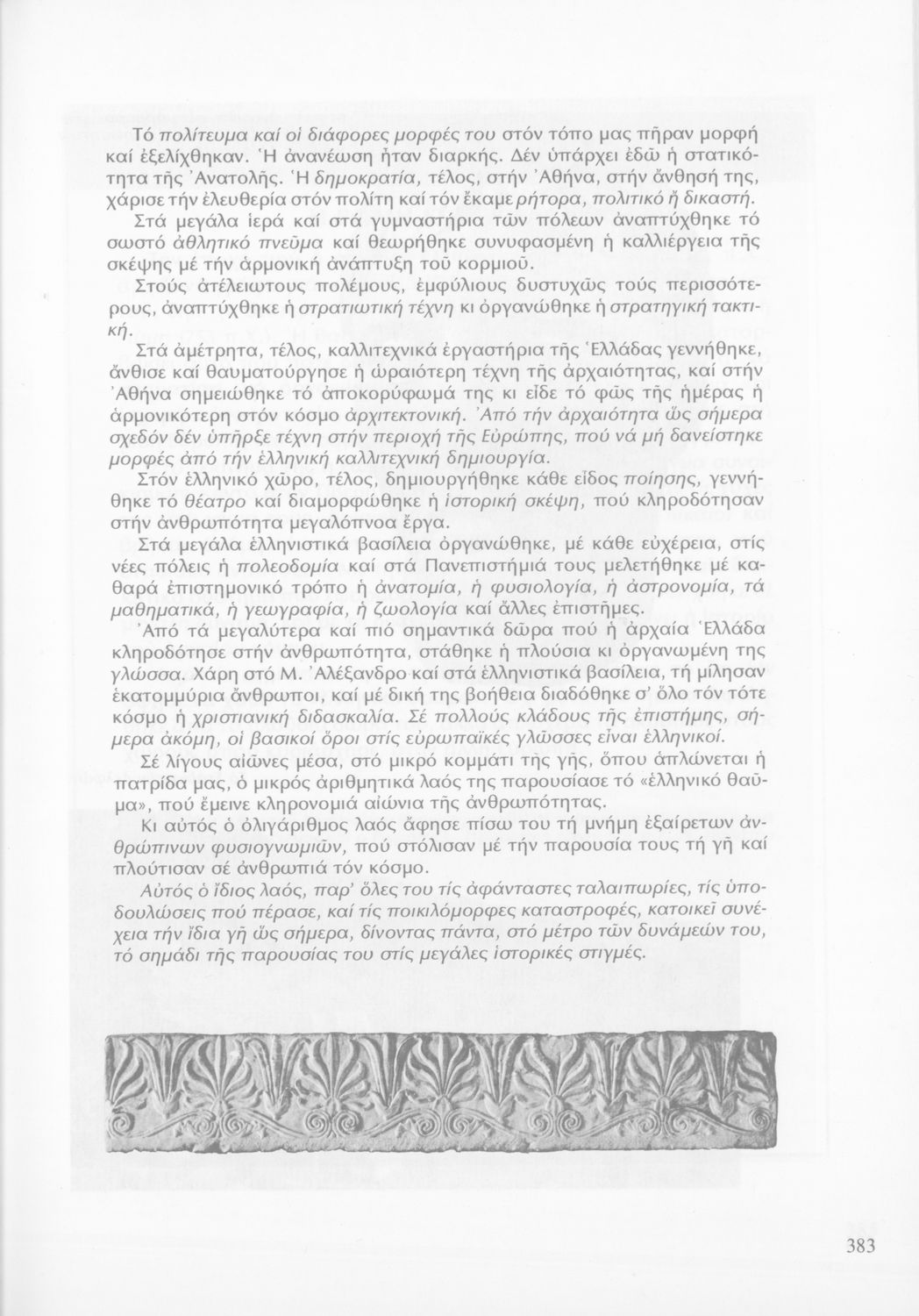 LDR 01457 2200229 4500 035 ## _a01-17462 040 ## _aΙνστιτούτο Εκπαιδευτικής Πολιτικής 041 ## _ael 100 ## _aΑθηνά Γ. Καλογεροπούλου 110 ## _a17462 245 0# _aΙστορία των αρχαίων χρόνων ως τα 146 π. Χ. Α΄ Γυμνασίου 250 ## _a9η Έκδοση 260 ## _aΑθήνα _bΟργανισμός Εκδόσεως Διδακτικών Βιβλίων _c1982 300 ## _a423 _bΣκίτσα, χάρτης, εικόνες (ασπρόμαυρα) 520 ## _aΣχολικό εγχειρίδιο Ιστορίας Α΄ Γυμνασίου που καλύπτει την περίοδο από την περίοδο από την εμφάνιση των πρώτων πολιτισμών μέχρι τους Καρχηδονικούς Πολέμους. Περιλαμβάνει χρονολόγιο και γλωσσάριο με επεξήγηση ορισμών. 521 ## _aΑ' Γυμνασίου 522 ## _aΕλλάδα 546 ## _aΔημοτική 563 ## _aΣκληρό Εξώφυλλο 583 ## _a3726/12-1-1982 _c1982 650 #4 _aΑιγύπτοι _aΑποικίες _aΔωριείς _aΚαρχηδόνα _aΜ Αλέξανδρος _aΜακεδονία _aΠελοποννησιακός πόλεμος _aΠερικλής _aΠέρσες _aΡώμη 700 ## _aΛουΐζα Μοντεσάντου