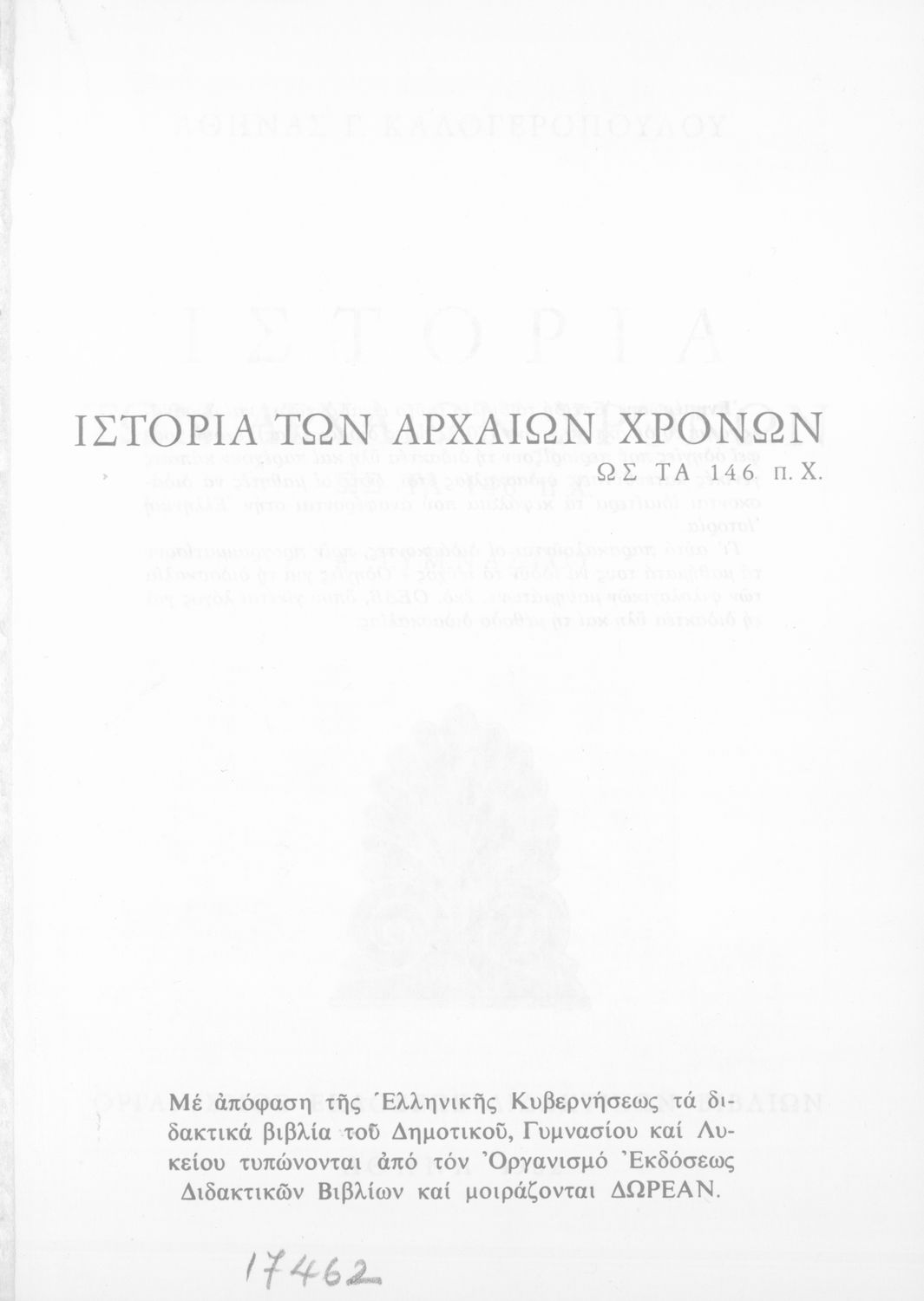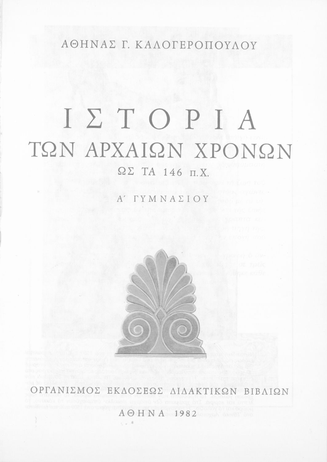 Κωδικός αναγνώρισης: 01-17462 Τίτλος: Ιστορία των αρχαίων χρόνων ως τα 146 π. Χ. Α΄ Γυμνασίου Συγγραφέας: Αθηνά Γ. Καλογεροπούλου Εικονογράφος: Λουΐζα Μοντεσάντου Μέγεθος και υπόστρωμα: Σχολικό εγχειρίδιο, σκληρό εξώφυλλο, 423 σελίδες. Σκίτσα, χάρτης, εικόνες (ασπρόμαυρα). |
