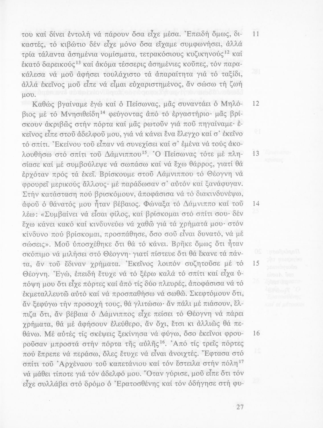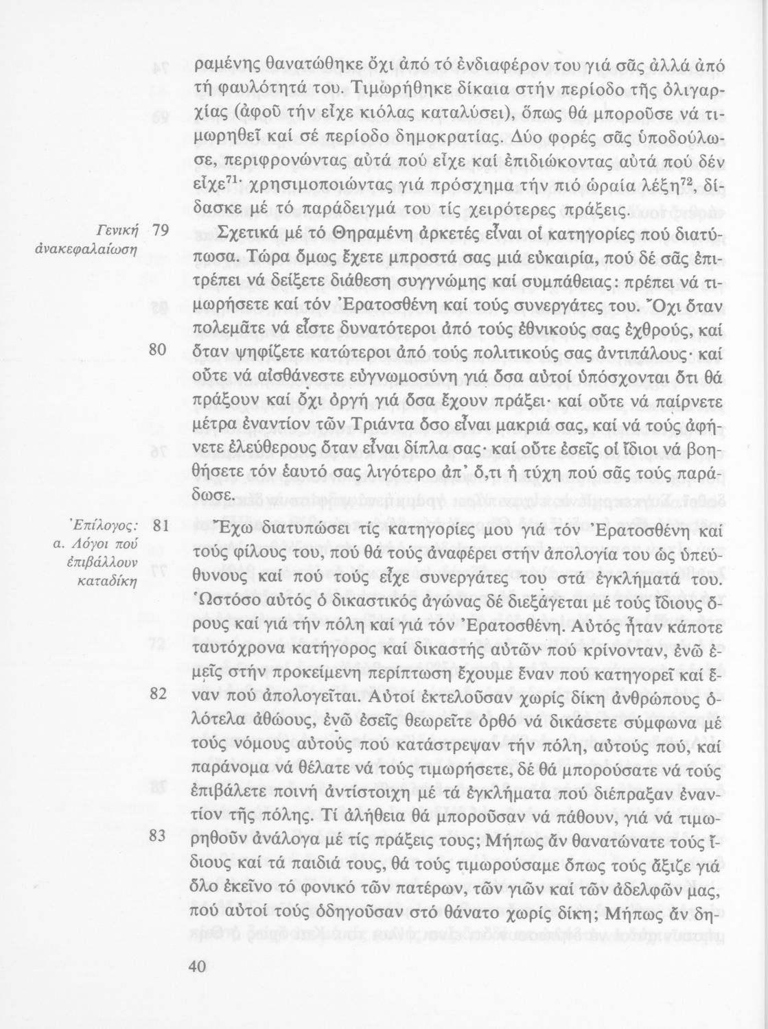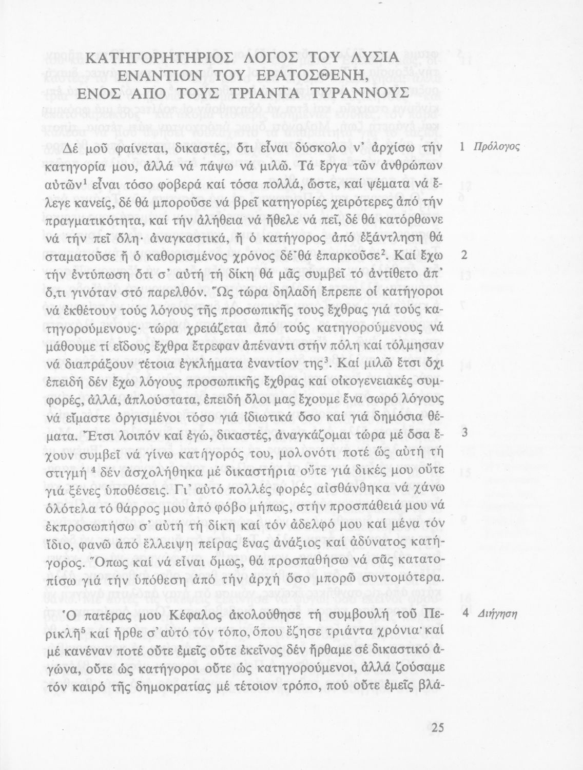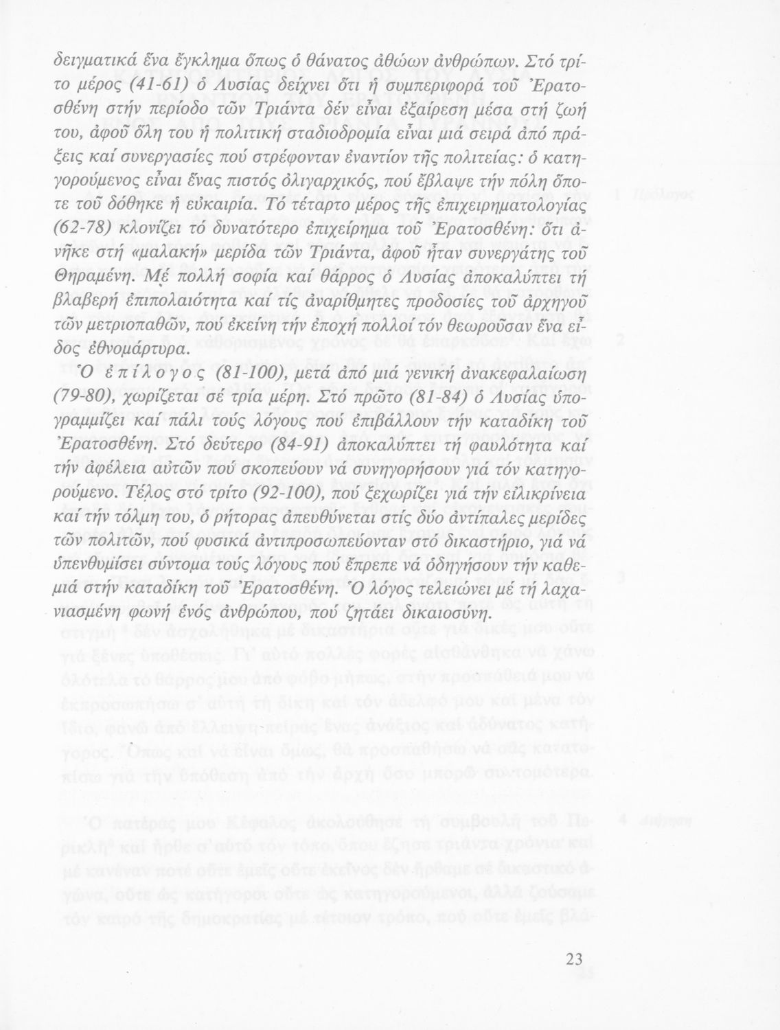 Σχολικό εγχειρίδιο Αρχαίων Ελληνικών Β΄ Γυμνασίου που περιλαμβάνει εισαγωγή στη ρητορική, τη ζωή και το έργο του Λυσία, ο Λόγος του Εναντίον του Ερατοσθένη σε μετάφραση και ερμηνευτικές σημειώσεις. Περιέχει και παράρτημα με αποσπάσματα από τα Ελληνικά του Ξενοφώντα σε μετάφραση.