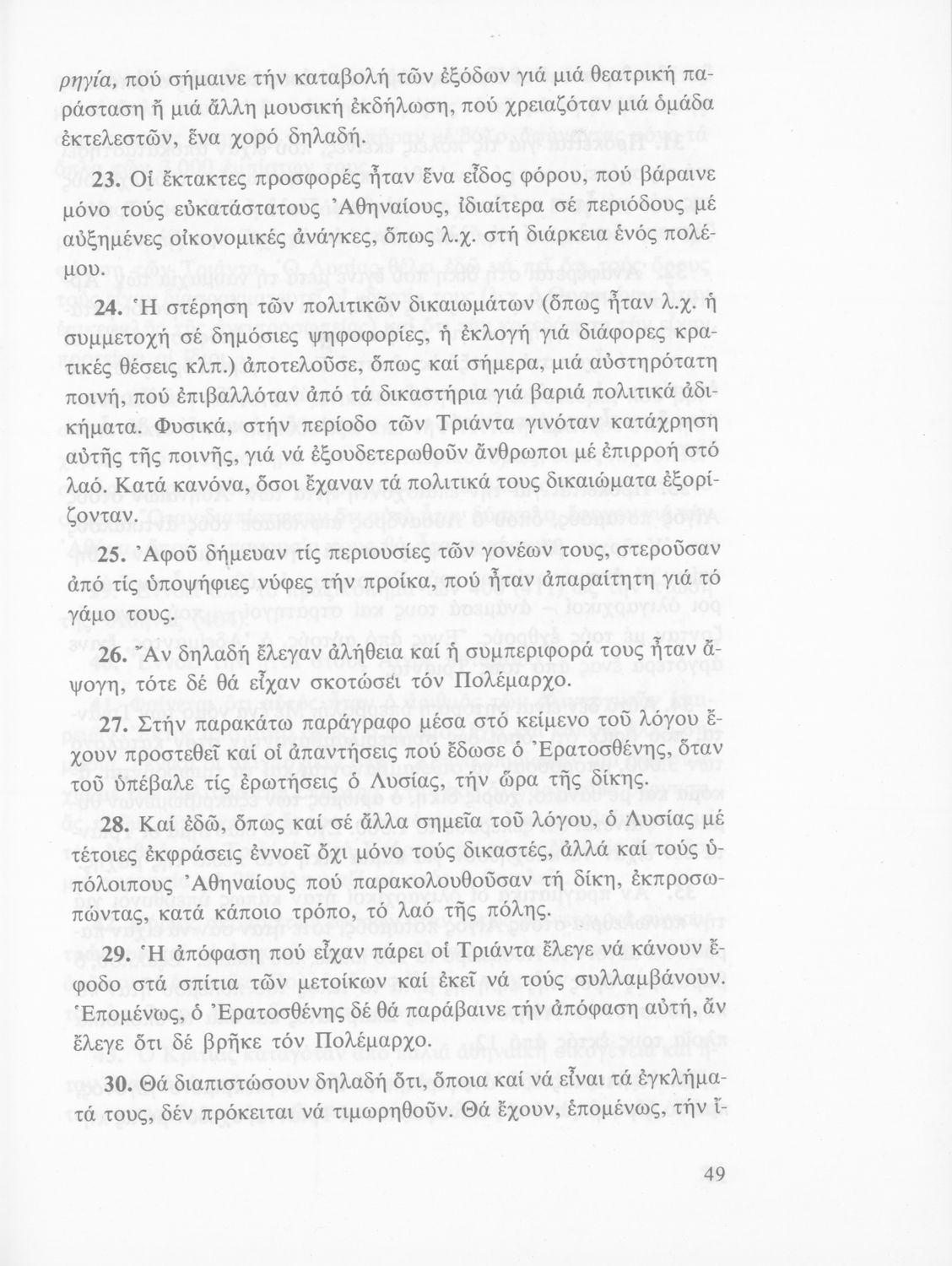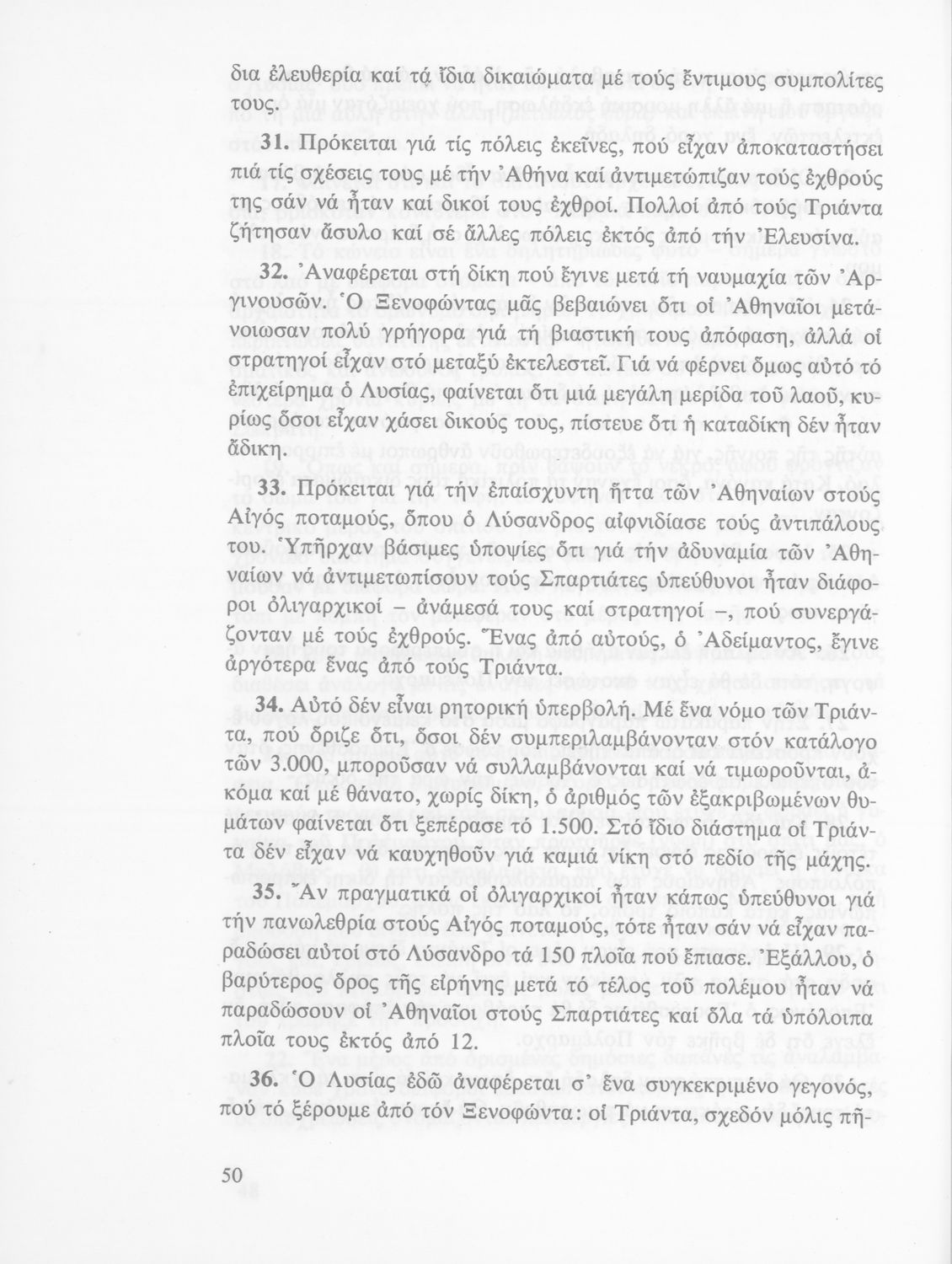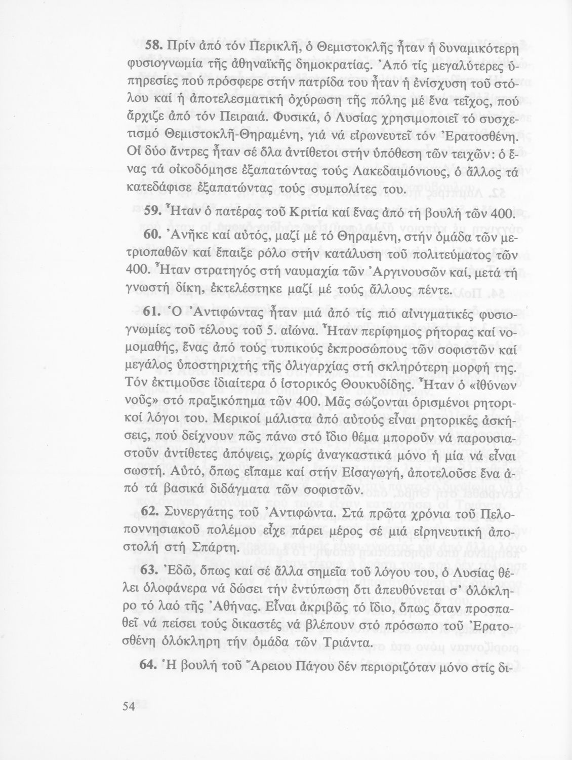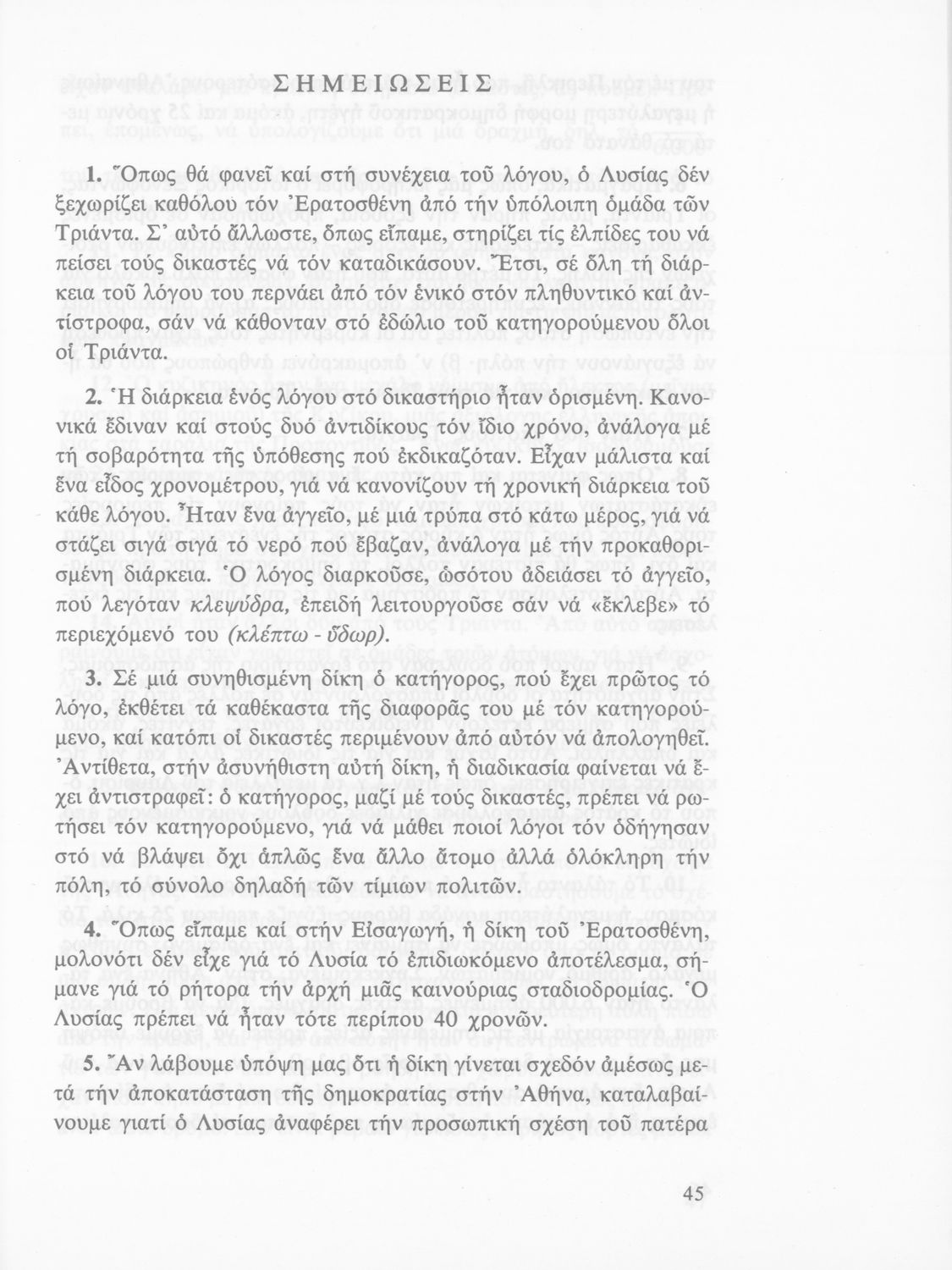 Σχολικό εγχειρίδιο Αρχαίων Ελληνικών Β΄ Γυμνασίου που περιλαμβάνει εισαγωγή στη ρητορική, τη ζωή και το έργο του Λυσία, ο Λόγος του Εναντίον του Ερατοσθένη σε μετάφραση και ερμηνευτικές σημειώσεις. Περιέχει και παράρτημα με αποσπάσματα από τα Ελληνικά του Ξενοφώντα σε μετάφραση.