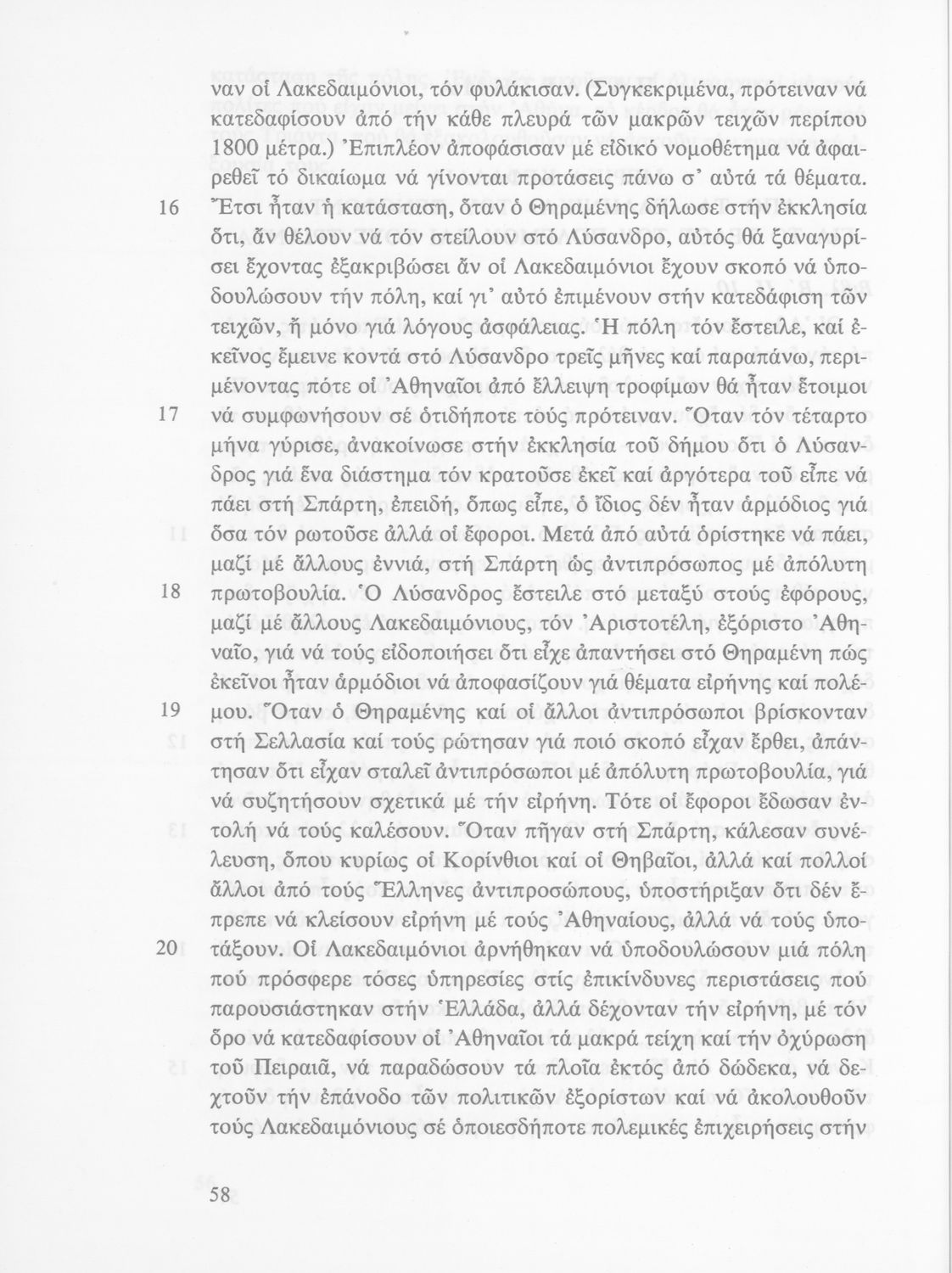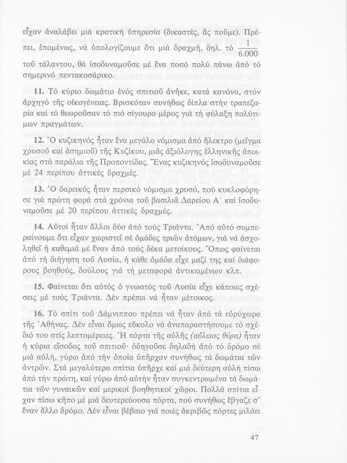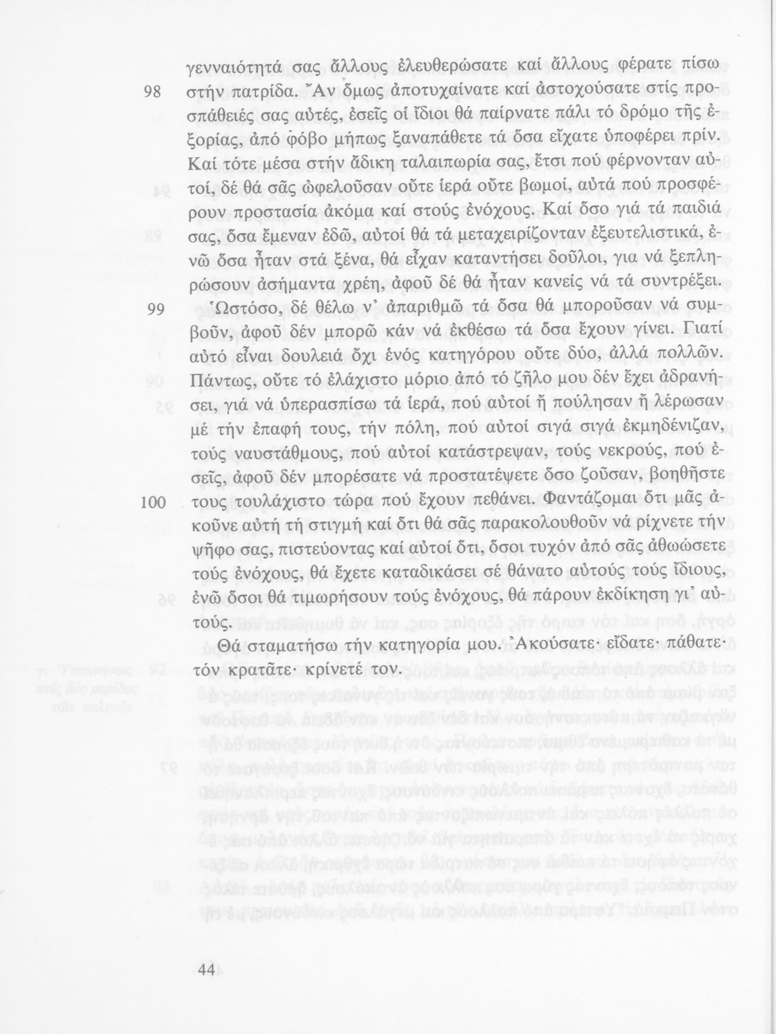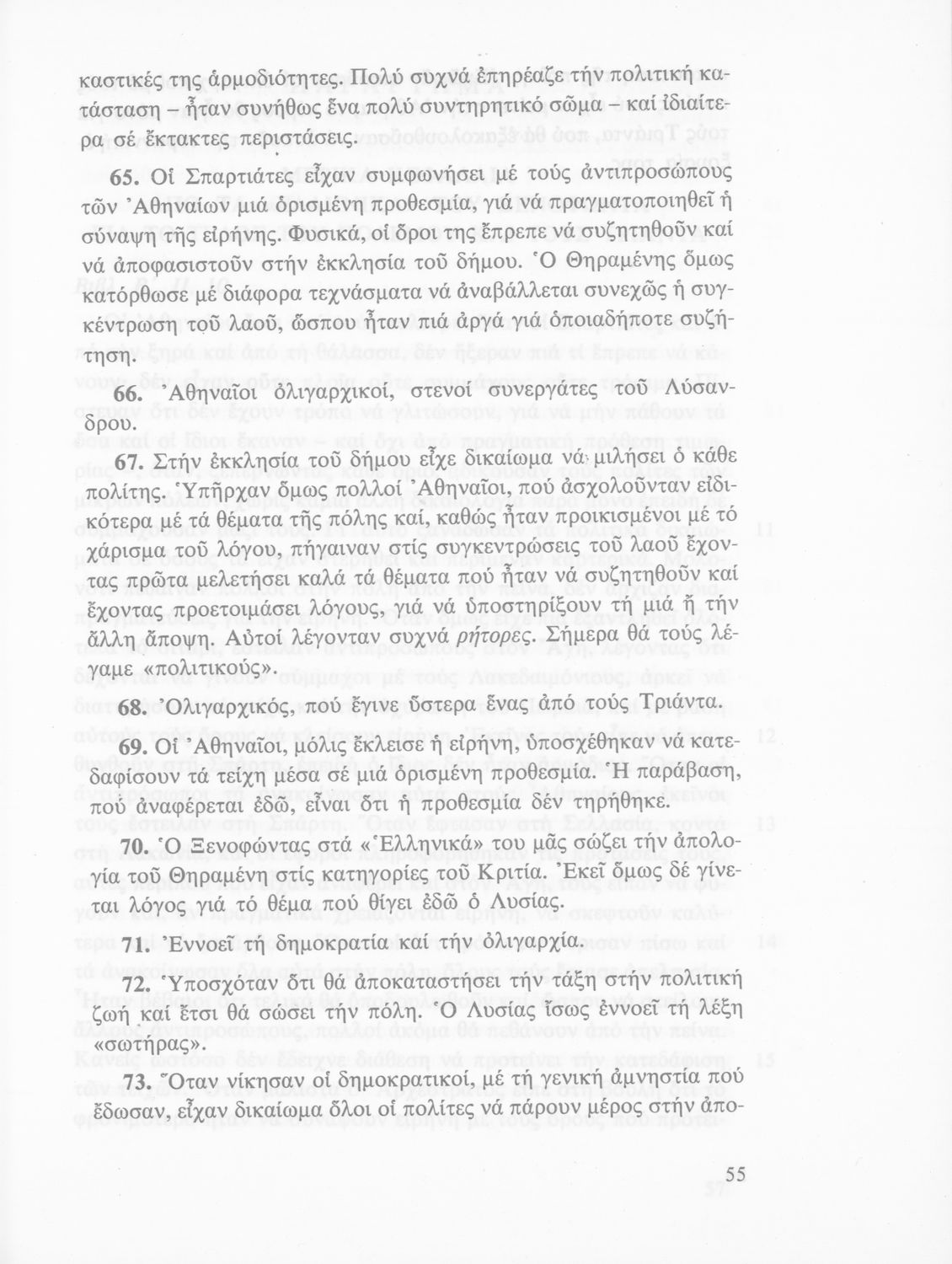 Σχολικό εγχειρίδιο Αρχαίων Ελληνικών Β΄ Γυμνασίου που περιλαμβάνει εισαγωγή στη ρητορική, τη ζωή και το έργο του Λυσία, ο Λόγος του Εναντίον του Ερατοσθένη σε μετάφραση και ερμηνευτικές σημειώσεις. Περιέχει και παράρτημα με αποσπάσματα από τα Ελληνικά του Ξενοφώντα σε μετάφραση.