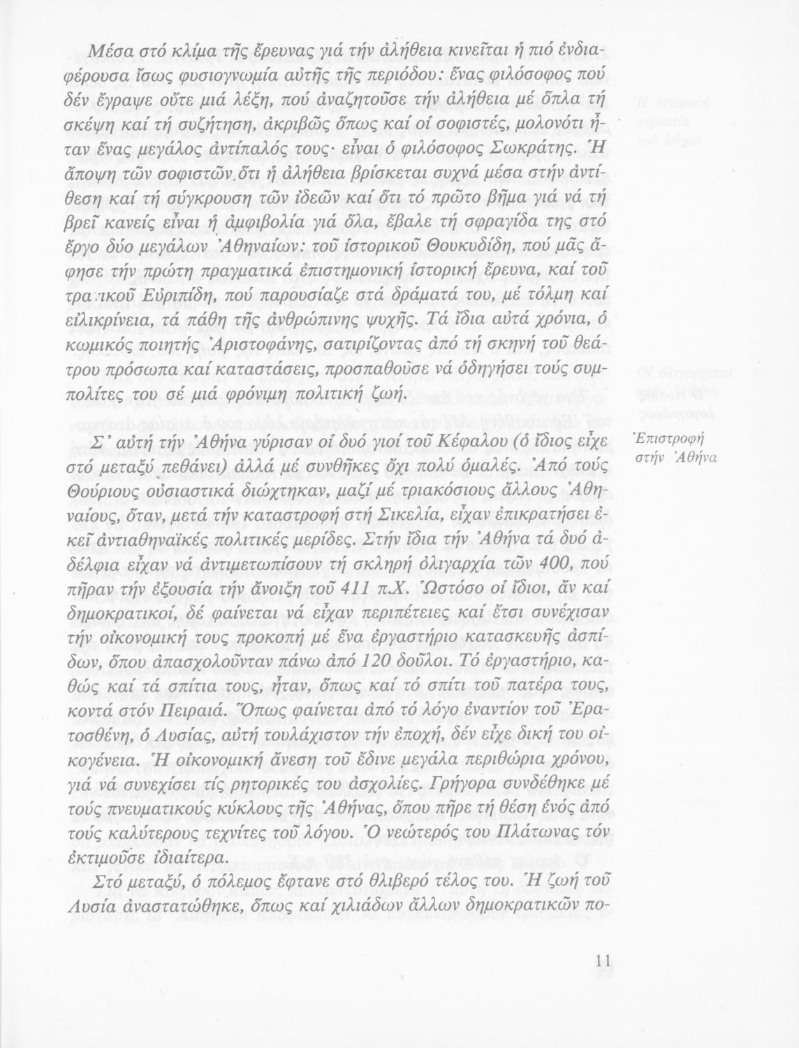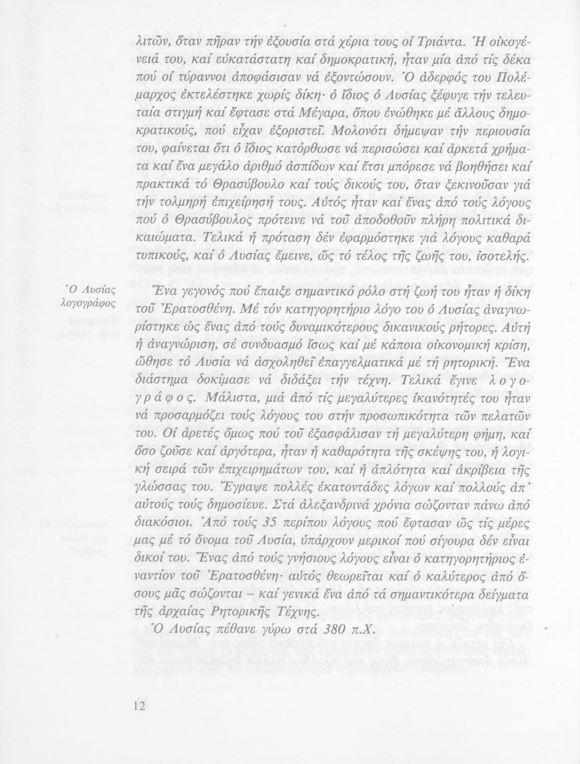 Σχολικό εγχειρίδιο Αρχαίων Ελληνικών Β΄ Γυμνασίου που περιλαμβάνει εισαγωγή στη ρητορική, τη ζωή και το έργο του Λυσία, ο Λόγος του Εναντίον του Ερατοσθένη σε μετάφραση και ερμηνευτικές σημειώσεις. Περιέχει και παράρτημα με αποσπάσματα από τα Ελληνικά του Ξενοφώντα σε μετάφραση.