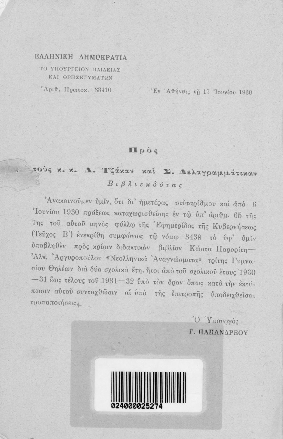 Τίτλος: Νεοελληνικά αναγνώσματα δια την τρίτην τάξιν του Γυμνασίου Θηλέων