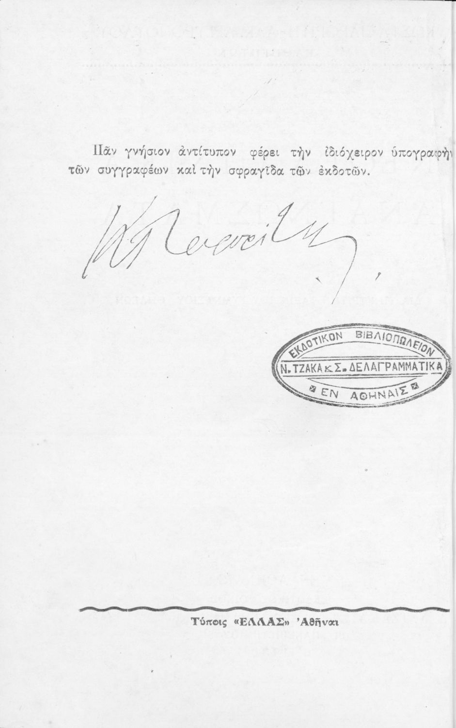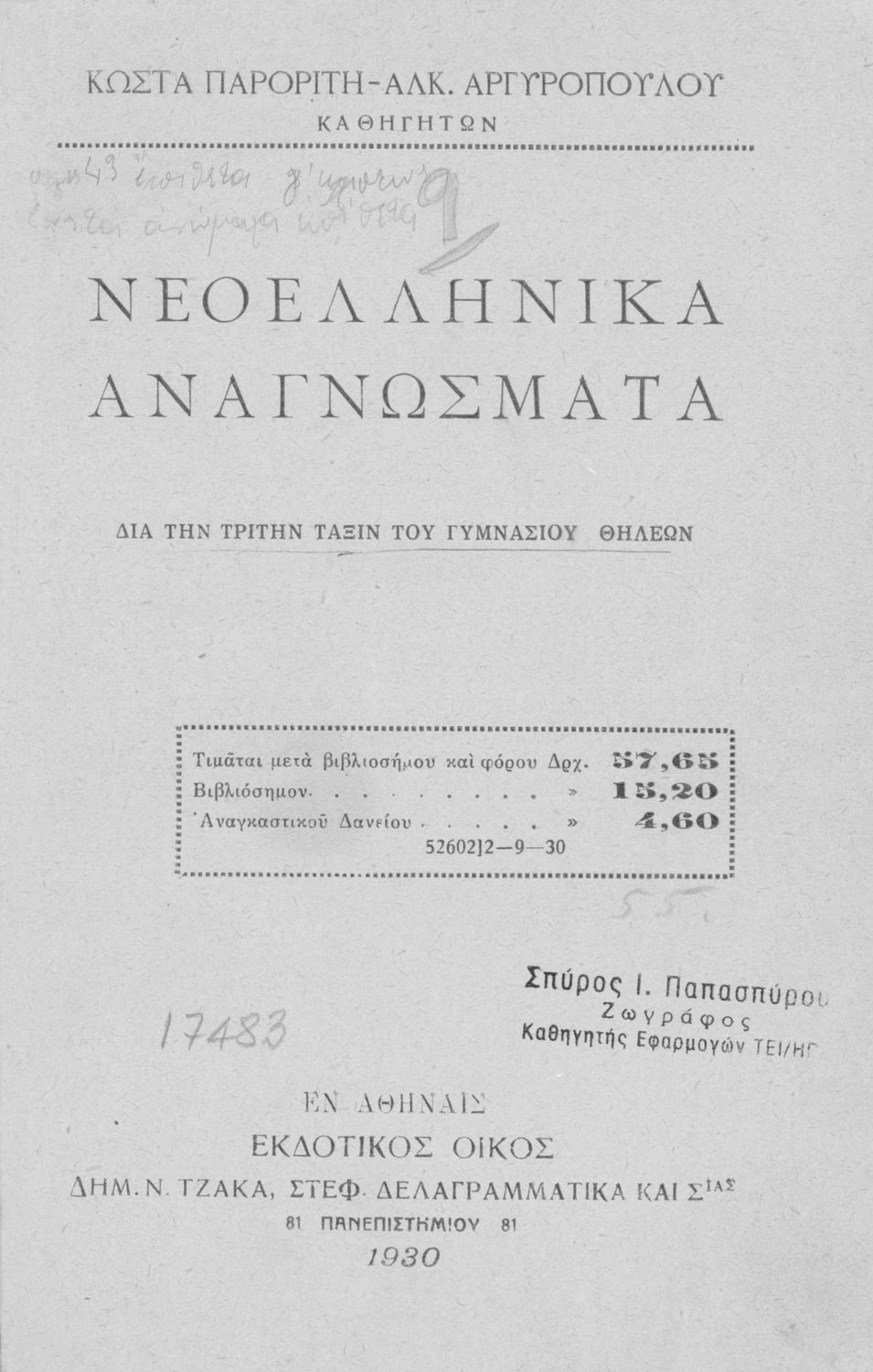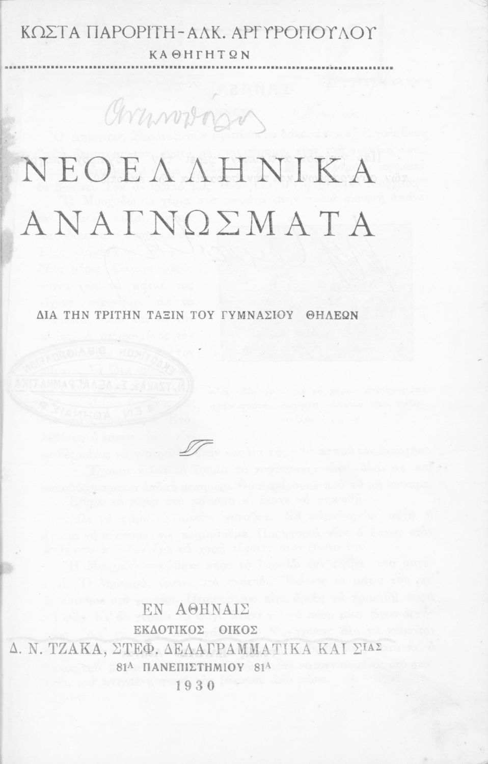 Εκδότης: Δημ. Ν. Τζάκας, Στεφ. Δελαγραμμάτικας και ΣΙΑ Έτος έκδοσης: 1930 Τόπος έκδοσης: Αθήνα Υπουργική απόφαση / Σύμβαση: 33410/17-6-1930 Έτος έγκρισης: 1930 |