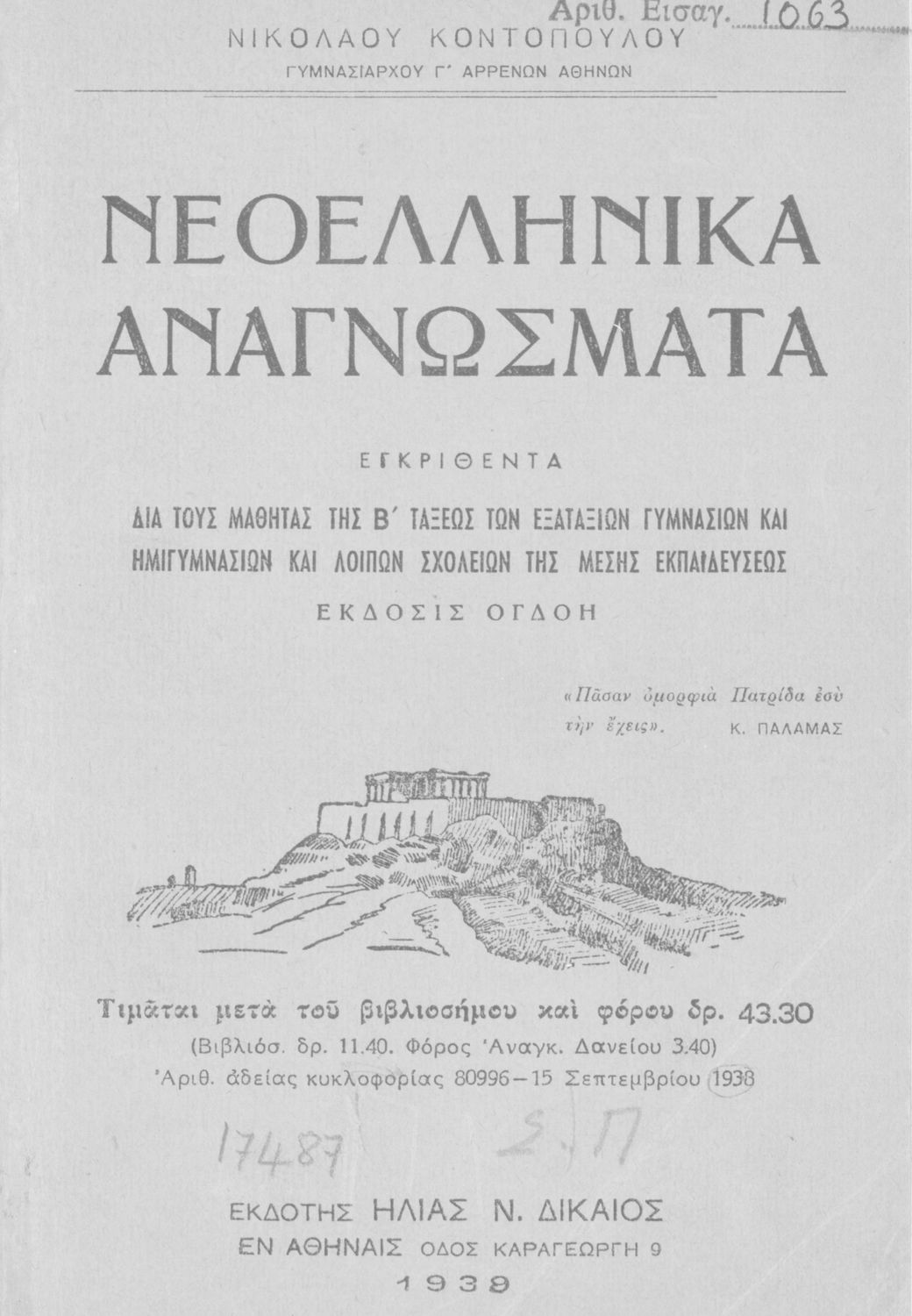 Τίτλος: Νεοελληνικά αναγνώσματα διά τους μαθητάς της Β΄ τάξεως των Εξαταξίων Γυμνασίων και Ημιγυμνασίων και των λοιπών σχολείων της Μέσης Εκπαιδεύσεως