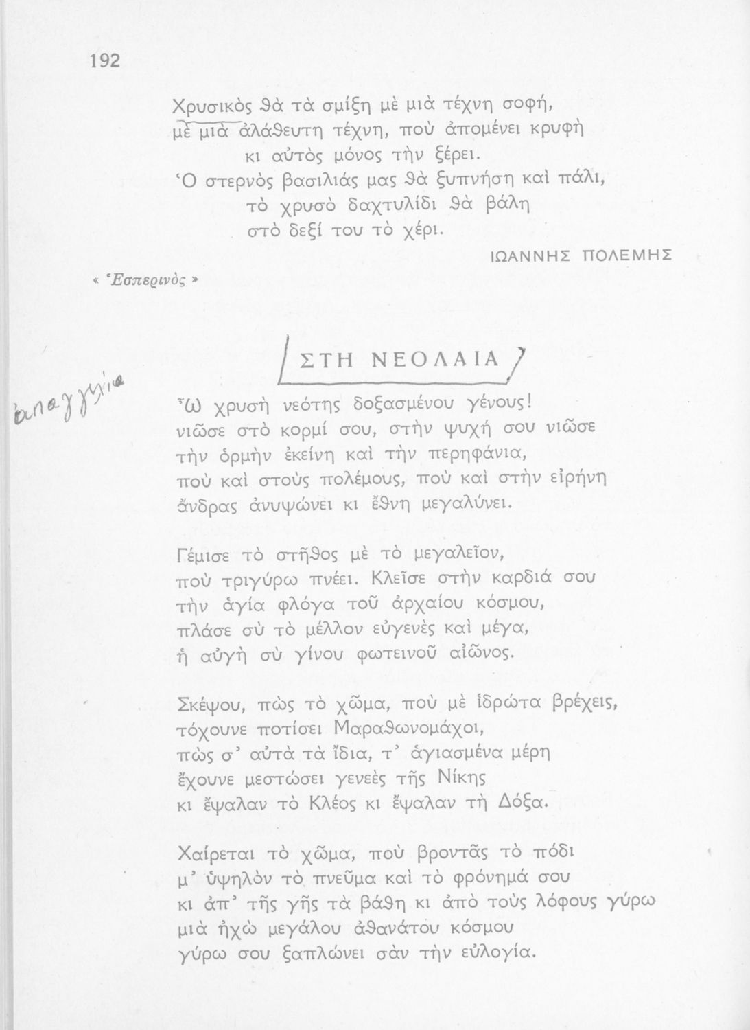 Βαθμίδα εκπαίδευσης: Δευτεροβάθμια Τάξη: Ε' Γυμνασίου παλαιού τύπου Μάθημα: Νέα Ελληνικά Γλώσσα: Καθαρεύουσα / Δημοτική Παρουσίαση περιεχομένου: Σχολικό εγχειρίδιο Νέων Ελληνικών Ε΄ Γυμνασίου που περιέχει πεζά και ποιήματα Ελλήνων συγγραφέων εμπνευσμένα από την καθημερινή ζωή και την σύγχρονη ελληνική ιστορία. Περιέχει και κλασσικά κείμενα ξένων λογοτεχνών, παράρτημα με βιογραφίες των συγγραφέων και λεξιλόγιο. |