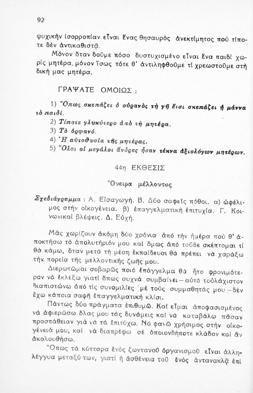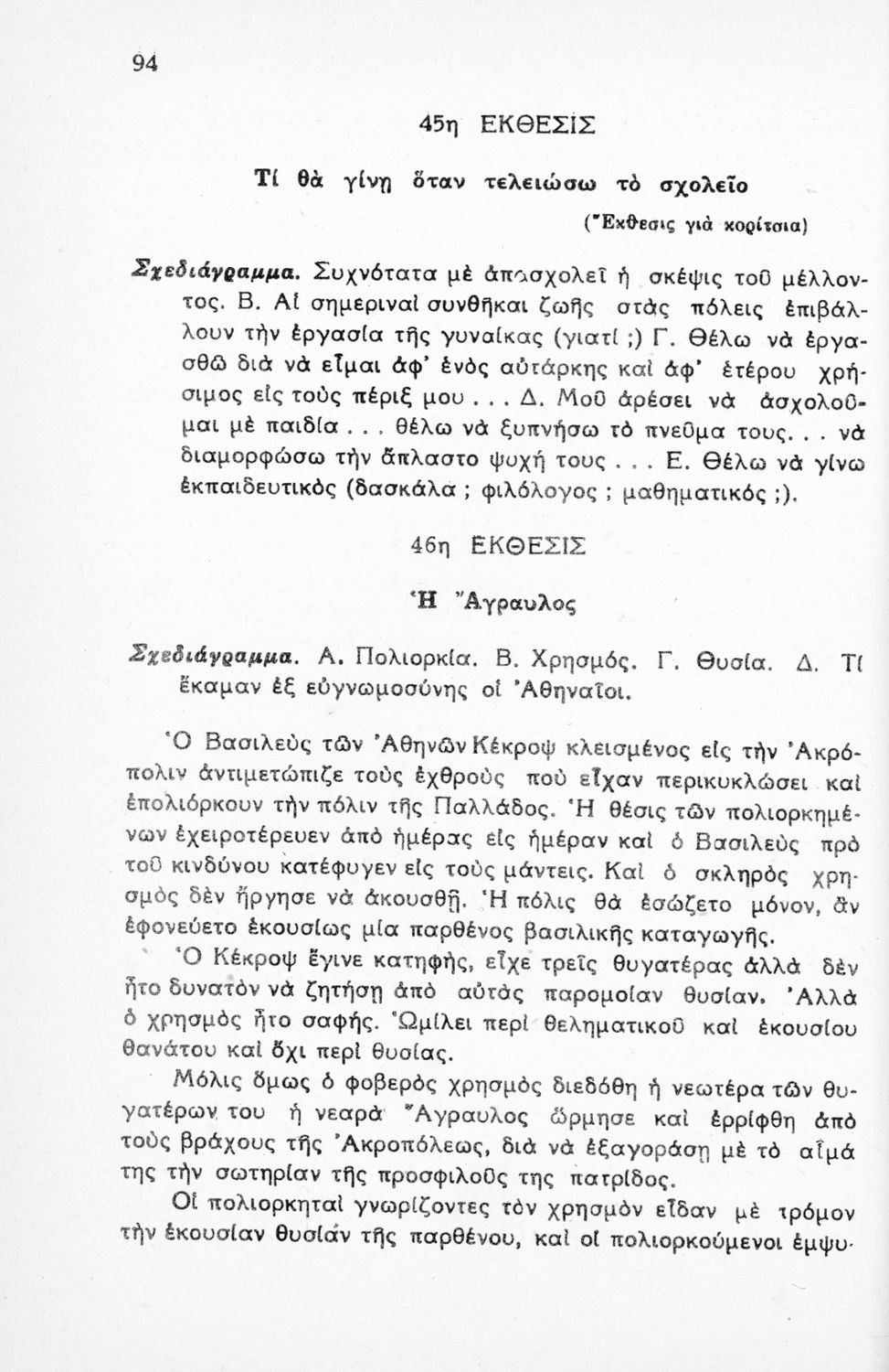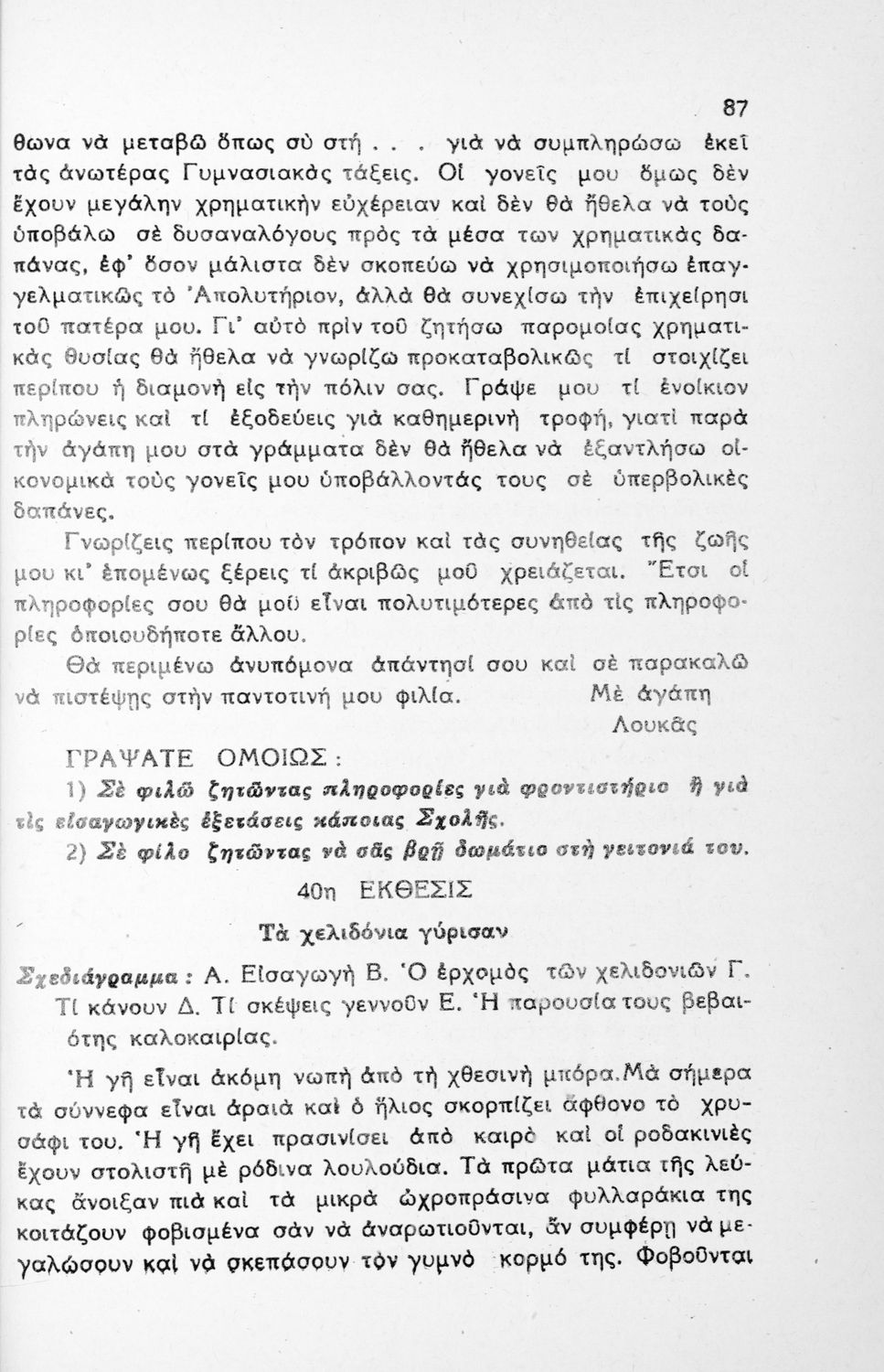 Μαθητικό βοήθημα Νέων Ελληνικών για τις Γ΄, Δ΄, Ε΄ Εξαταξίων Γυμνασίων και Εμπορικών Σχολών που περιλαμβάνει υποδείγματα εκθέσεων, περιγραφές, διηγήσεις, επιστολές, αναλύσεις λογοτεχνικών έργων, σχεδιαγράμματα και θέματα εκθέσεων.
