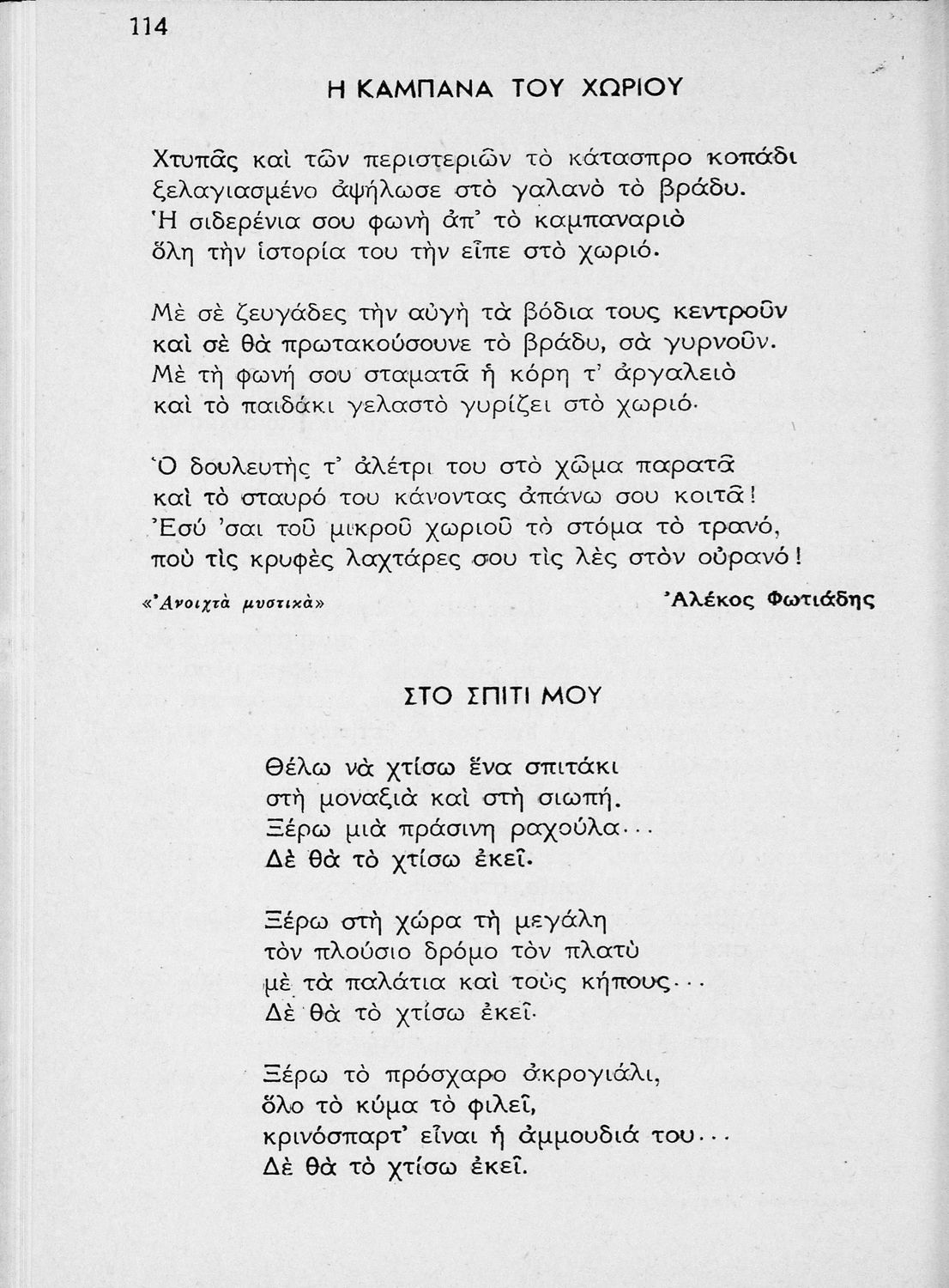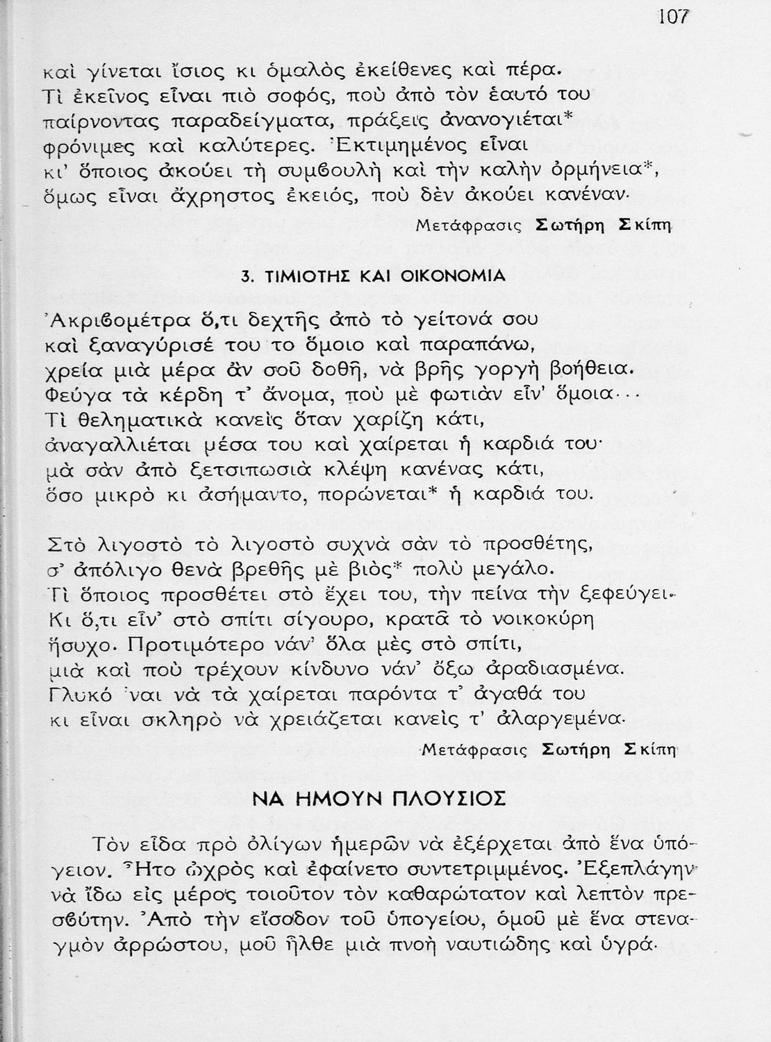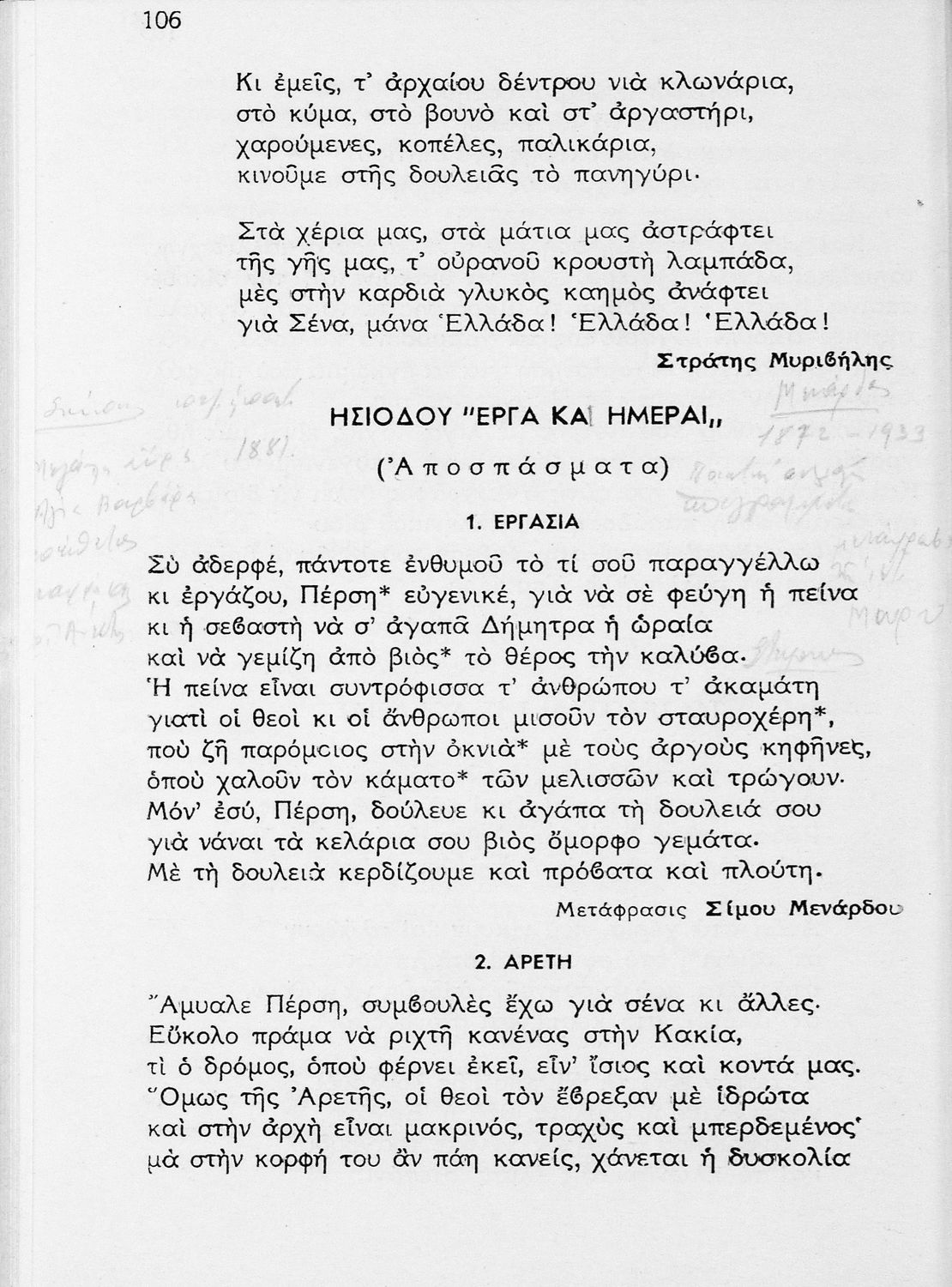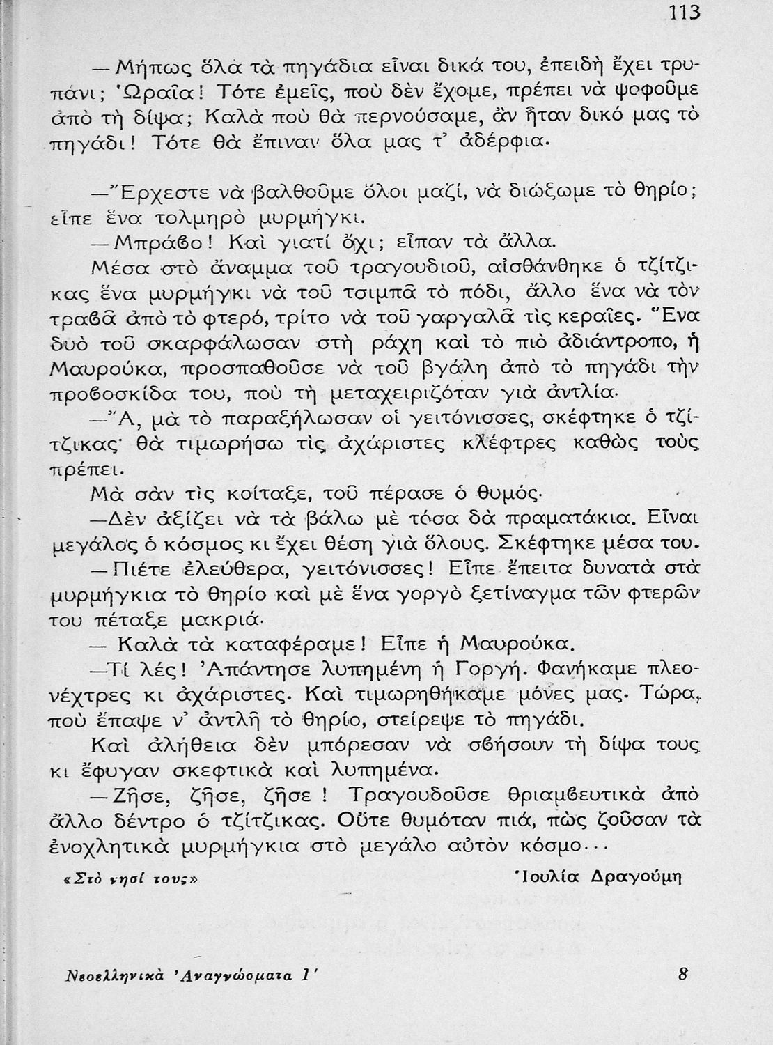 Σχολικό εγχειρίδιο Νέων Ελληνικών Γ΄ Γυμνασίου και Α' Αστικού Σχολείου που περιέχει πεζά και ποιήματα Ελλήνων συγγραφέων εμπνευσμένα από τη θρησκευτική και κοινωνική ζωή, την ελληνική μυθολογία, την αρχαία και σύγχρονη ελληνική ιστορία, και την ελληνική φύση. Περιέχει παράρτημα με βιογραφίες των συγγραφέων και λεξιλόγιο.