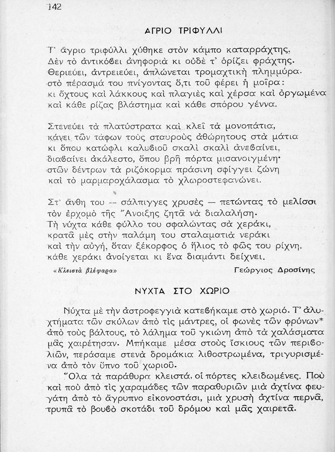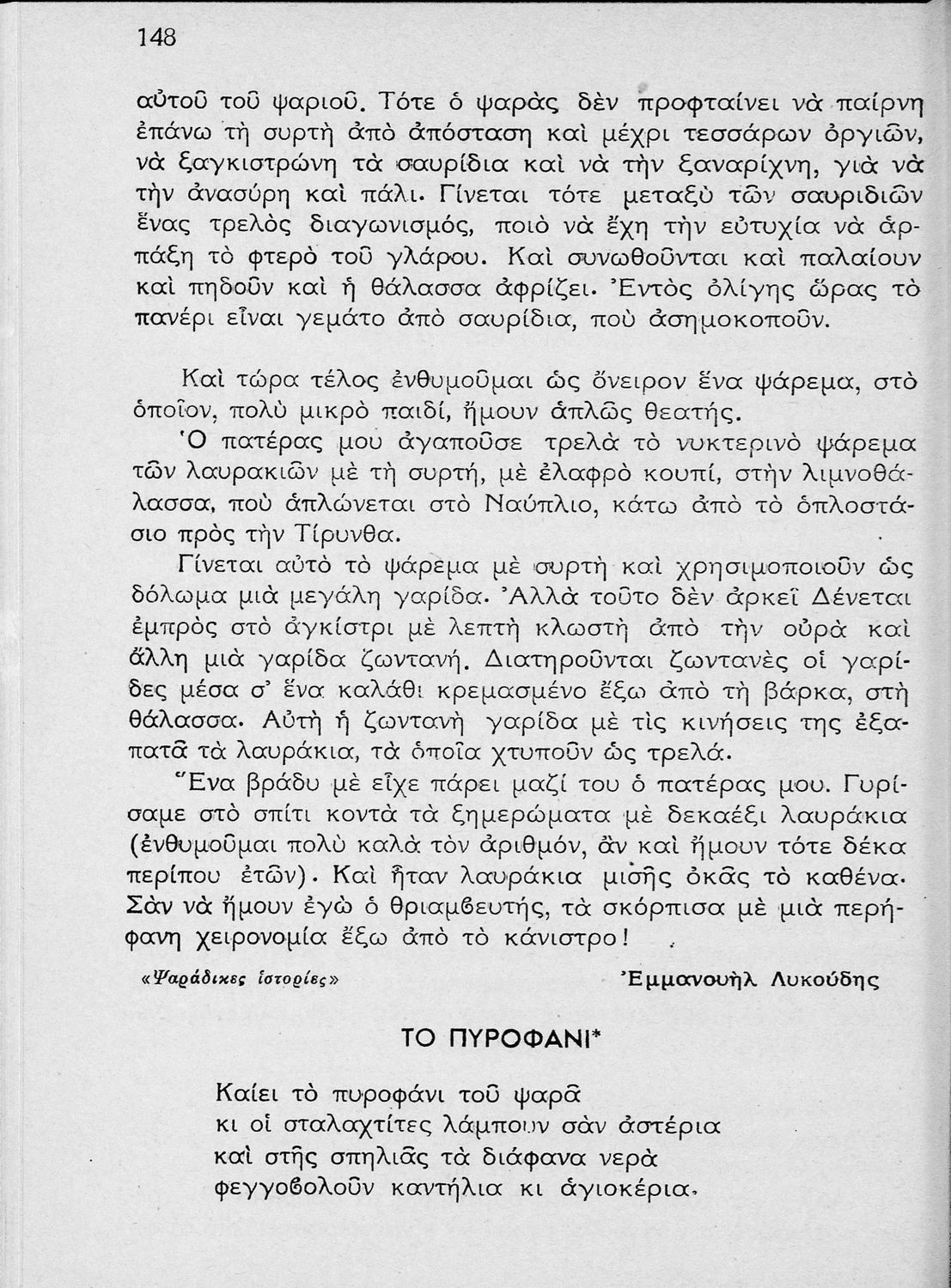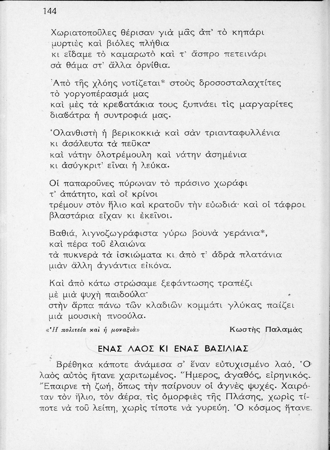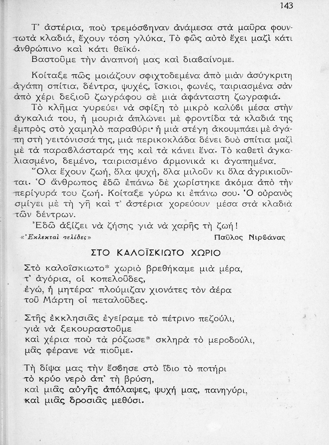 Σχολικό εγχειρίδιο Νέων Ελληνικών Γ΄ Γυμνασίου και Α' Αστικού Σχολείου που περιέχει πεζά και ποιήματα Ελλήνων συγγραφέων εμπνευσμένα από τη θρησκευτική και κοινωνική ζωή, την ελληνική μυθολογία, την αρχαία και σύγχρονη ελληνική ιστορία, και την ελληνική φύση. Περιέχει παράρτημα με βιογραφίες των συγγραφέων και λεξιλόγιο.