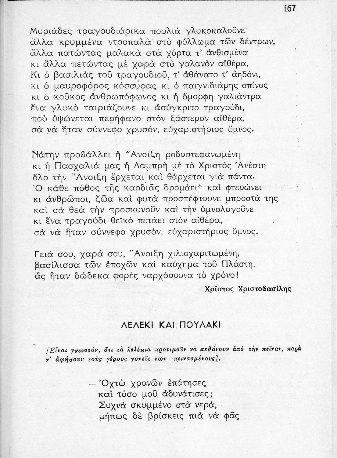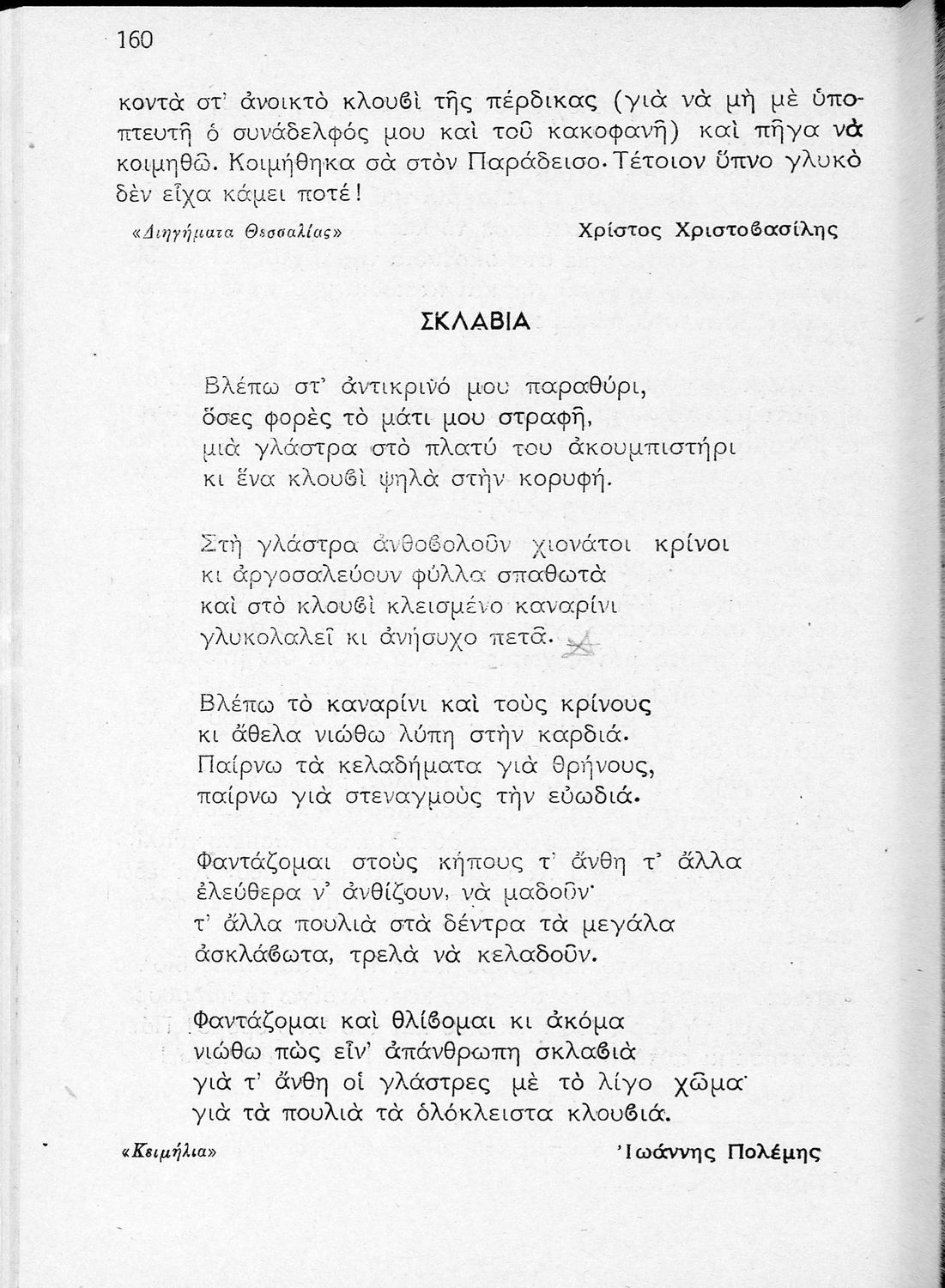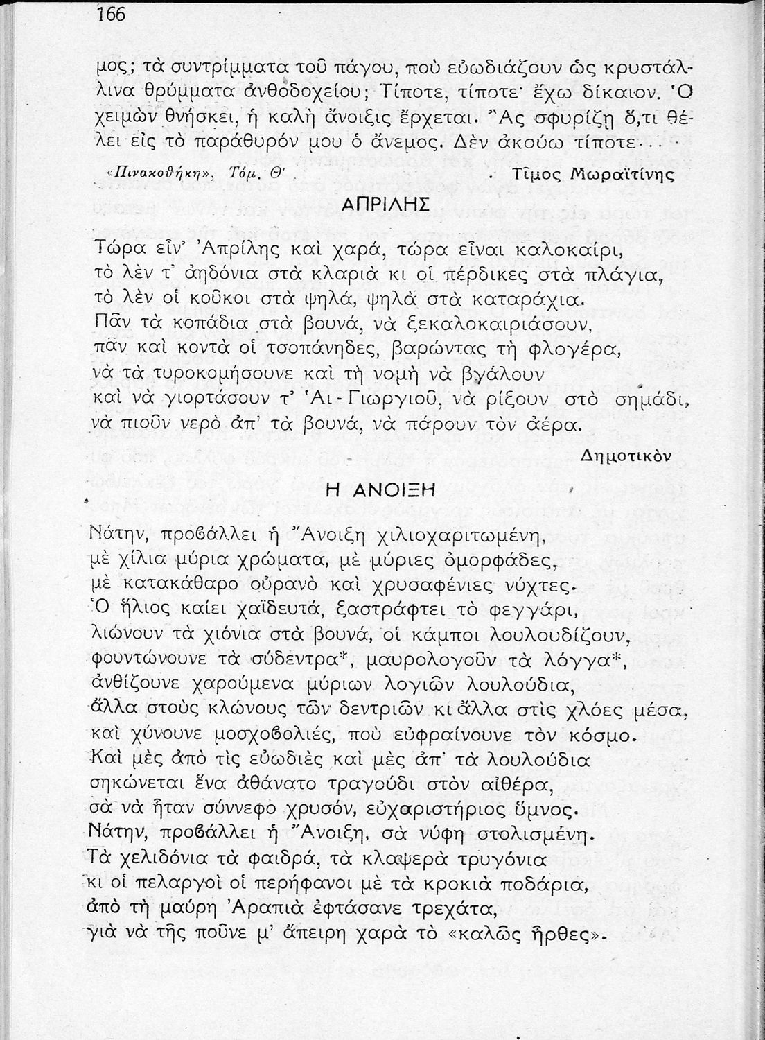 Σχολικό εγχειρίδιο Νέων Ελληνικών Γ΄ Γυμνασίου και Α' Αστικού Σχολείου που περιέχει πεζά και ποιήματα Ελλήνων συγγραφέων εμπνευσμένα από τη θρησκευτική και κοινωνική ζωή, την ελληνική μυθολογία, την αρχαία και σύγχρονη ελληνική ιστορία, και την ελληνική φύση. Περιέχει παράρτημα με βιογραφίες των συγγραφέων και λεξιλόγιο.