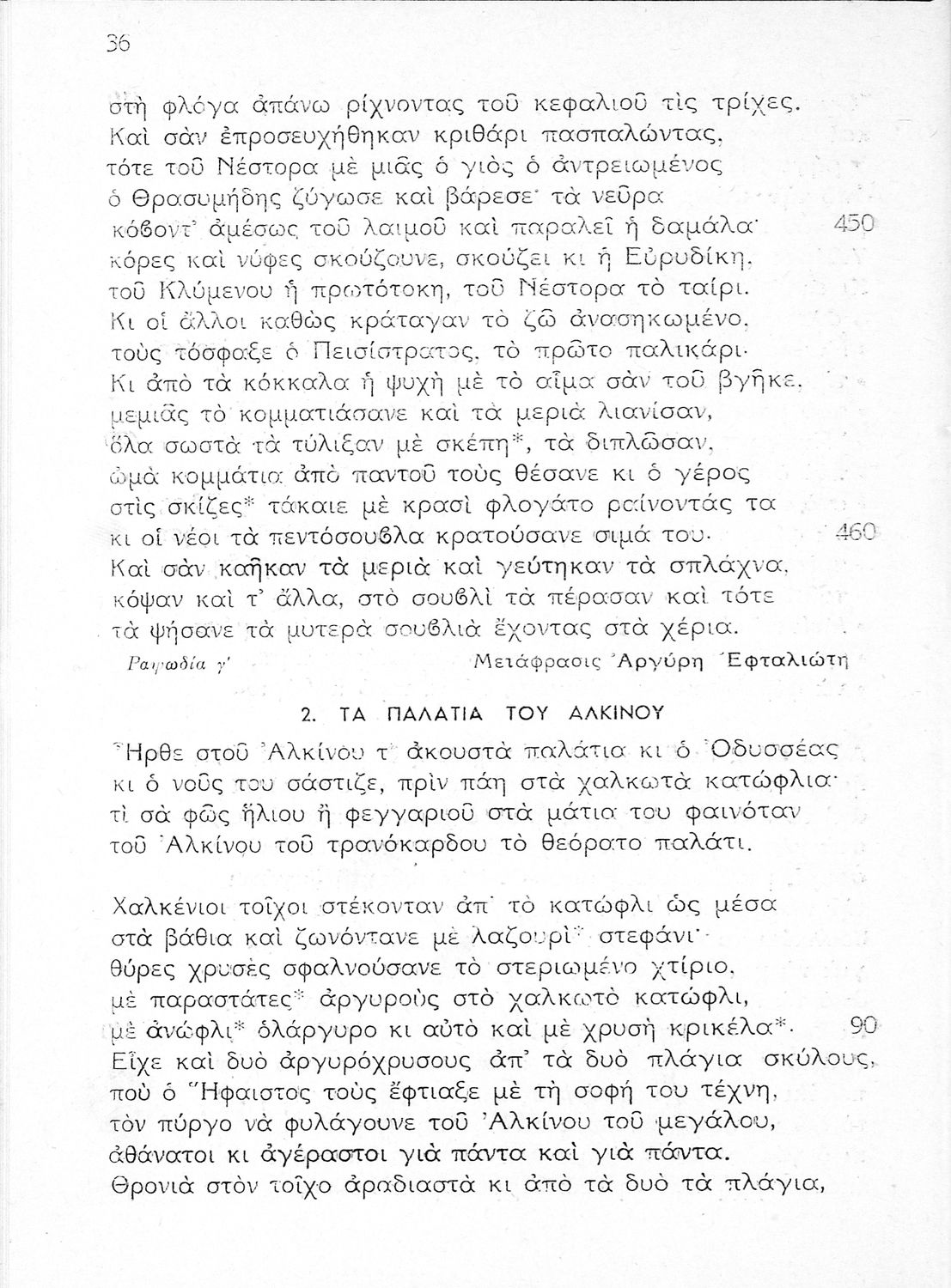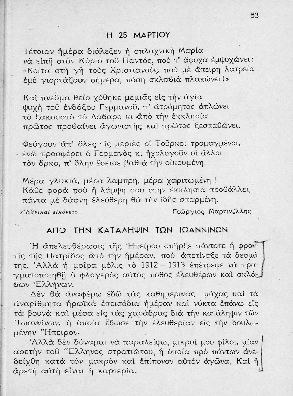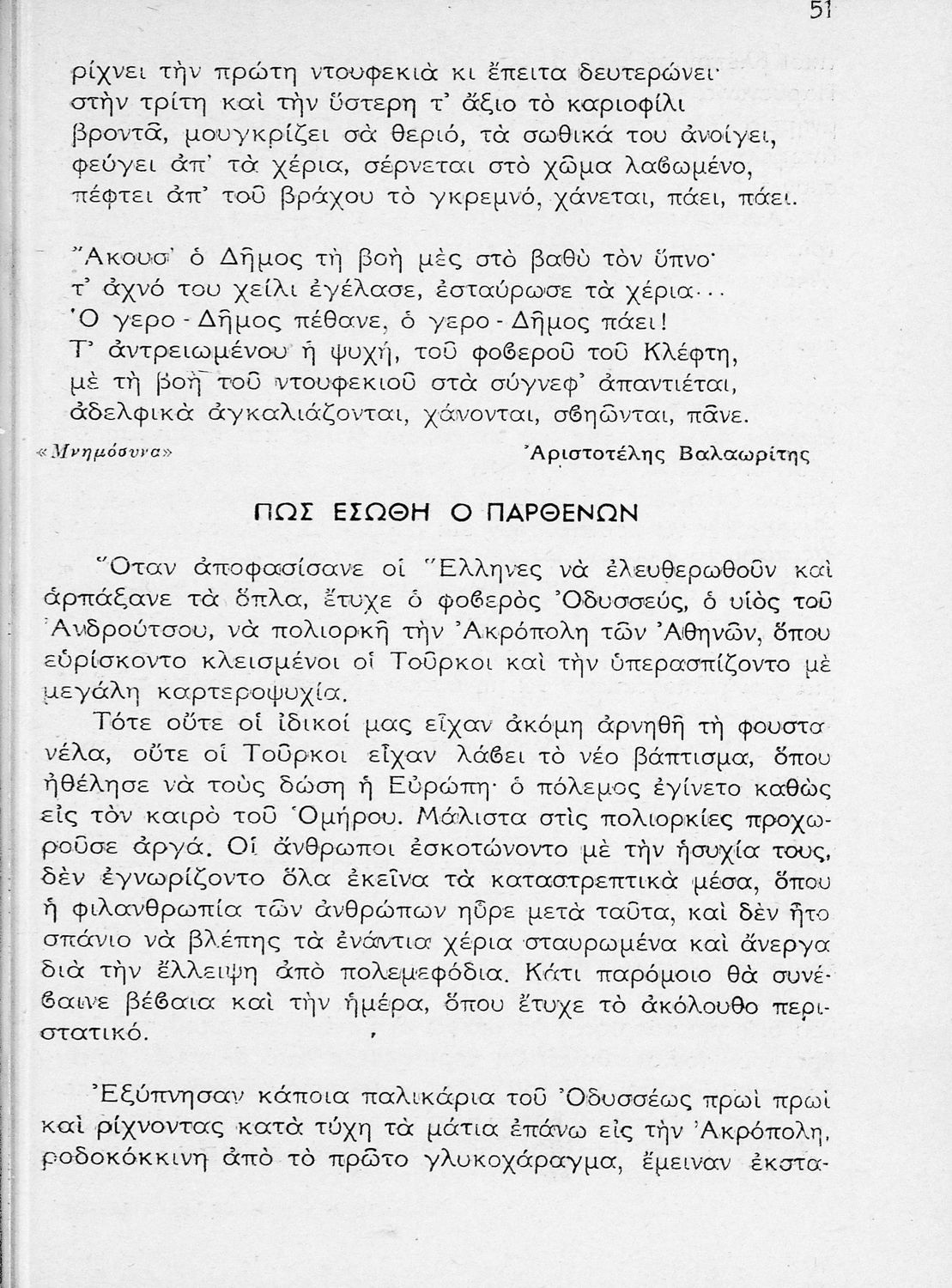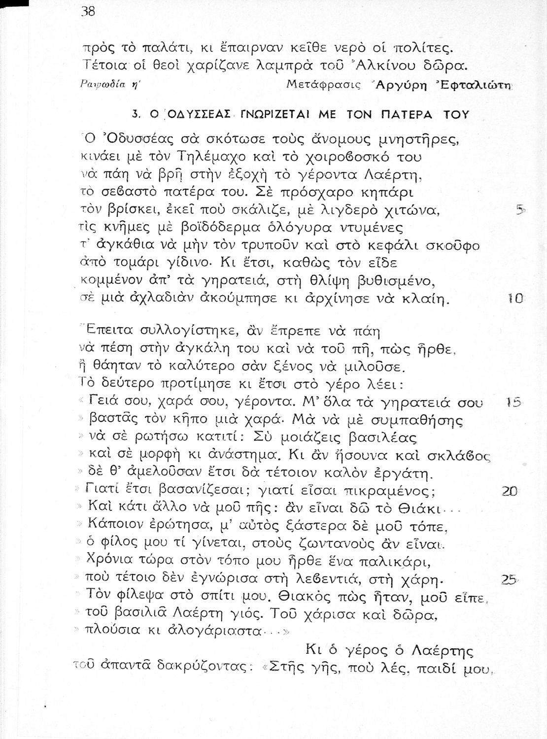 Σχολικό εγχειρίδιο Νέων Ελληνικών Γ΄ Γυμνασίου και Α' Αστικού Σχολείου που περιέχει πεζά και ποιήματα Ελλήνων συγγραφέων εμπνευσμένα από τη θρησκευτική και κοινωνική ζωή, την ελληνική μυθολογία, την αρχαία και σύγχρονη ελληνική ιστορία, και την ελληνική φύση. Περιέχει παράρτημα με βιογραφίες των συγγραφέων και λεξιλόγιο.
