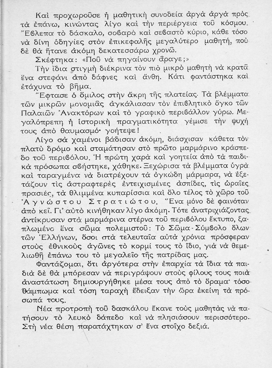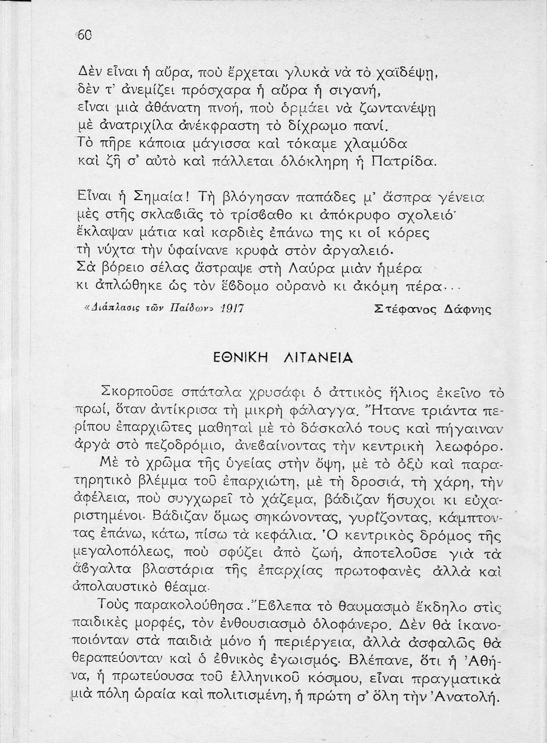 Σχολικό εγχειρίδιο Νέων Ελληνικών Γ΄ Γυμνασίου και Α' Αστικού Σχολείου που περιέχει πεζά και ποιήματα Ελλήνων συγγραφέων εμπνευσμένα από τη θρησκευτική και κοινωνική ζωή, την ελληνική μυθολογία, την αρχαία και σύγχρονη ελληνική ιστορία, και την ελληνική φύση. Περιέχει παράρτημα με βιογραφίες των συγγραφέων και λεξιλόγιο.