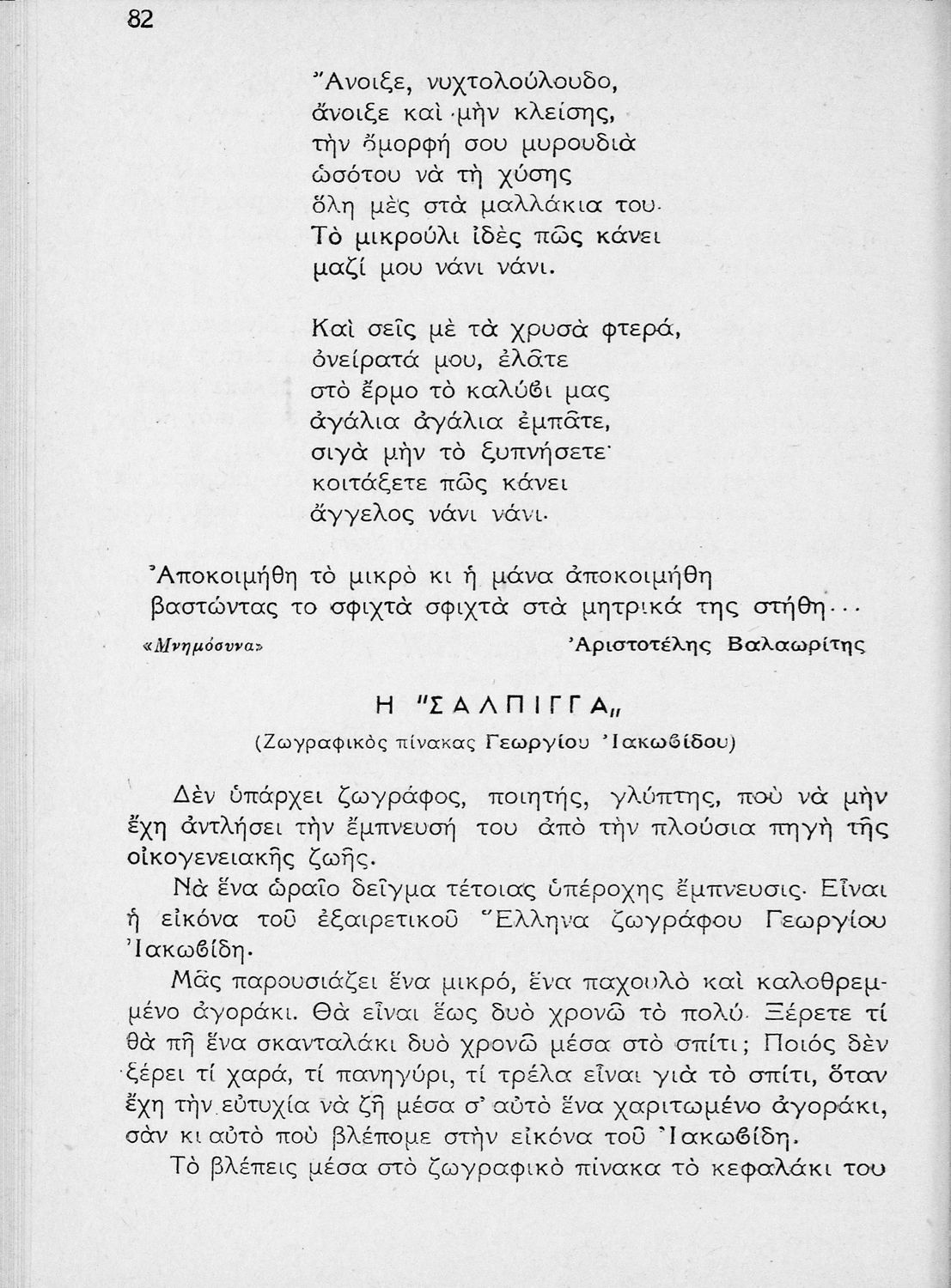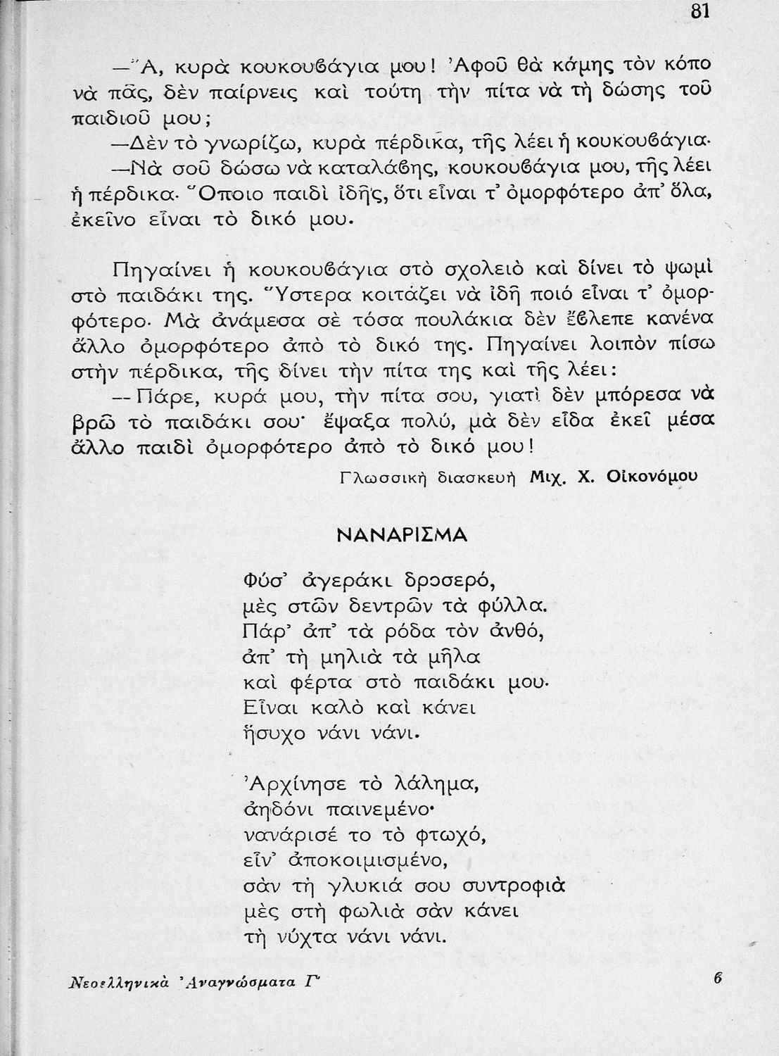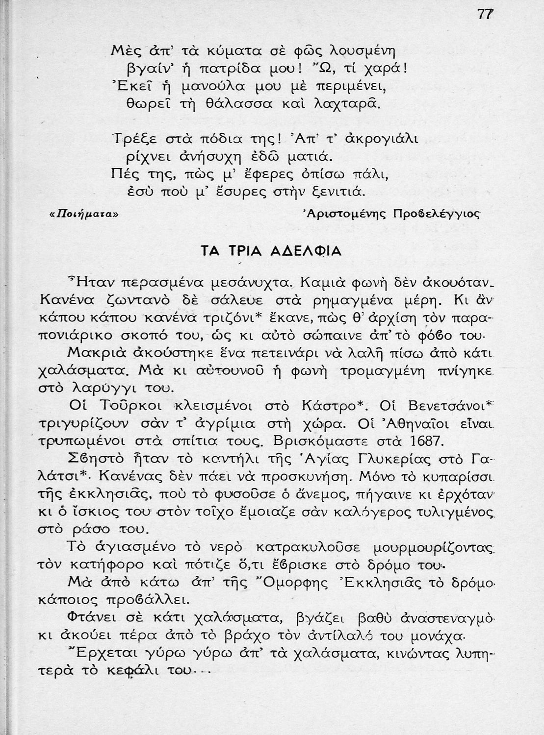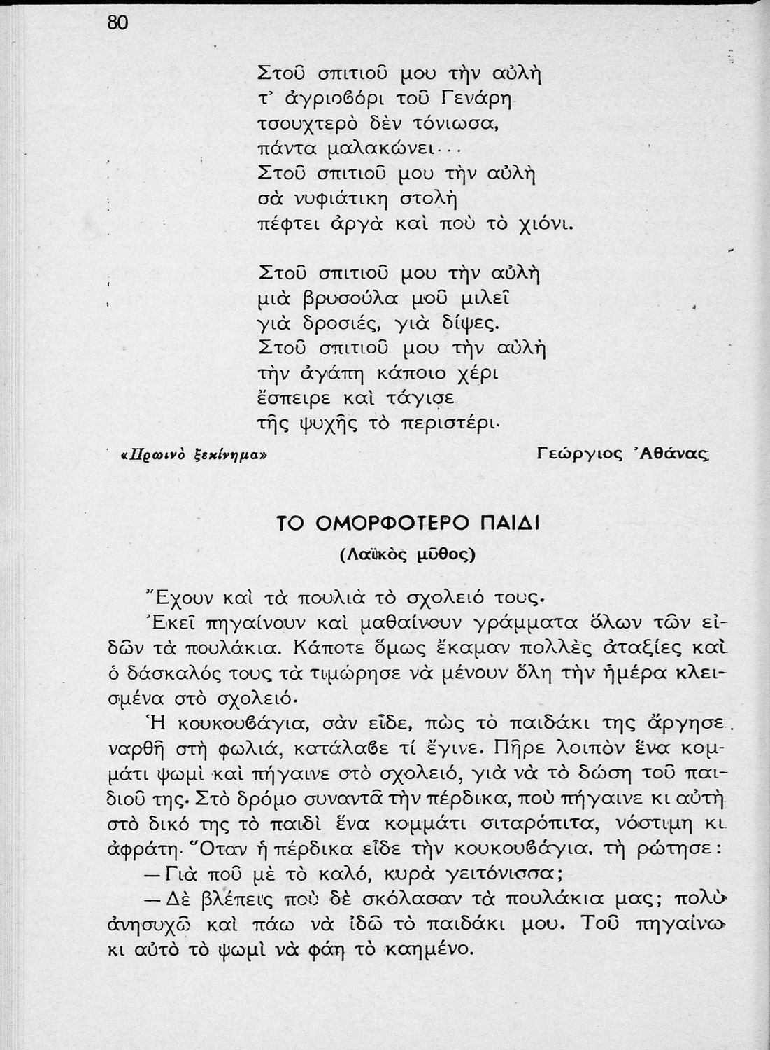 Σχολικό εγχειρίδιο Νέων Ελληνικών Γ΄ Γυμνασίου και Α' Αστικού Σχολείου που περιέχει πεζά και ποιήματα Ελλήνων συγγραφέων εμπνευσμένα από τη θρησκευτική και κοινωνική ζωή, την ελληνική μυθολογία, την αρχαία και σύγχρονη ελληνική ιστορία, και την ελληνική φύση. Περιέχει παράρτημα με βιογραφίες των συγγραφέων και λεξιλόγιο.