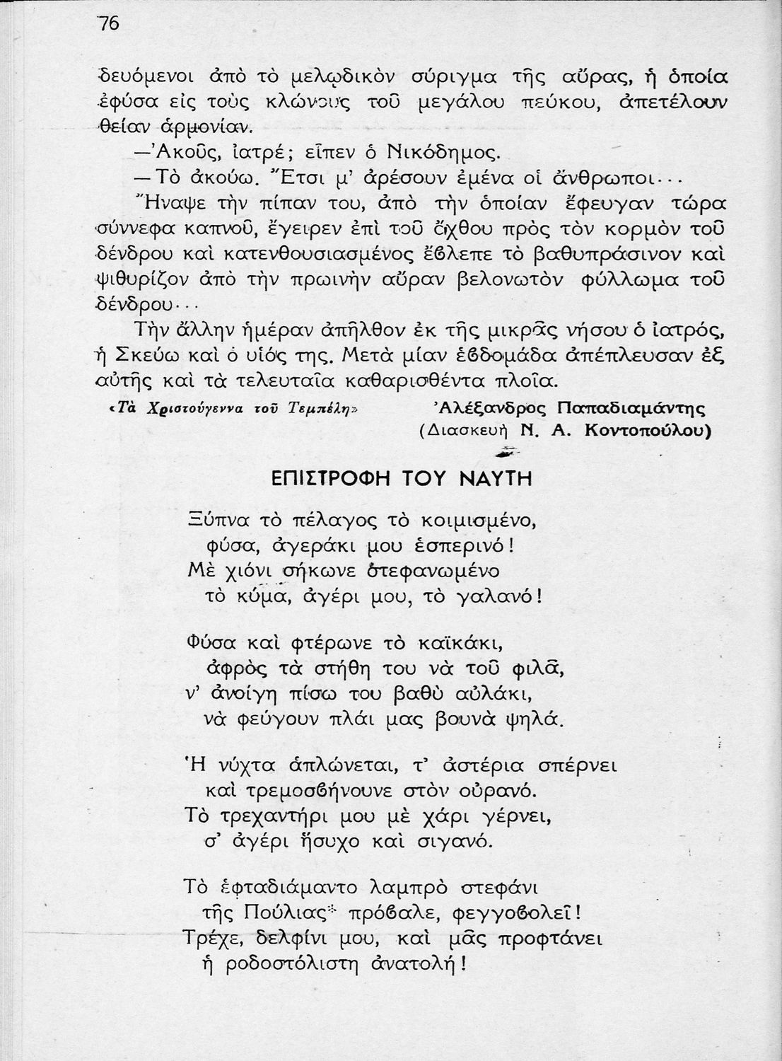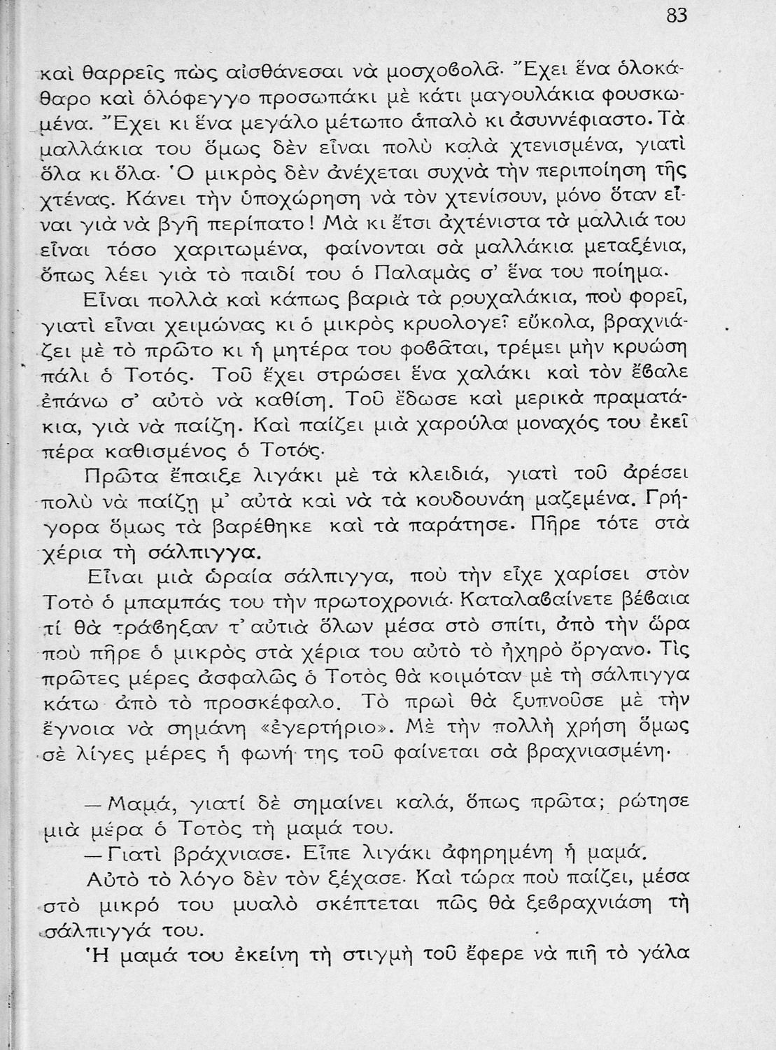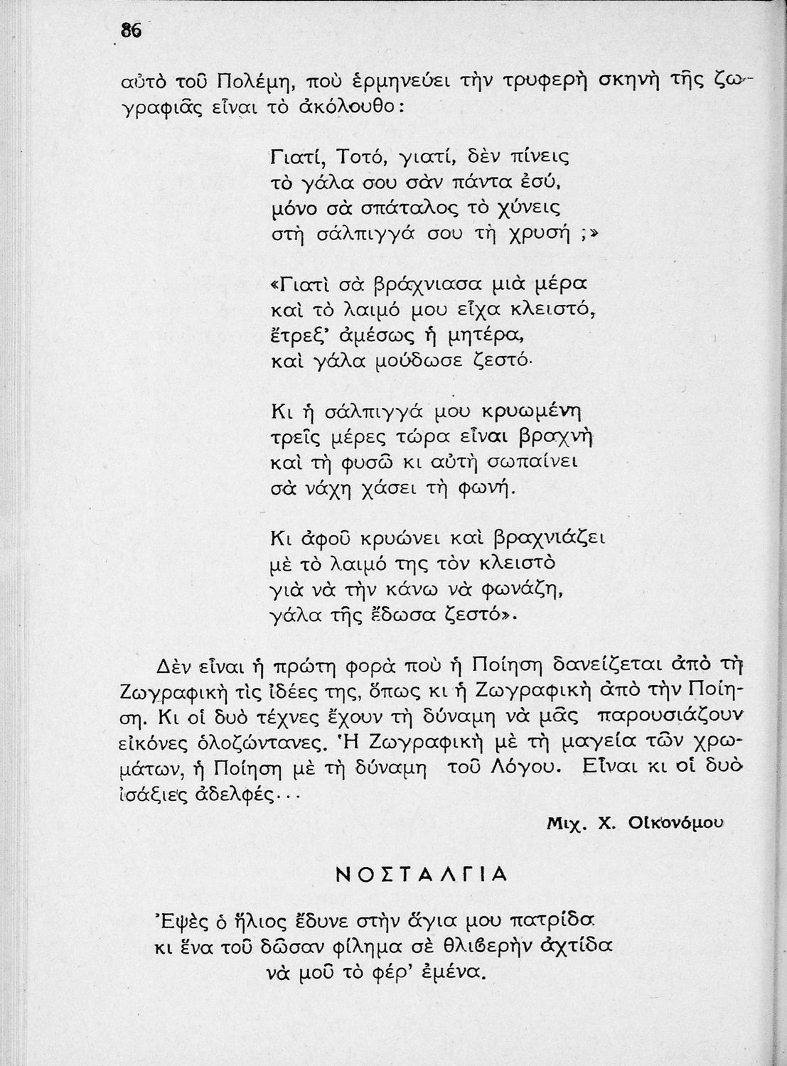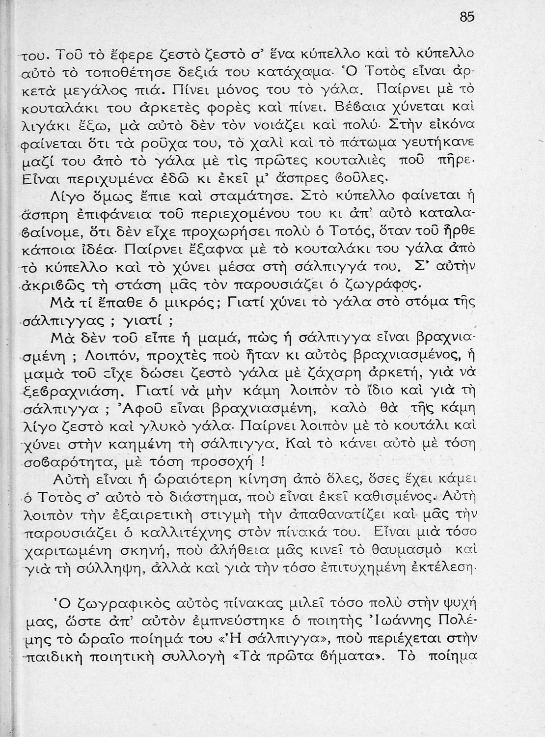 Σχολικό εγχειρίδιο Νέων Ελληνικών Γ΄ Γυμνασίου και Α' Αστικού Σχολείου που περιέχει πεζά και ποιήματα Ελλήνων συγγραφέων εμπνευσμένα από τη θρησκευτική και κοινωνική ζωή, την ελληνική μυθολογία, την αρχαία και σύγχρονη ελληνική ιστορία, και την ελληνική φύση. Περιέχει παράρτημα με βιογραφίες των συγγραφέων και λεξιλόγιο.