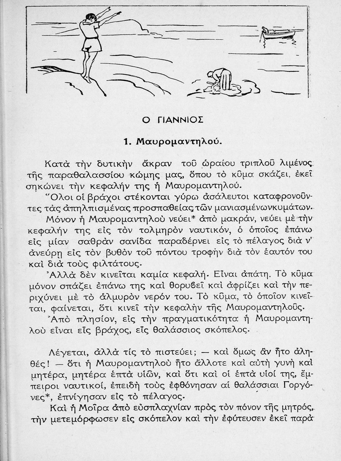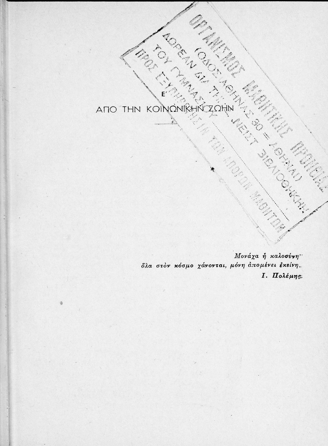 Σχολικό εγχειρίδιο Νέων Ελληνικών Γ΄ Γυμνασίου και Α' Αστικού Σχολείου που περιέχει πεζά και ποιήματα Ελλήνων συγγραφέων εμπνευσμένα από τη θρησκευτική και κοινωνική ζωή, την ελληνική μυθολογία, την αρχαία και