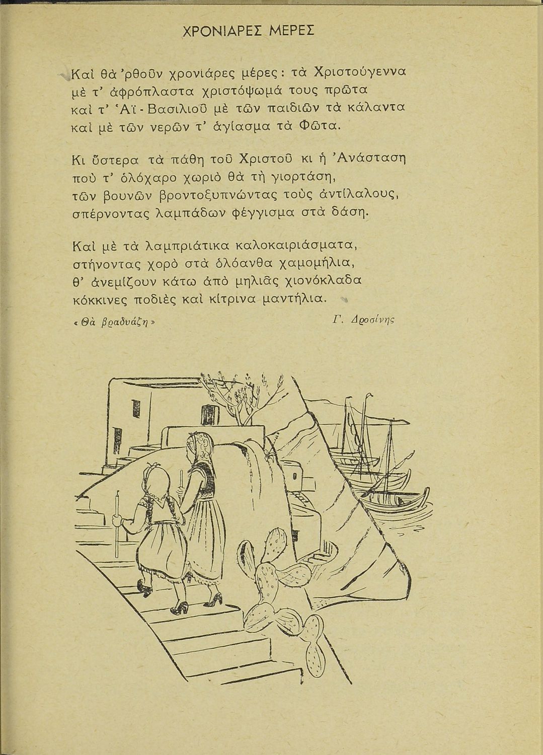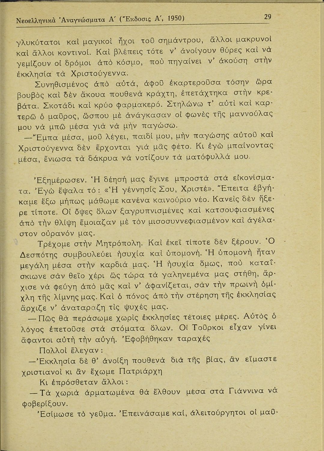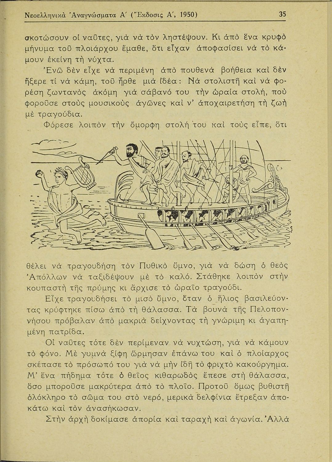 Σχολικό εγχειρίδιο Νέων Ελληνικών Γ΄ Γυμνασίου και Α' Αστικού Σχολείου που περιέχει πεζά και ποιήματα Ελλήνων συγγραφέων εμπνευσμένα από τη θρησκευτική και κοινωνική ζωή, την ελληνική μυθολογία, την αρχαία και