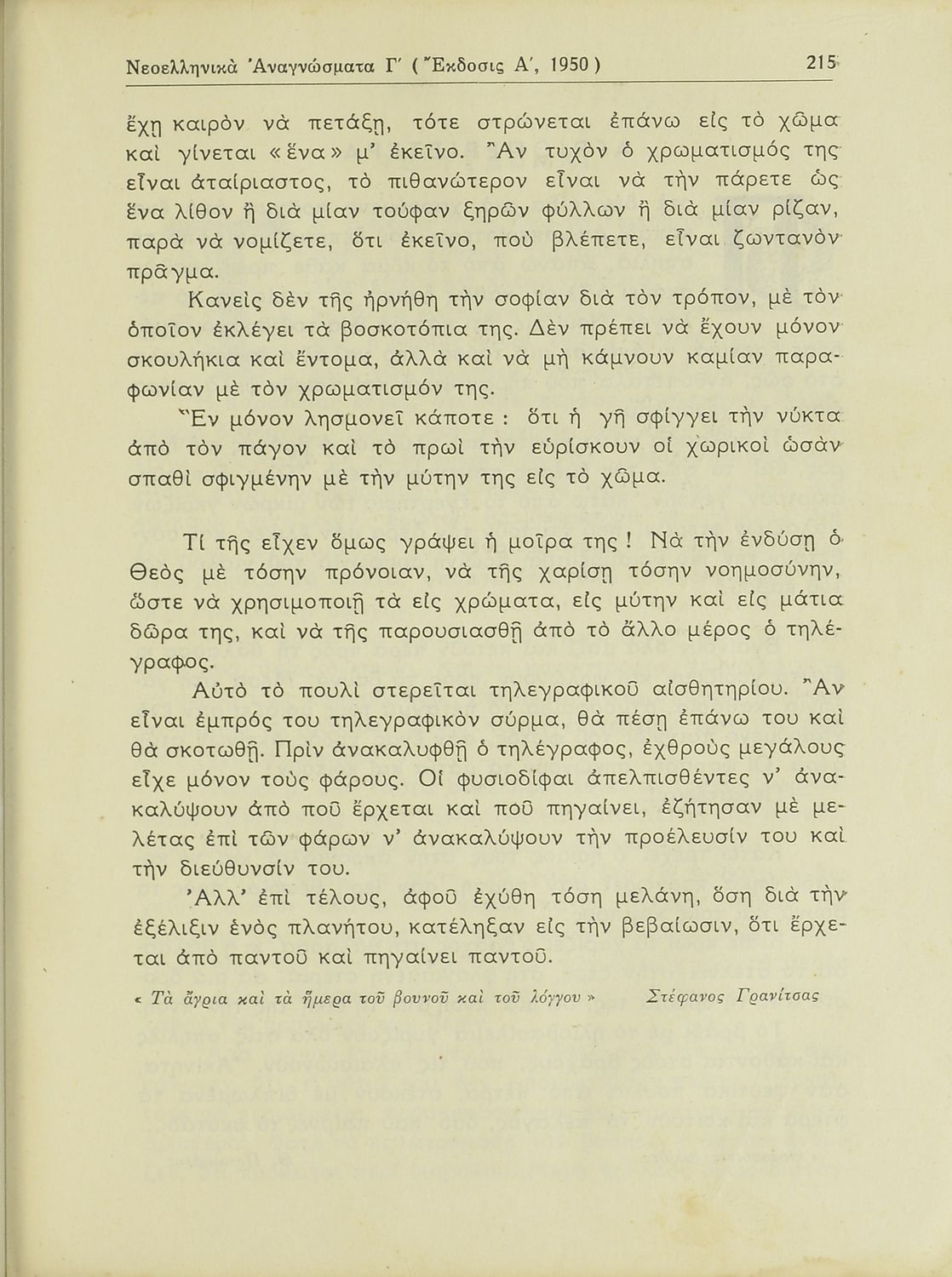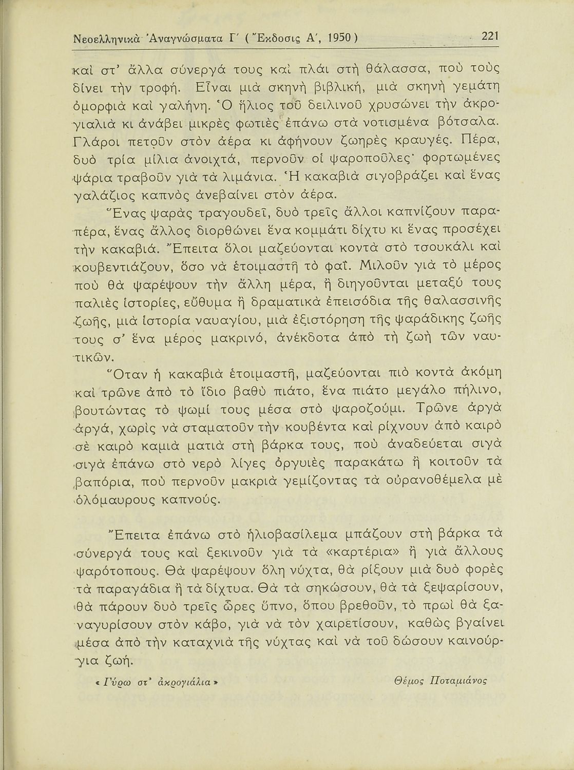 Σχολικό εγχειρίδιο Νέων Ελληνικών Γ΄ Γυμνασίου που περιέχει ποιήματα και πεζά Ελλήνων συγγραφέων εμπνευσμένα από τη θρησκευτική, οικογενειακή και κοινωνική ζωή, την σύγχρονή ελληνική ιστορία και την ελληνική φύση. Περιέχει παράρτημα με βιογραφίες των συγγραφέων και λεξιλόγιο.
