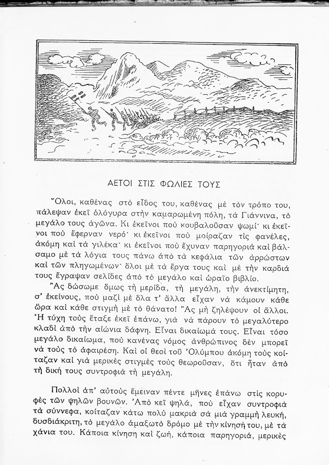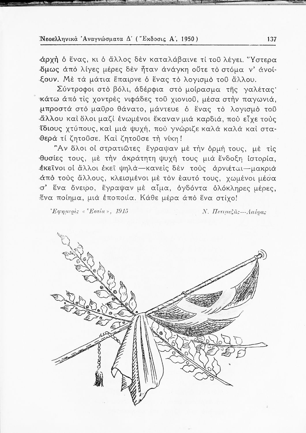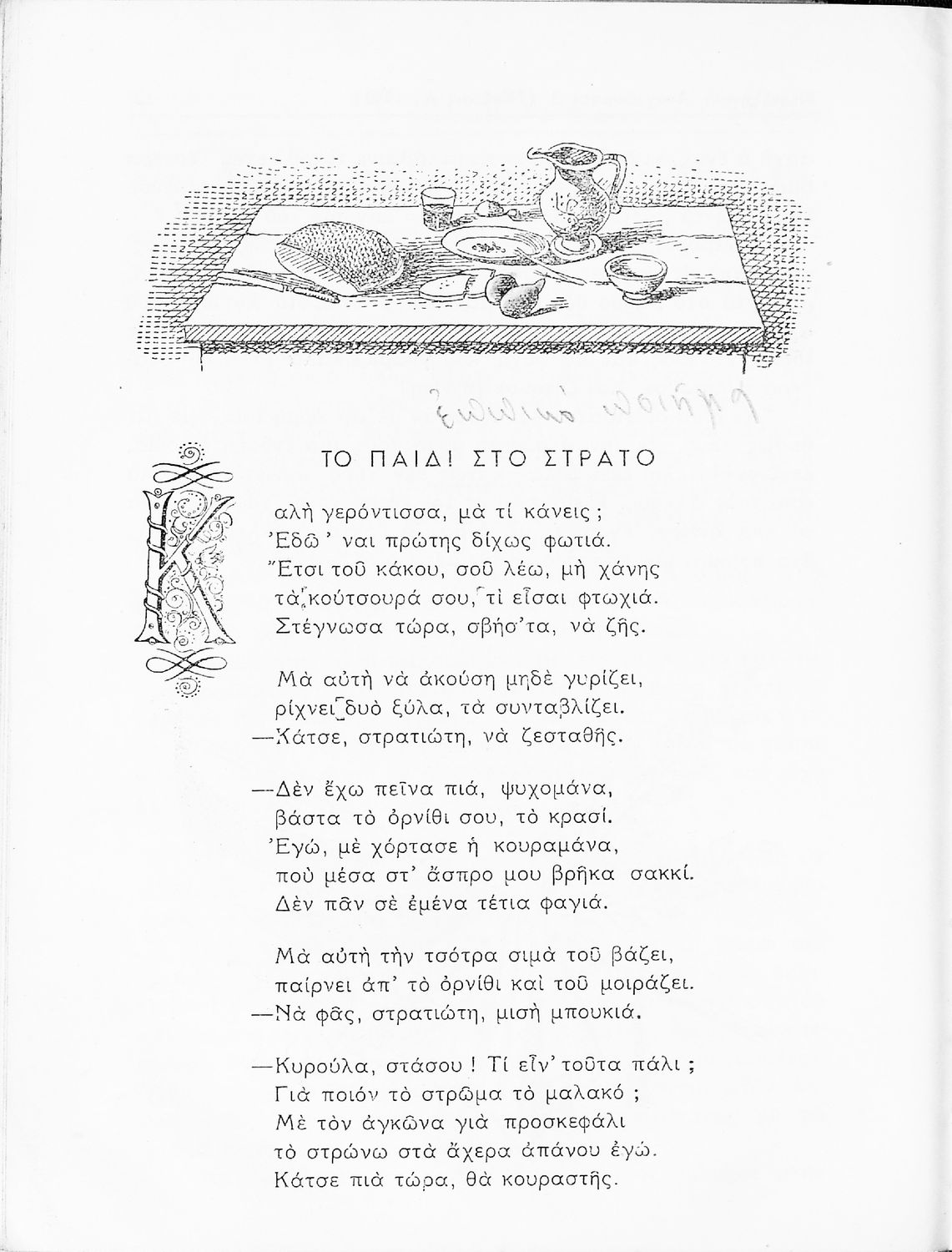 Σχολικό εγχειρίδιο Νέων Ελληνικών Δ΄ Γυμνασίου Θηλέων που περιλαμβάνει πεζά, ποιήματα και δημοτικά τραγούδια εμπνευσμένα από την σύγχρονη ελληνική ιστορία και την οικογενειακή και θρησκευτική ζωή. Περιέχει και