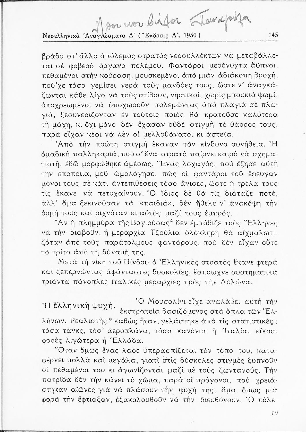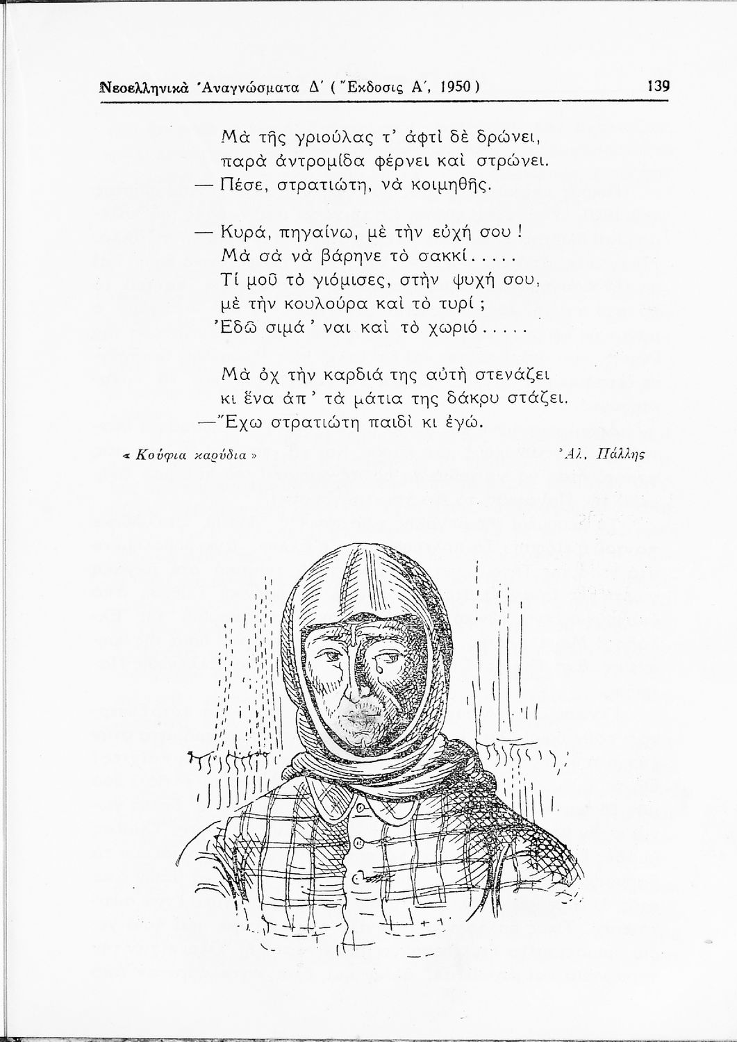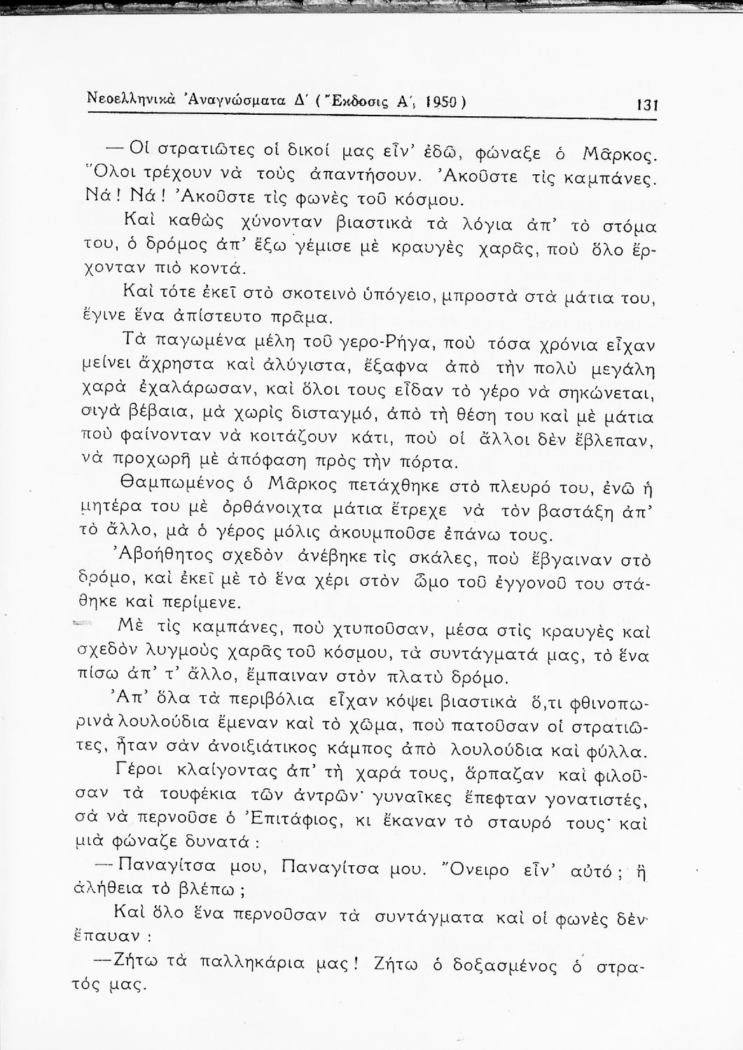 Σχολικό εγχειρίδιο Νέων Ελληνικών Δ΄ Γυμνασίου Θηλέων που περιλαμβάνει πεζά, ποιήματα και δημοτικά τραγούδια εμπνευσμένα από την σύγχρονη ελληνική ιστορία και την οικογενειακή και θρησκευτική ζωή. Περιέχει και