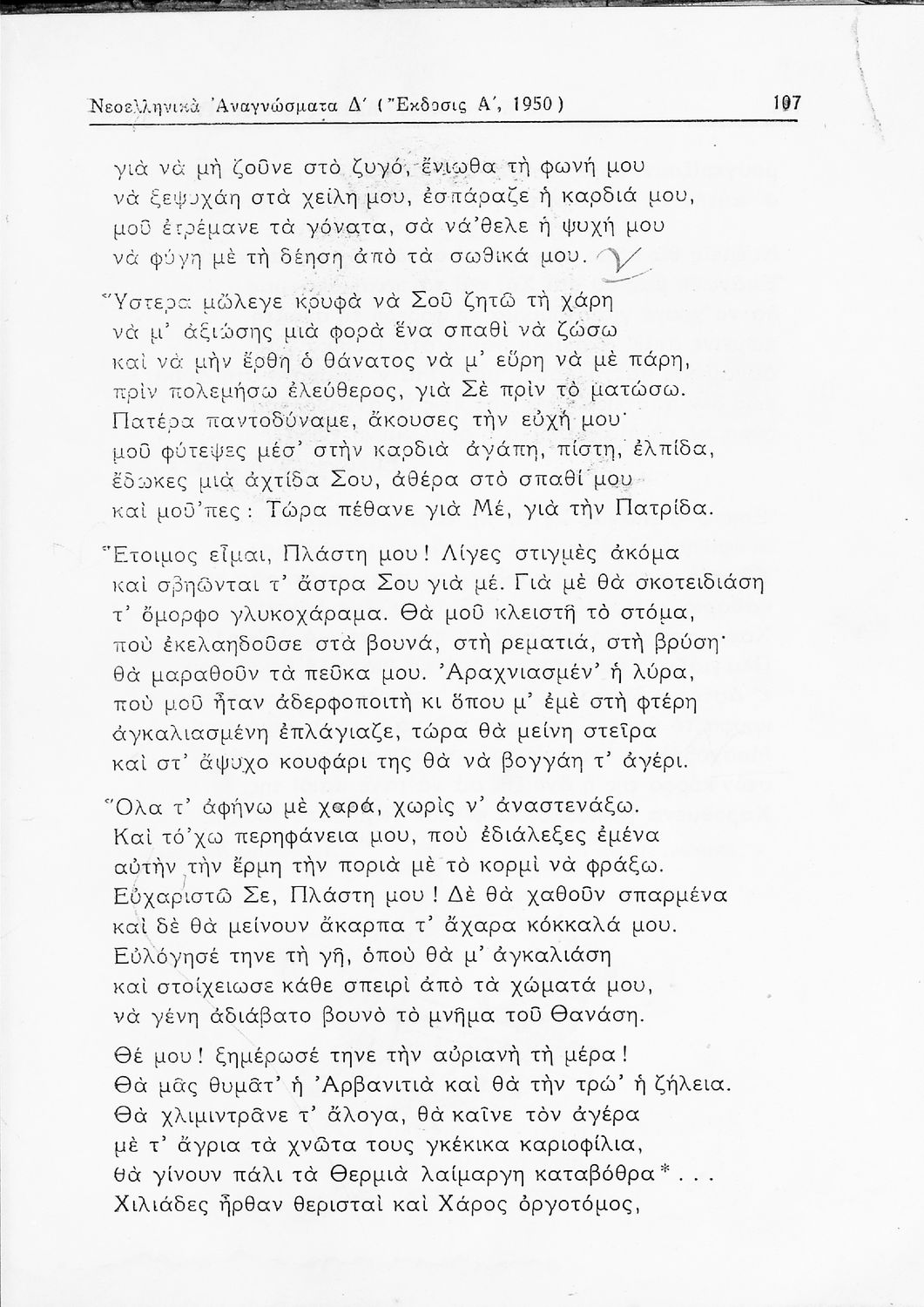 Σχολικό εγχειρίδιο Νέων Ελληνικών Δ΄ Γυμνασίου Θηλέων που περιλαμβάνει πεζά, ποιήματα και δημοτικά τραγούδια εμπνευσμένα από την σύγχρονη ελληνική ιστορία και την οικογενειακή και θρησκευτική ζωή. Περιέχει και