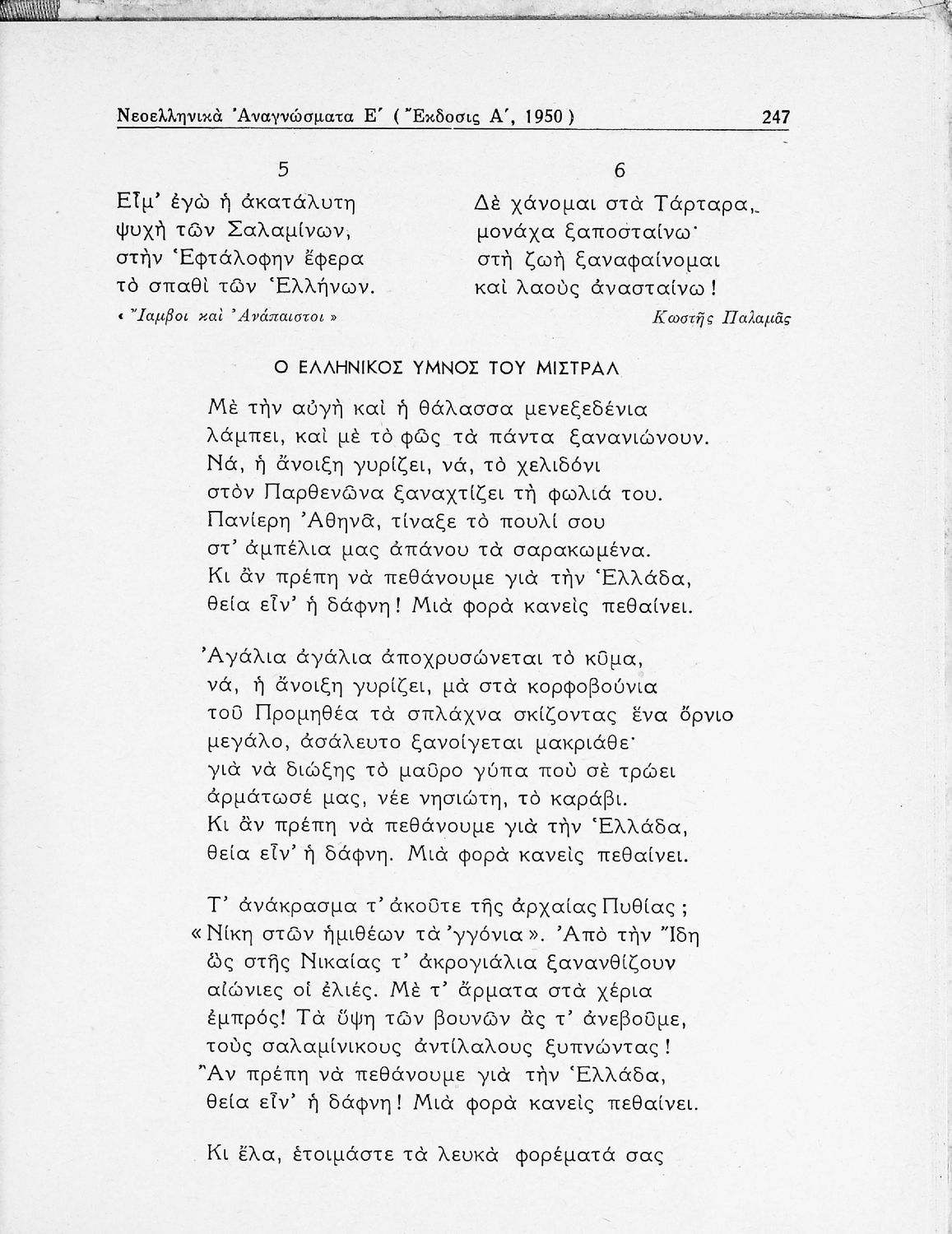 Σχολικό εγχειρίδιο Νέων Ελληνικών Ε΄ Γυμνασίου που περιέχει πεζά και ποιήματα Ελλήνων και ξένων συγγραφέων εμπνευσμένα από την αρχαία και σύγχρονη ελληνική ιστορία, τη βυζαντινή ιστορία, τη θρησκευτική ...