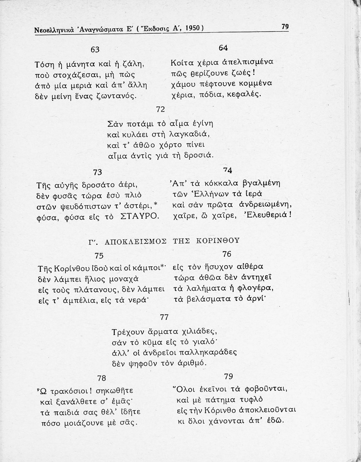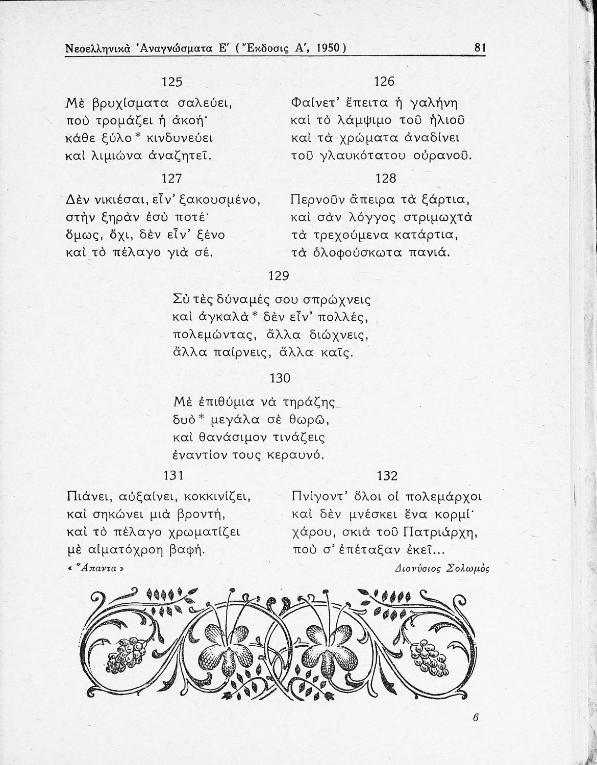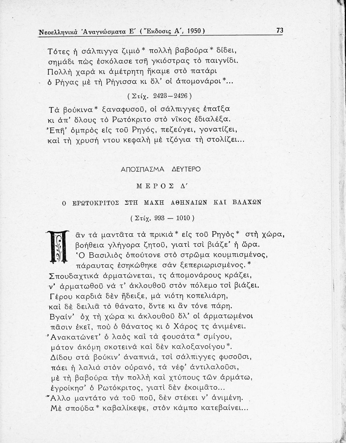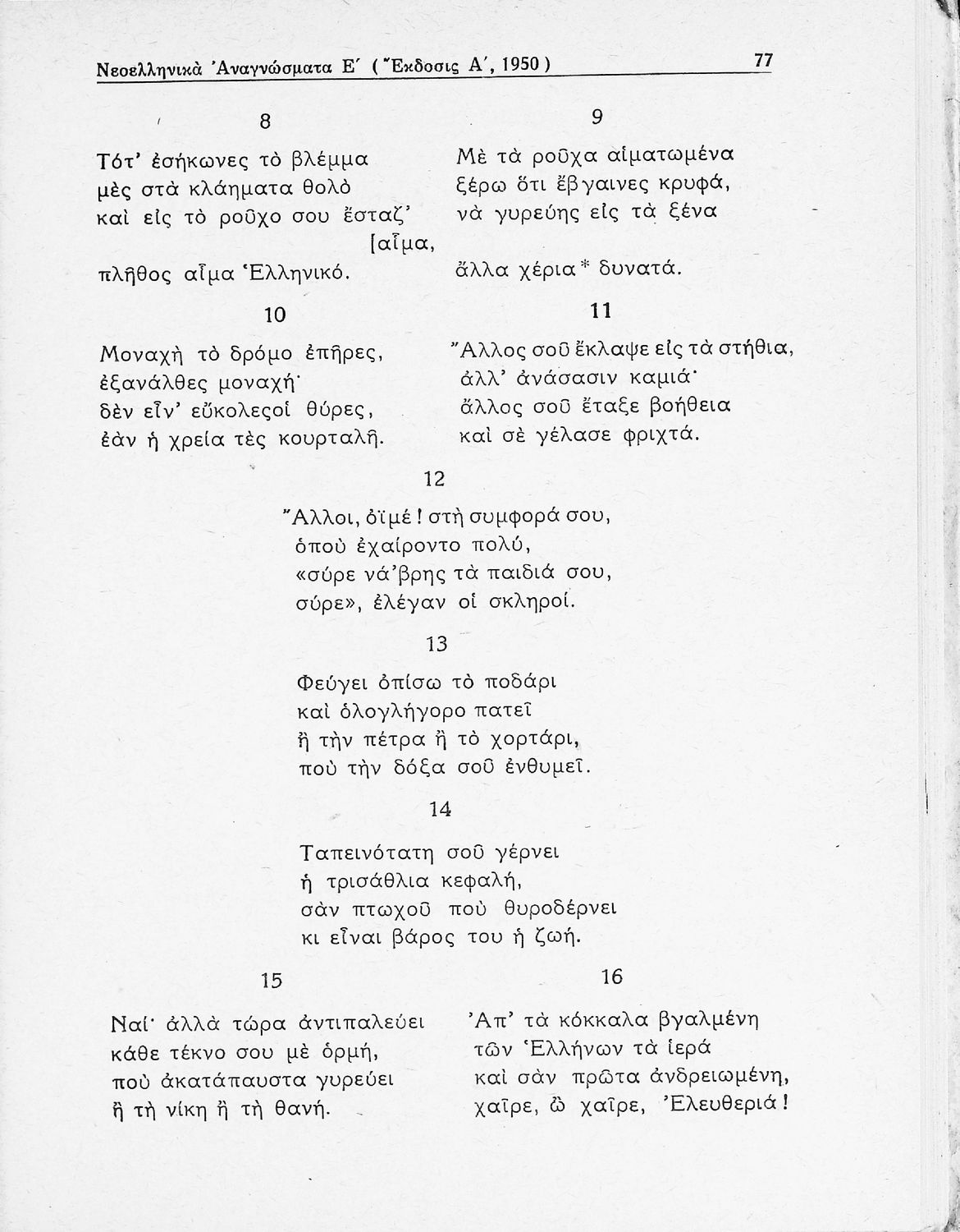 Σχολικό εγχειρίδιο Νέων Ελληνικών Ε΄ Γυμνασίου που περιέχει πεζά και ποιήματα συγγραφέων της βυζαντινής και μεταβυζαντινής περιόδου πατριωτικού και θρησκευτικού περιεχομένου. Περιλαμβάνει και πεζά και ποιήματα