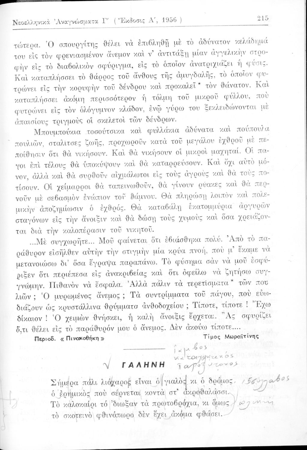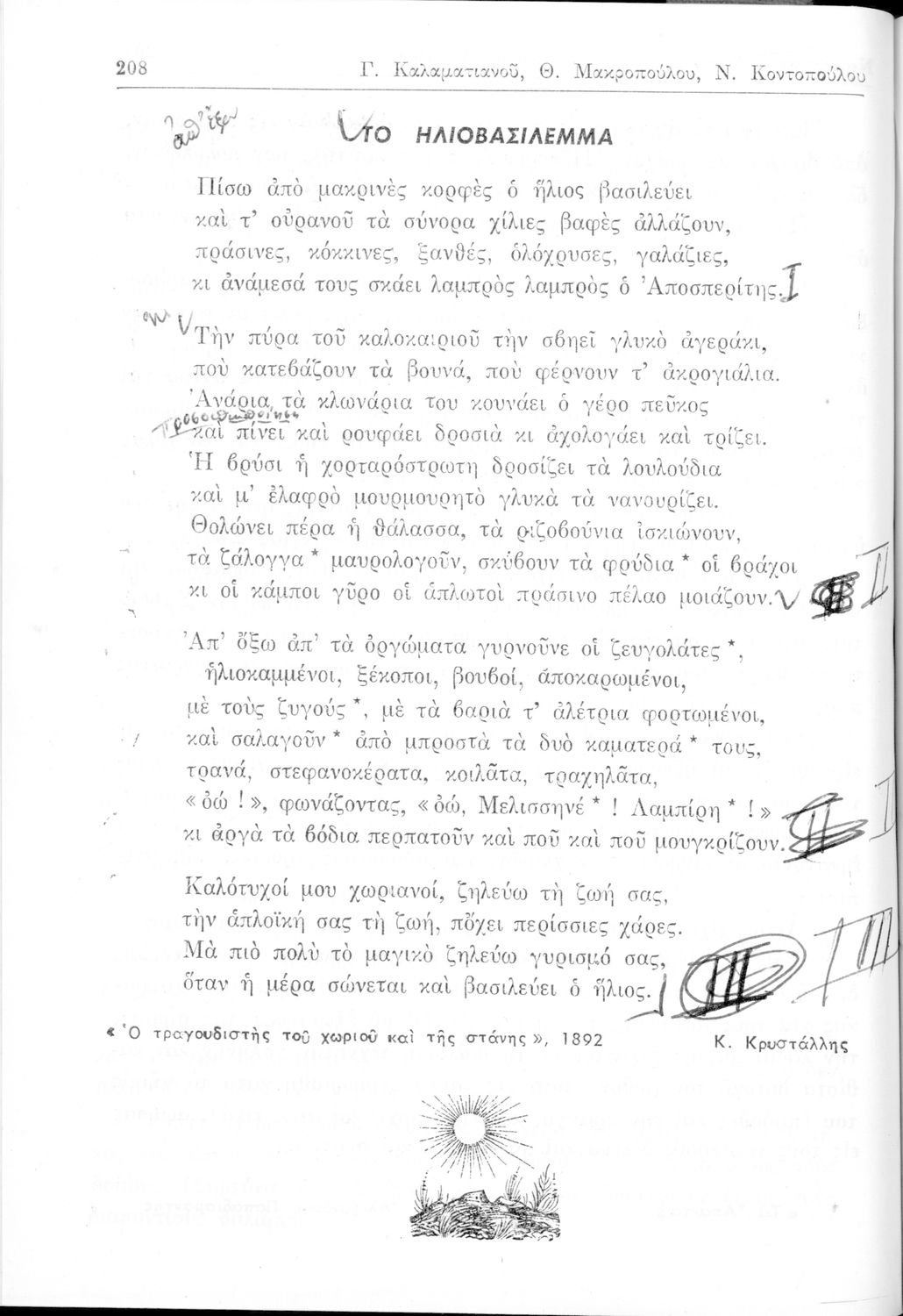 Σχολικό εγχειρίδιο Νέων Ελληνικών Γ΄ Γυμνασίου που περιέχει ποιήματα και πεζά Ελλήνων συγγραφέων εμπνευσμένα από τη θρησκευτική, οικογενειακή και κοινωνική ζωή, την σύγχρονή ελληνική ιστορία και την ελληνική φύση. Περιέχει παράρτημα με βιογραφίες των συγγραφέων και λεξιλόγιο.
