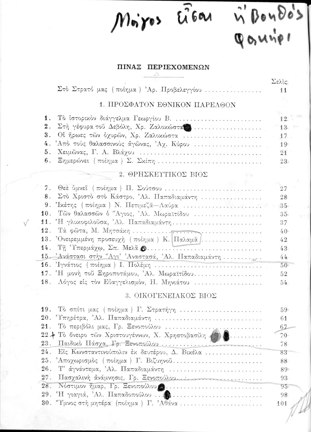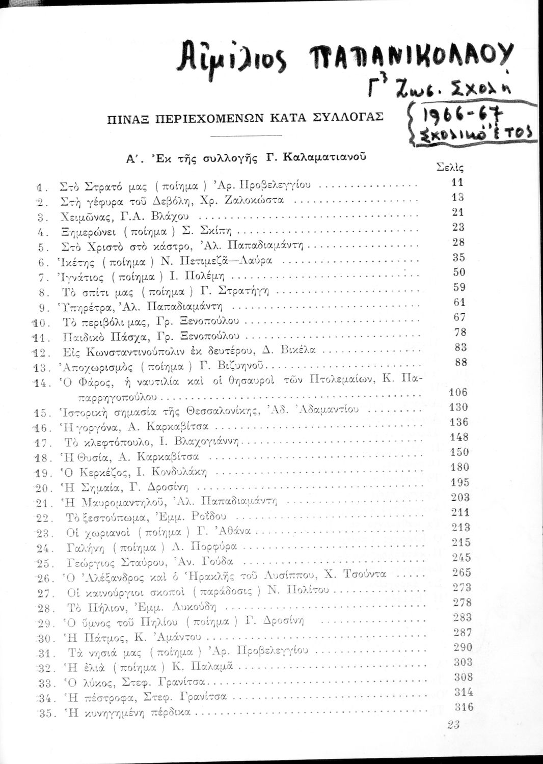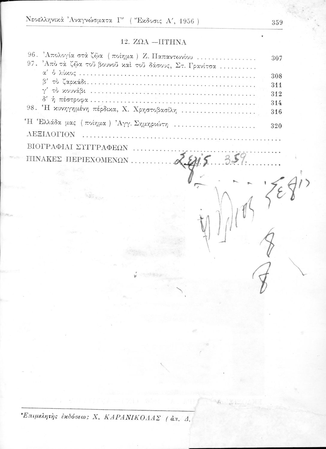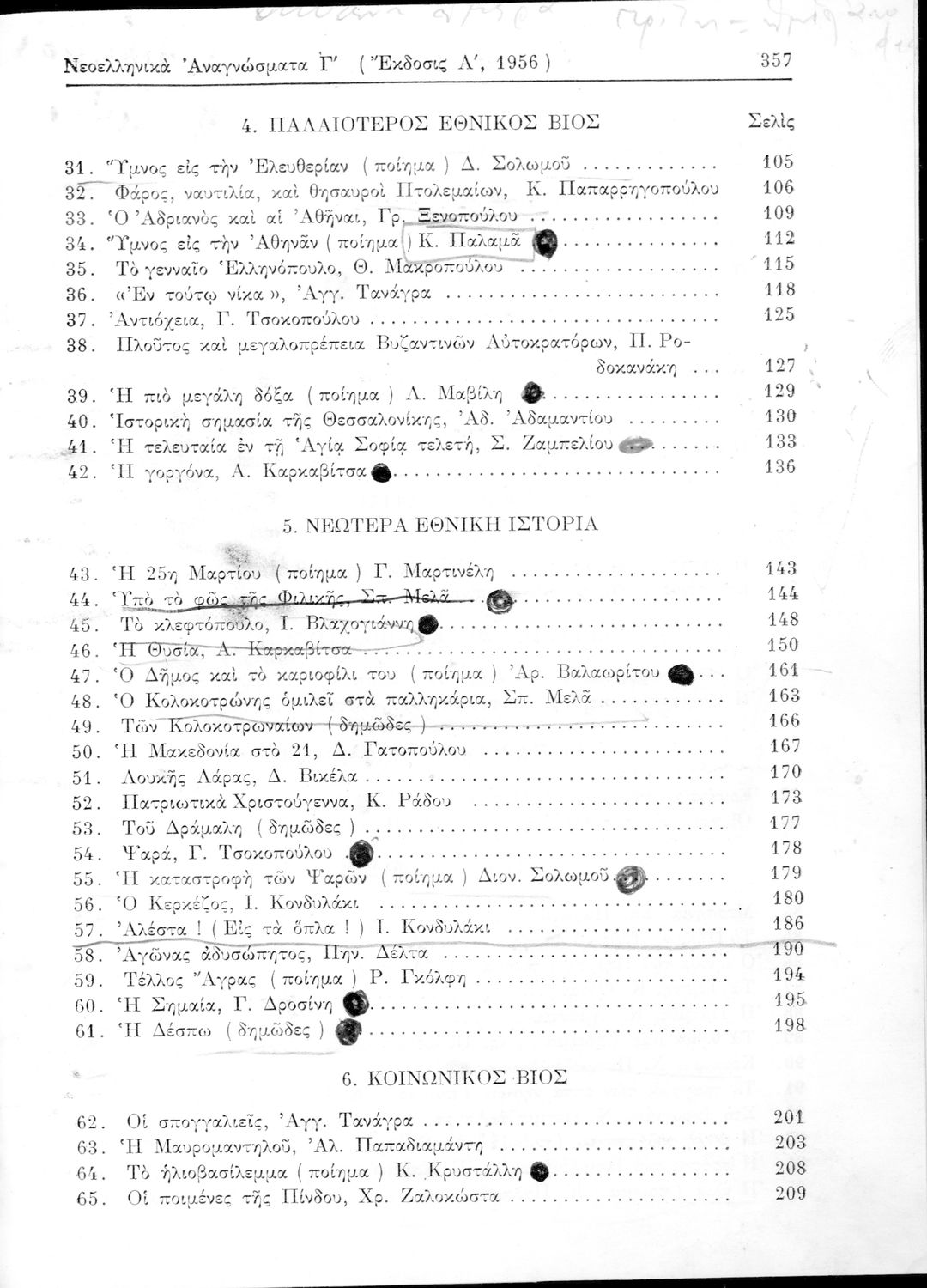 Σχολικό εγχειρίδιο Νέων Ελληνικών Γ΄ Γυμνασίου και Α' Αστικού Σχολείου που περιέχει πεζά και ποιήματα Ελλήνων συγγραφέων εμπνευσμένα από τη θρησκευτική και κοινωνική ζωή, την ελληνική μυθολογία, την αρχαία και