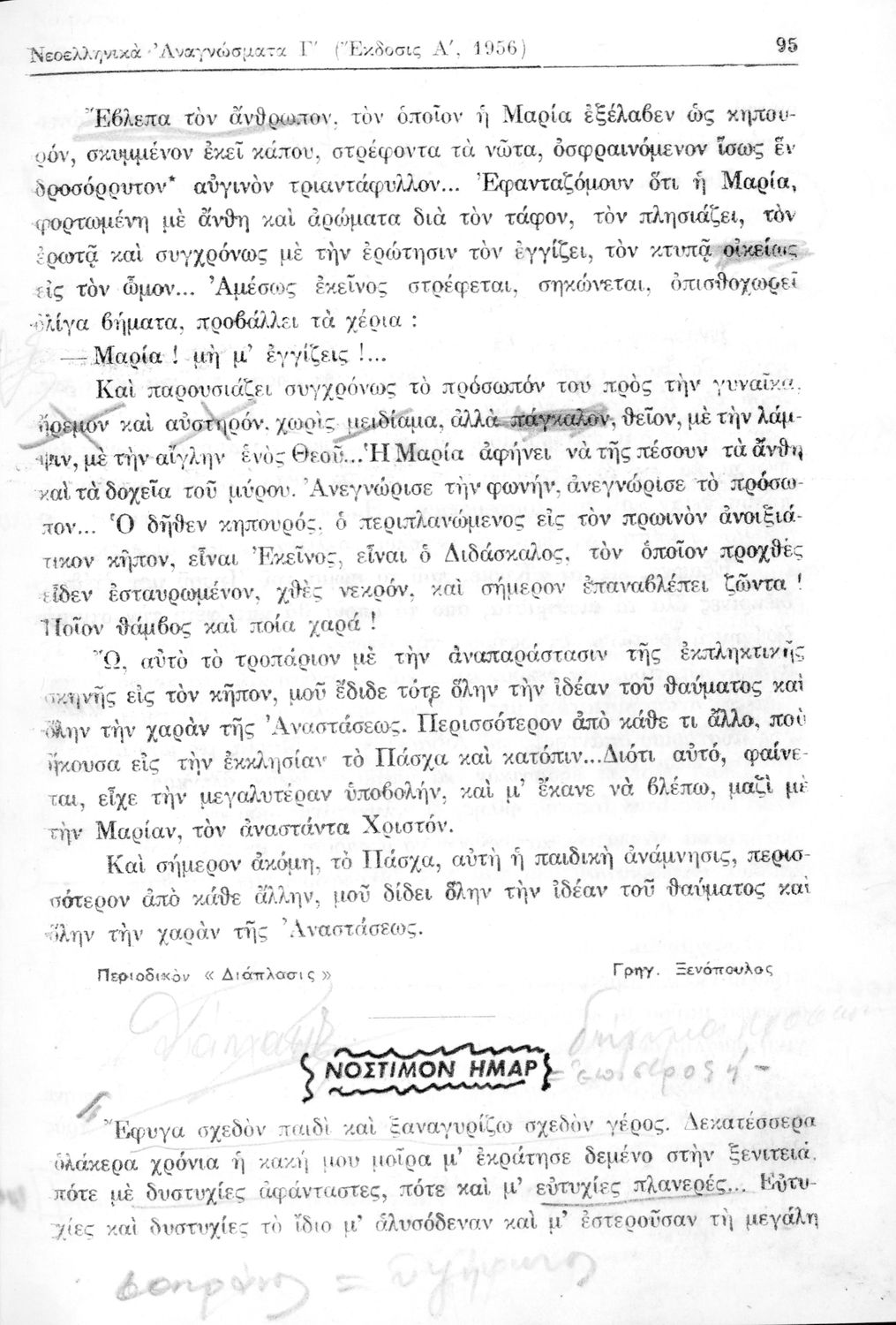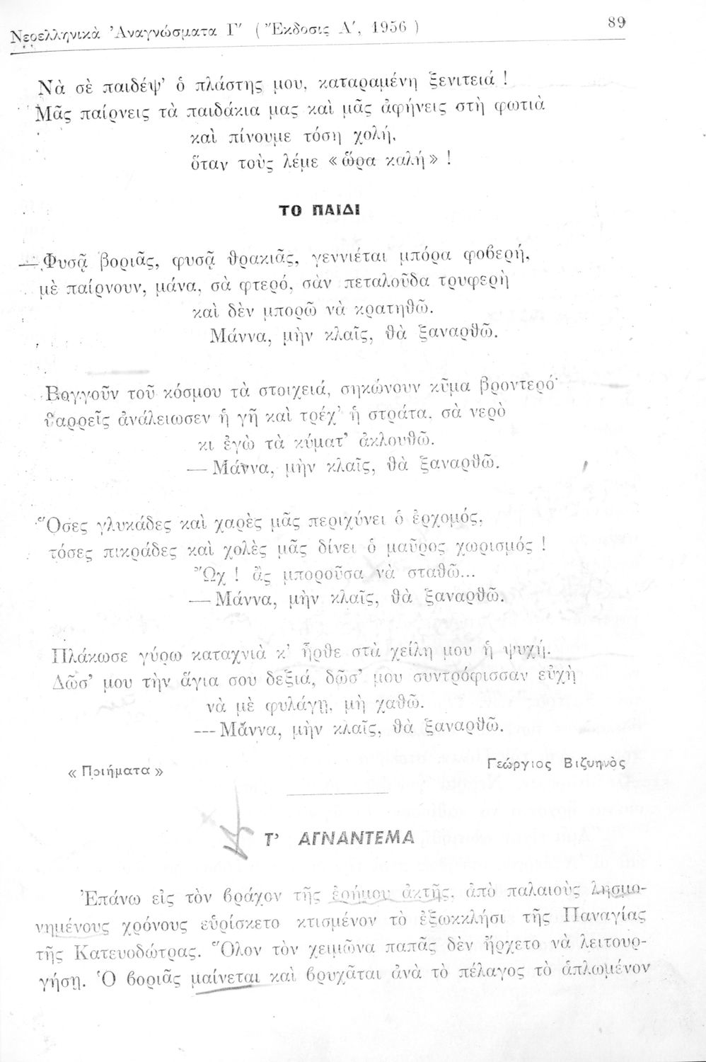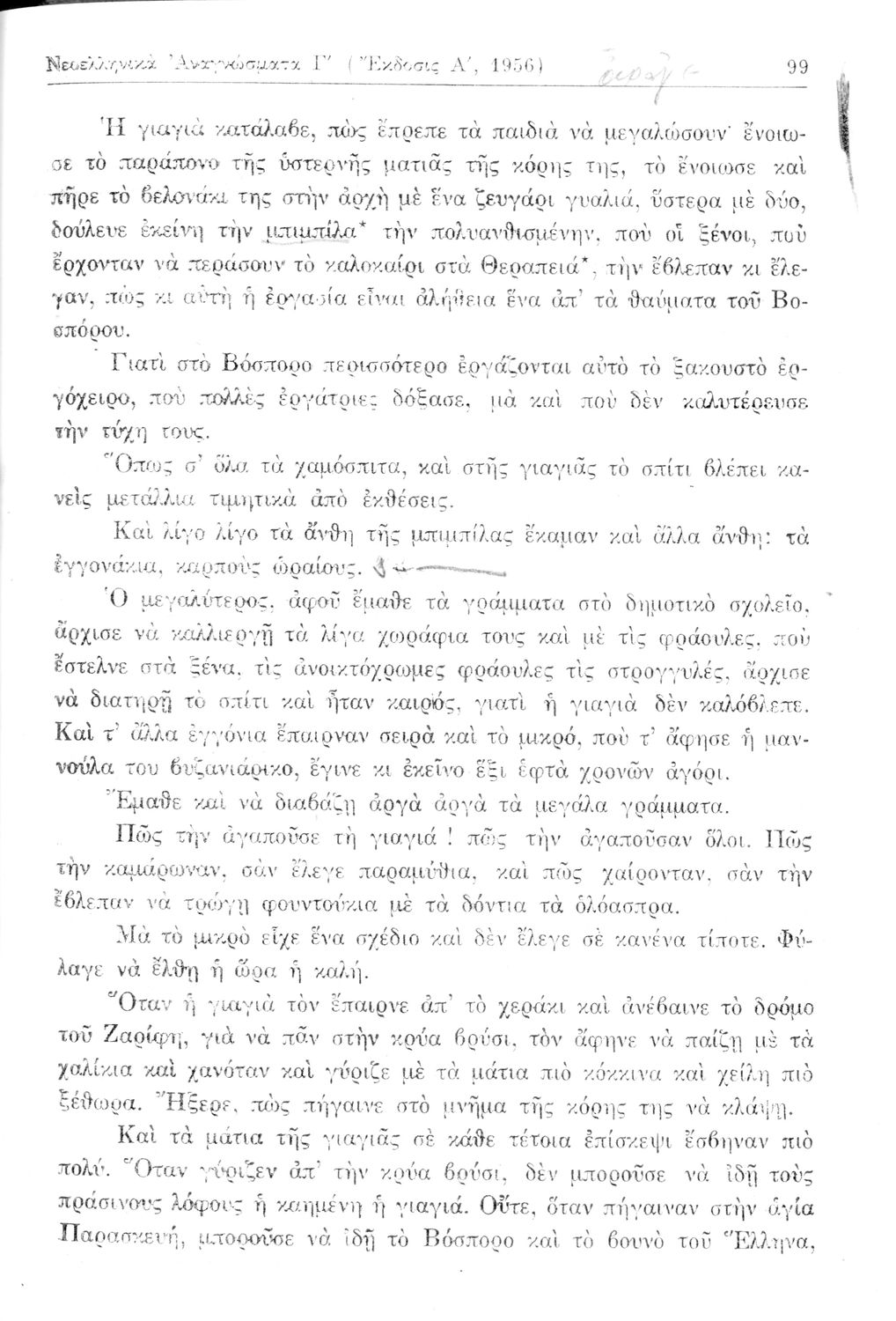 Σχολικό εγχειρίδιο Νέων Ελληνικών Γ΄ Γυμνασίου και Α' Αστικού Σχολείου που περιέχει πεζά και ποιήματα Ελλήνων συγγραφέων εμπνευσμένα από τη θρησκευτική και κοινωνική ζωή, την ελληνική μυθολογία, την αρχαία και