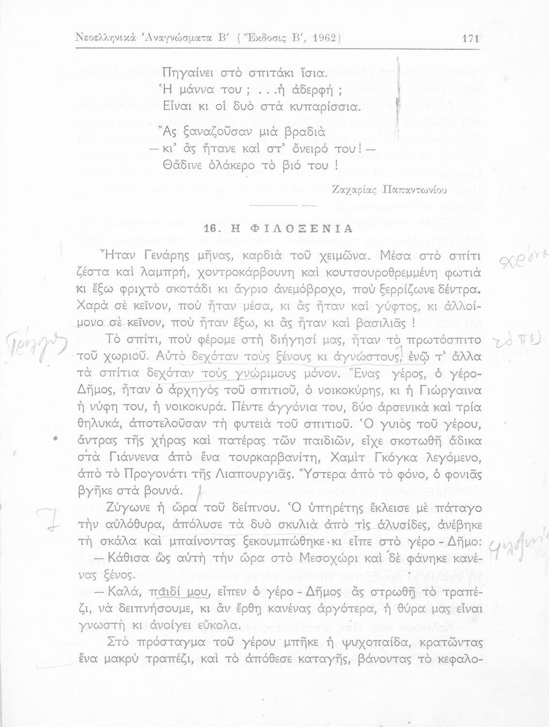 Σχολικό εγχειρίδιο Νέων Ελληνικών Δ΄ Γυμνασίου και Β΄ Αστικού Σχολείου που περιέχει πεζά και ποιήματα Ελλήνων συγγραφέων εμπνευσμένα από τη θρησκευτική και κοινωνική ζωή, την ελληνική μυθολογία, την αρχαία και