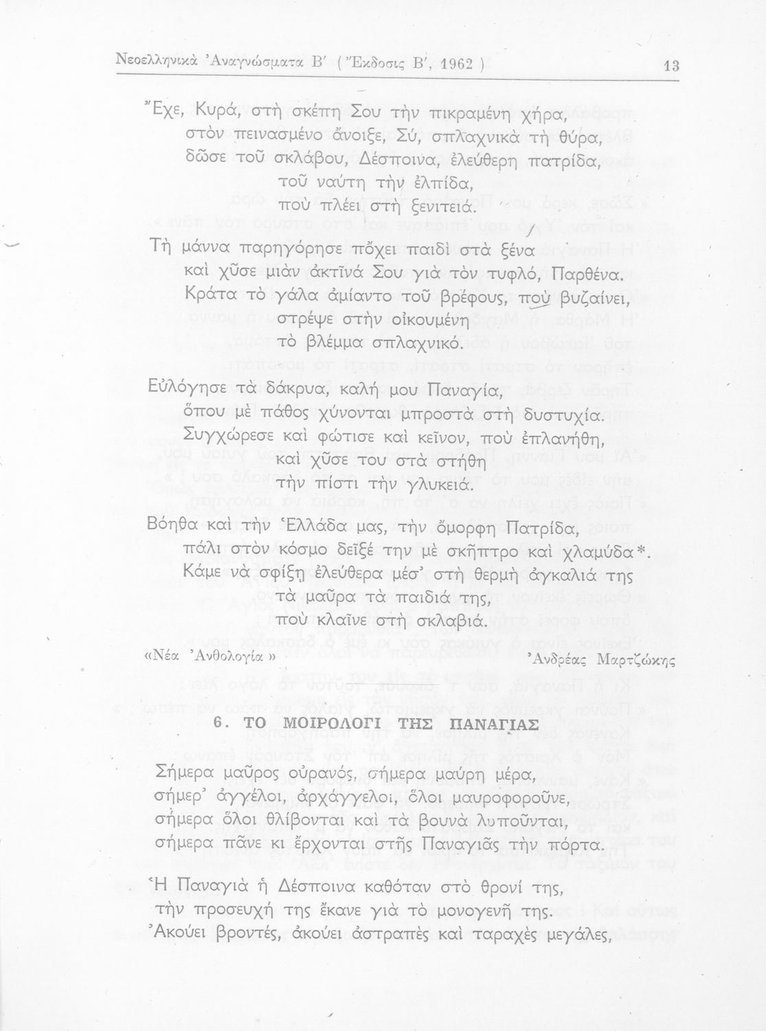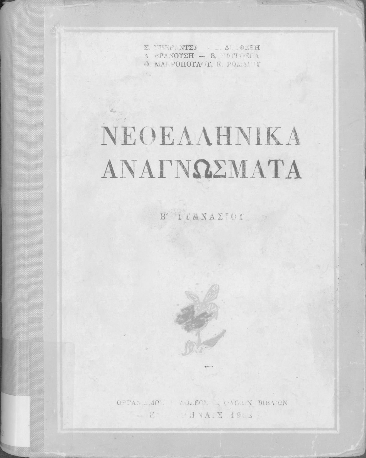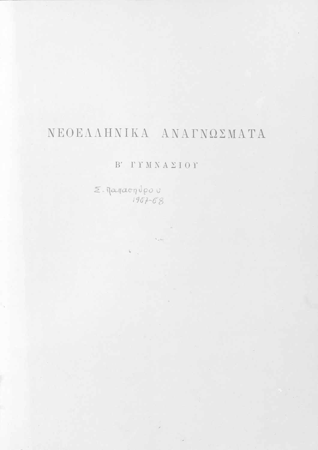 Σχολικό εγχειρίδιο Νέων Ελληνικών Δ΄ Γυμνασίου και Β΄ Αστικού Σχολείου που περιέχει πεζά και ποιήματα Ελλήνων συγγραφέων εμπνευσμένα από τη θρησκευτική και κοινωνική ζωή, την ελληνική μυθολογία, την αρχαία και