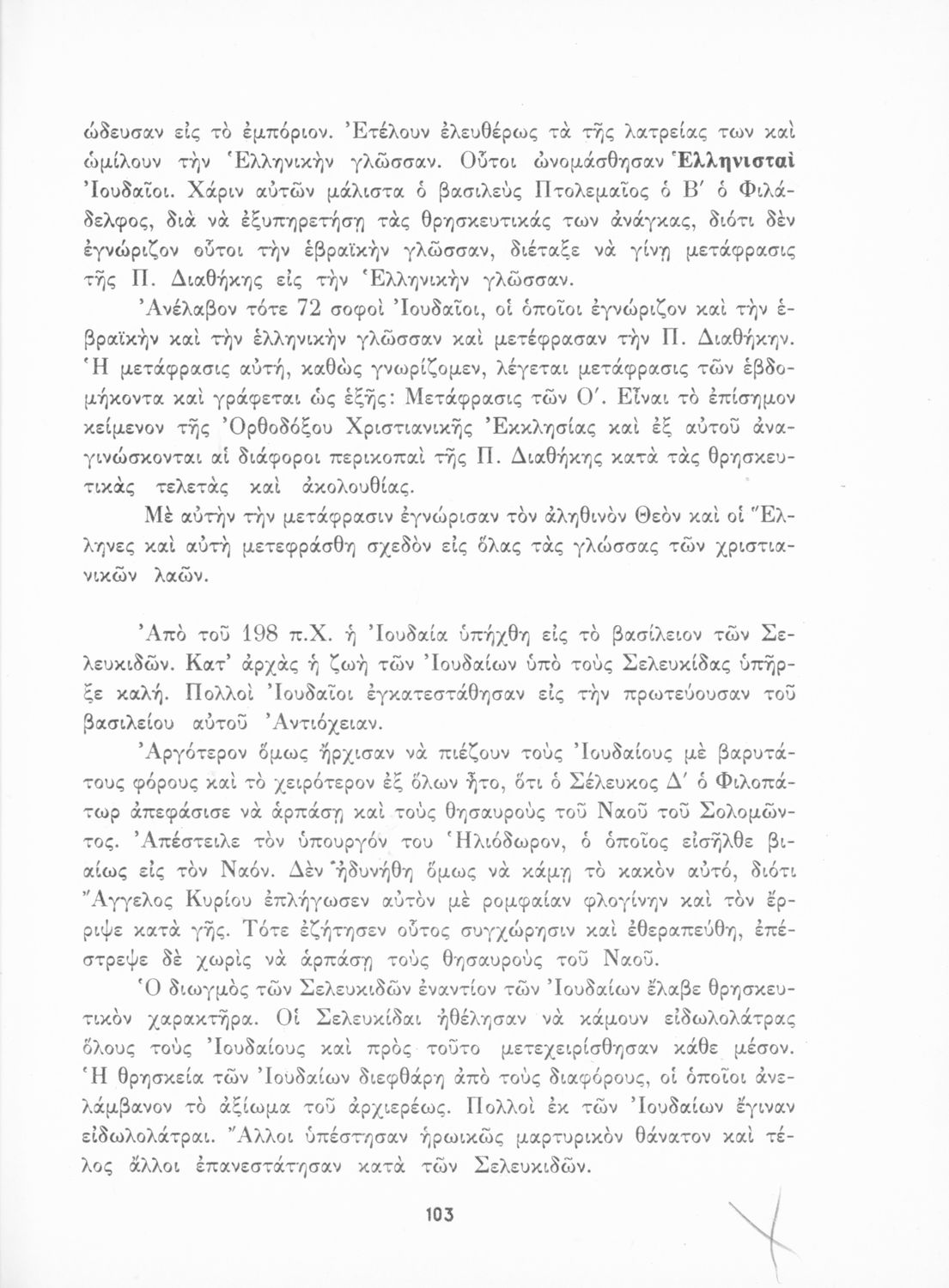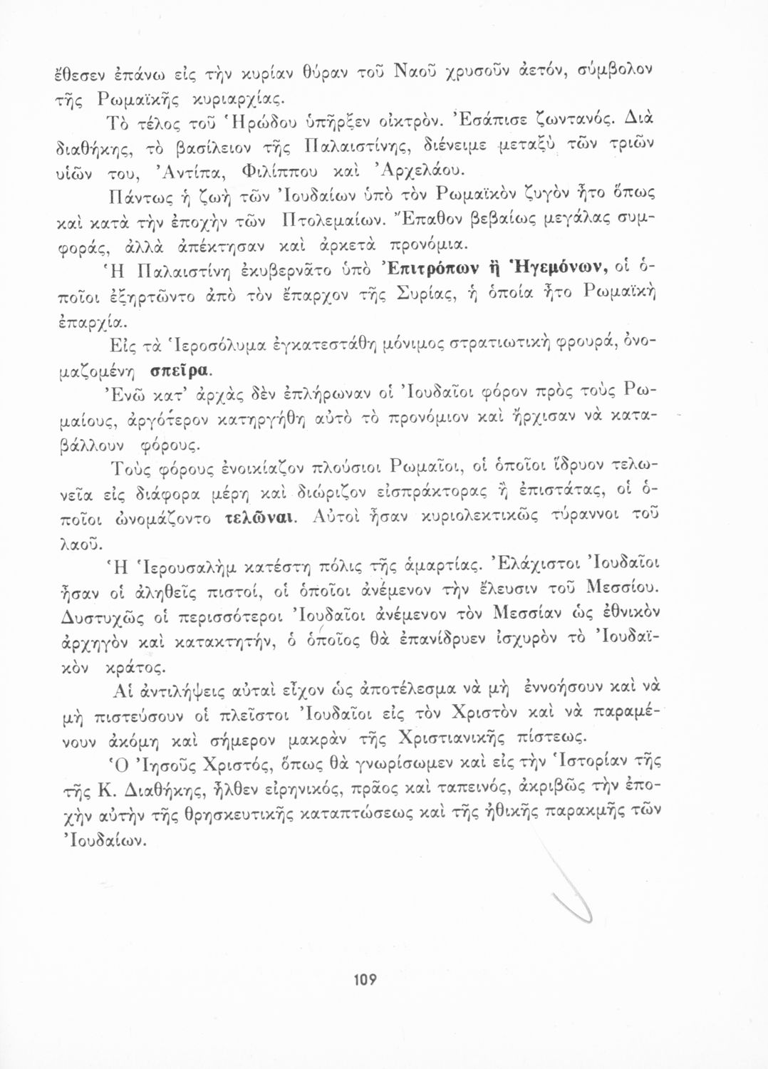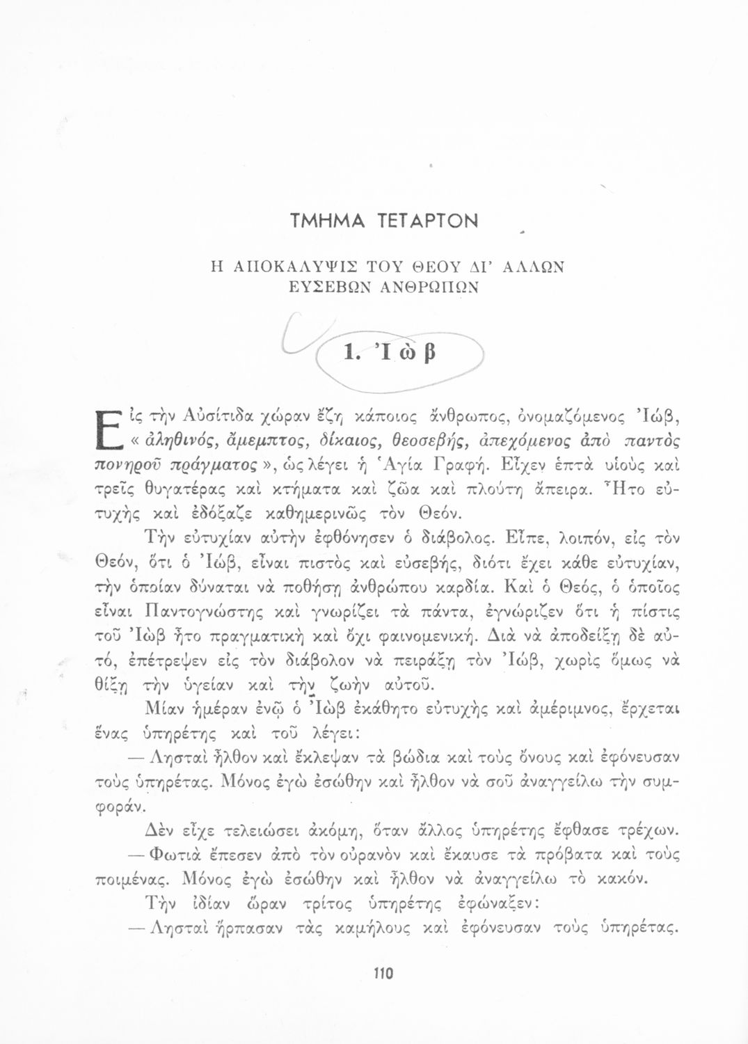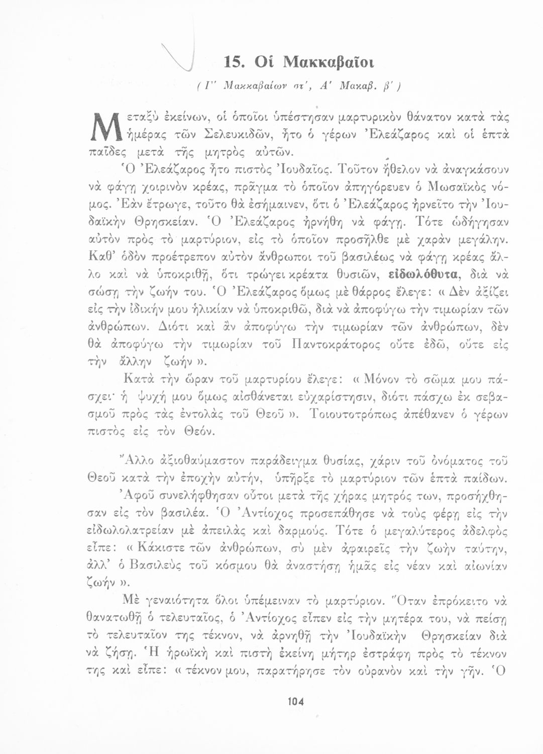 Σχολικό εγχειρίδιο Θρησκευτικών που συνιστά μία εξιστόρηση της Παλαιάς Διαθήκης από τη δημιουργία του κόσμου ως τους Προφήτες. Φέρει το σύμβολο της δικτατορίας.