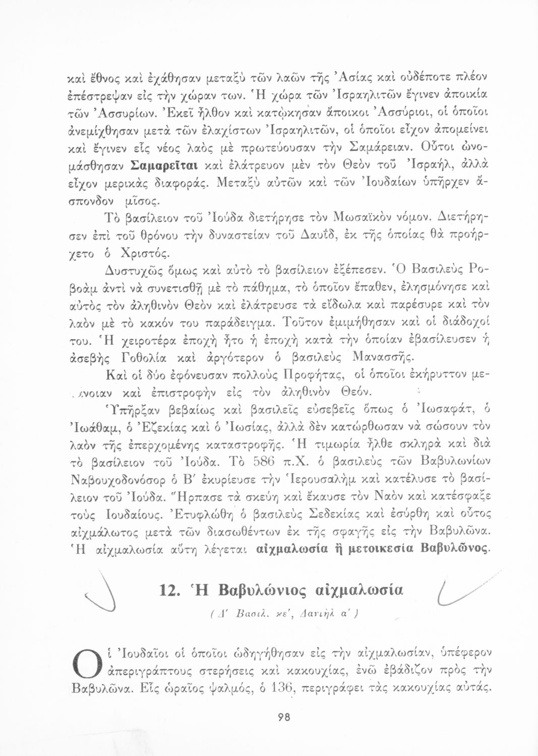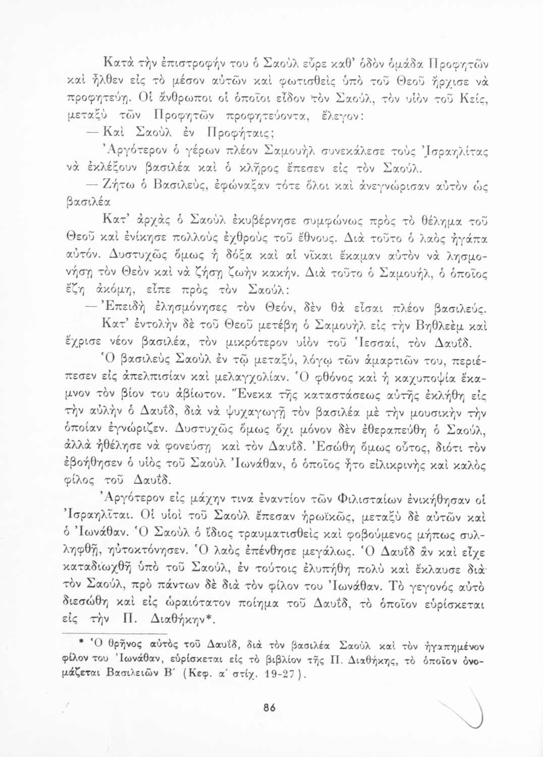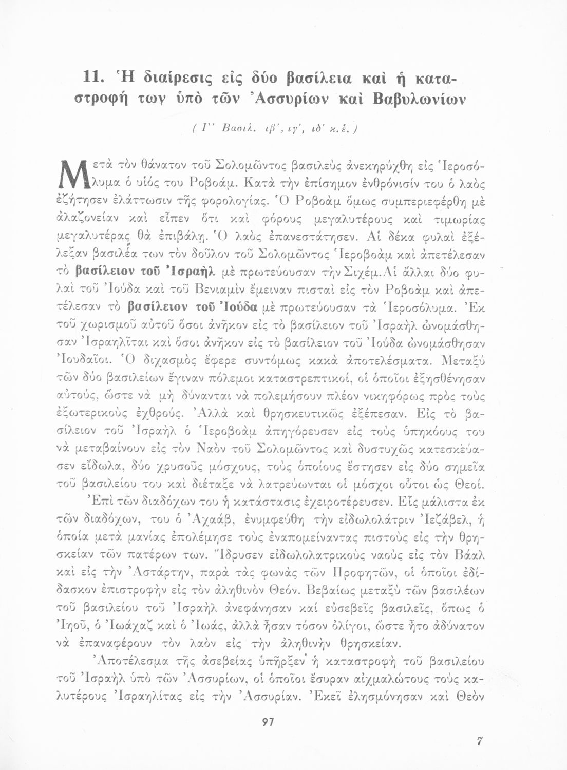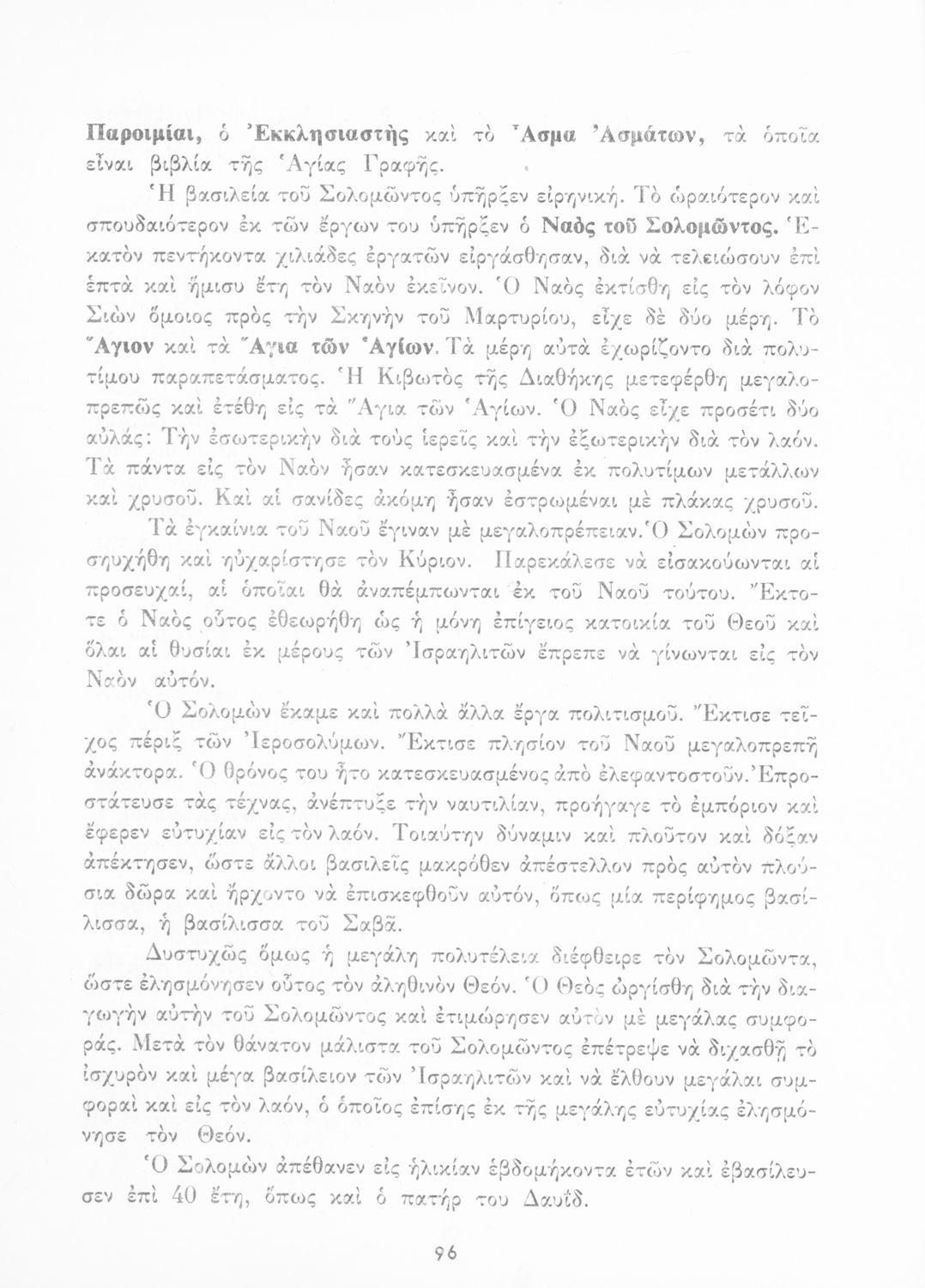 Σχολικό εγχειρίδιο Θρησκευτικών που συνιστά μία εξιστόρηση της Παλαιάς Διαθήκης από τη δημιουργία του κόσμου ως την υποταγή των Εβραίων στους Ρωμαίους. Περιέχει και στοιχεία γεωγραφίας της Παλαιστίνης.
