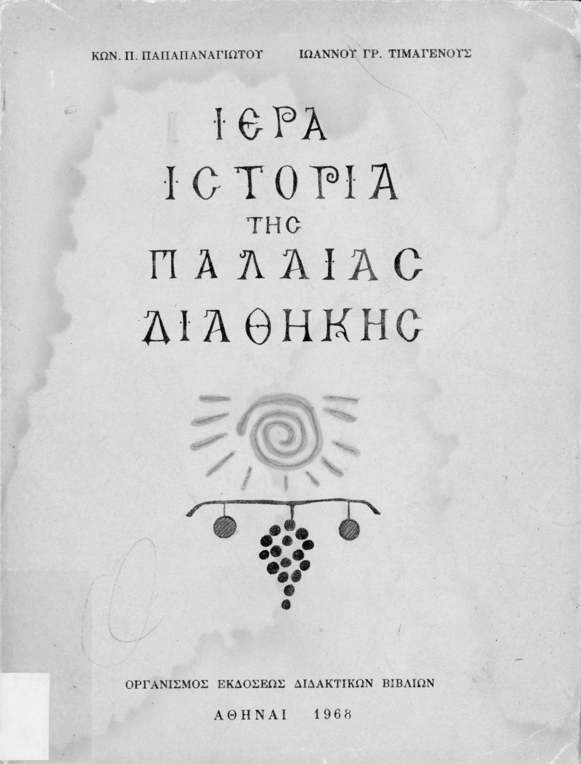 Σχολικό εγχειρίδιο Θρησκευτικών που συνιστά μία εξιστόρηση της Παλαιάς Διαθήκης από τη δημιουργία του κόσμου ως τους Προφήτες. Φέρει το σύμβολο της δικτατορίας.
