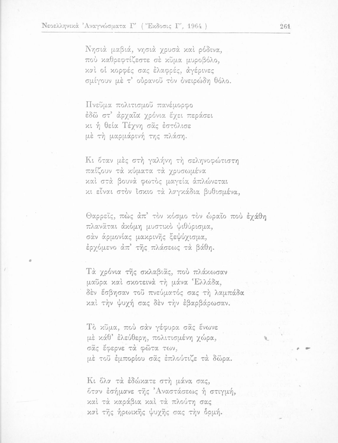 Σχολικό εγχειρίδιο Νέων Ελληνικών Γ΄ Γυμνασίου που περιέχει ποιήματα και πεζά Ελλήνων συγγραφέων εμπνευσμένα από τη θρησκευτική, οικογενειακή και κοινωνική ζωή, την σύγχρονή ελληνική ιστορία και την ελληνική φύση. Περιέχει παράρτημα με βιογραφίες των συγγραφέων και λεξιλόγιο.