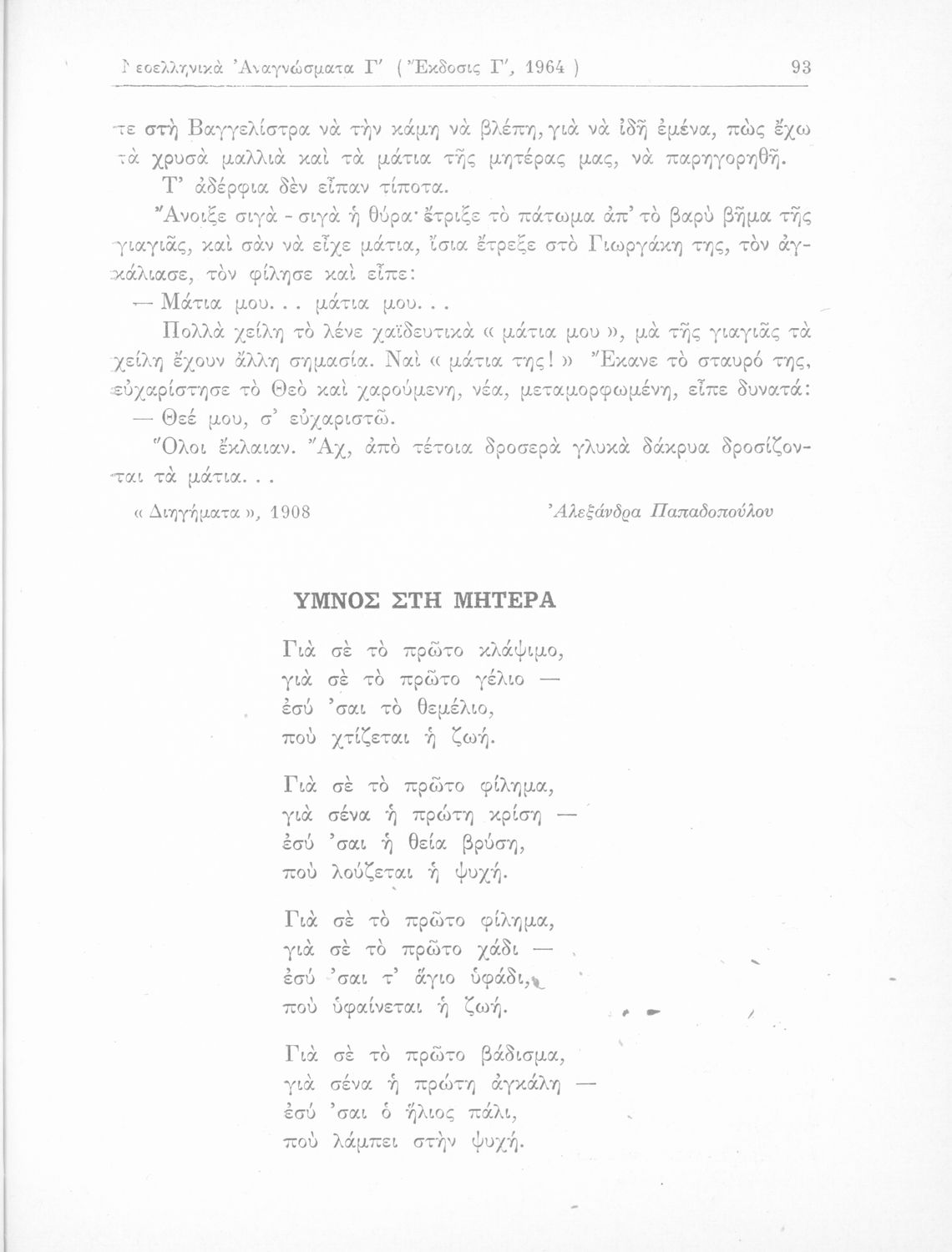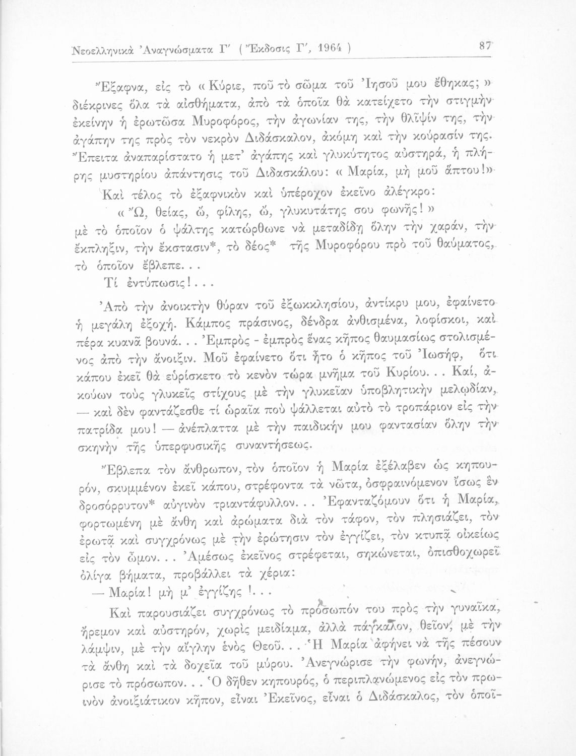 Σχολικό εγχειρίδιο Νέων Ελληνικών Γ΄ Γυμνασίου και Α' Αστικού Σχολείου που περιέχει πεζά και ποιήματα Ελλήνων συγγραφέων εμπνευσμένα από τη θρησκευτική και κοινωνική ζωή, την ελληνική μυθολογία, την αρχαία και