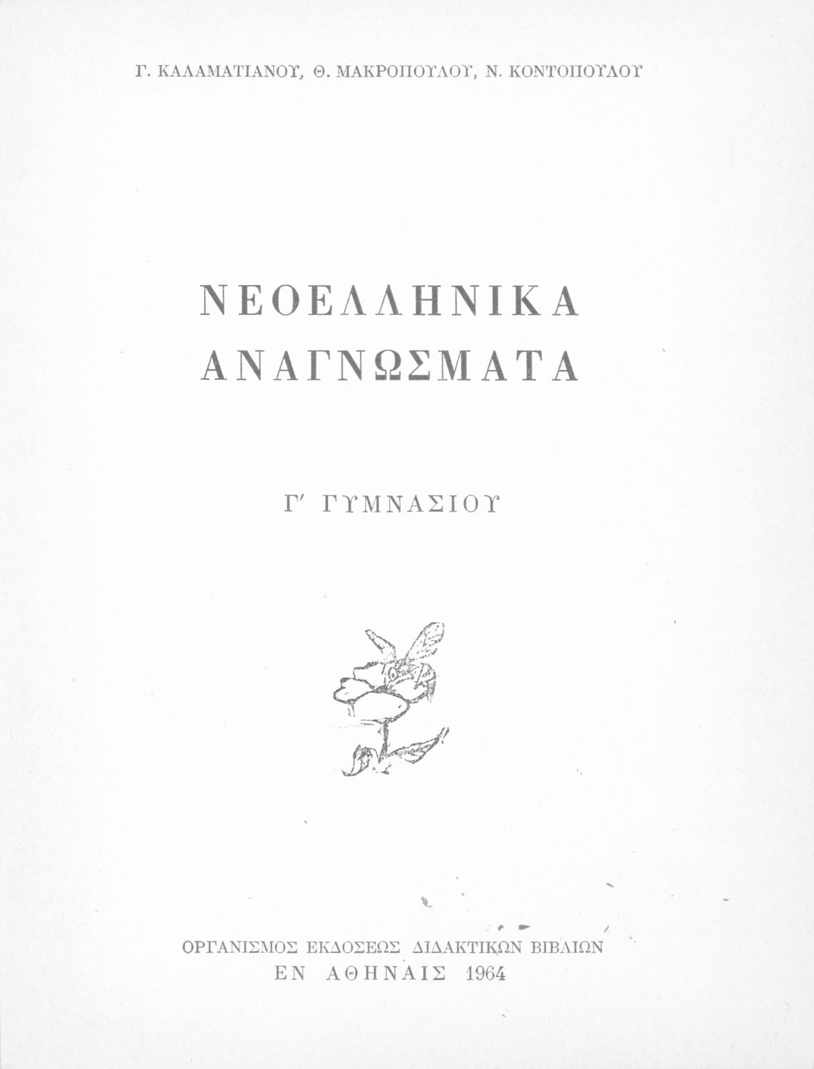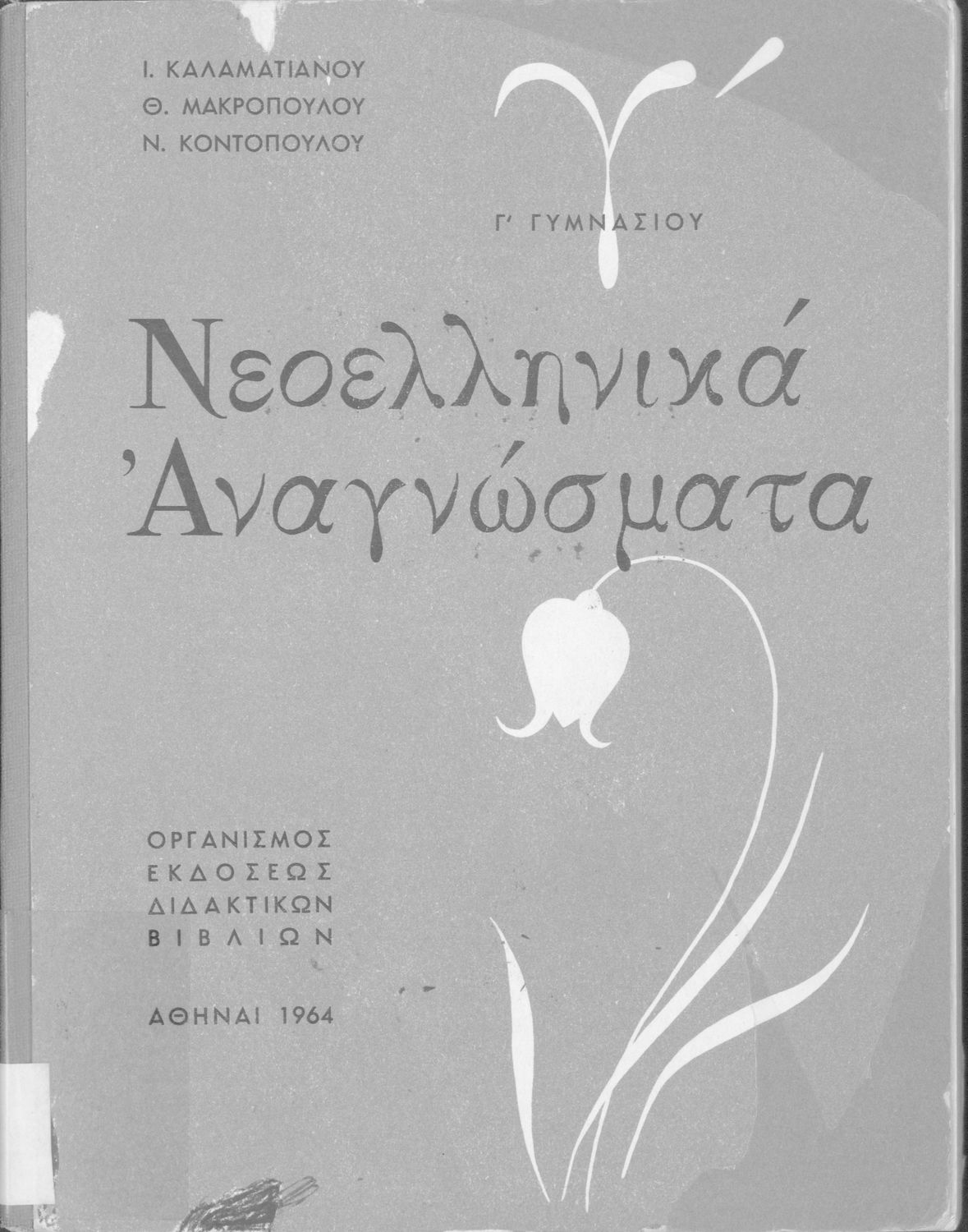 Σχολικό εγχειρίδιο Νέων Ελληνικών Γ΄ Γυμνασίου και Α' Αστικού Σχολείου που περιέχει πεζά και ποιήματα Ελλήνων συγγραφέων εμπνευσμένα από τη θρησκευτική και κοινωνική ζωή, την ελληνική μυθολογία, την αρχαία και