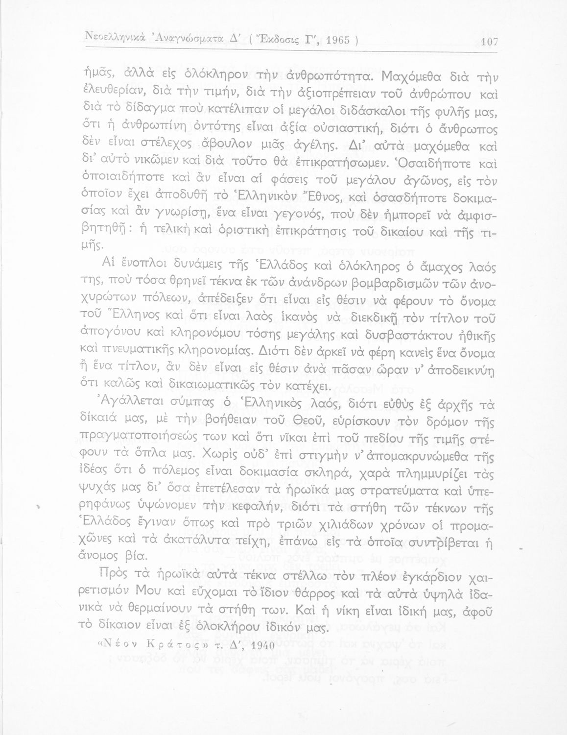 Σχολικό εγχειρίδιο Νέων Ελληνικών Δ΄ Γυμνασίου Θηλέων που περιλαμβάνει πεζά, ποιήματα και δημοτικά τραγούδια εμπνευσμένα από την σύγχρονη ελληνική ιστορία και την οικογενειακή και θρησκευτική ζωή. Περιέχει και