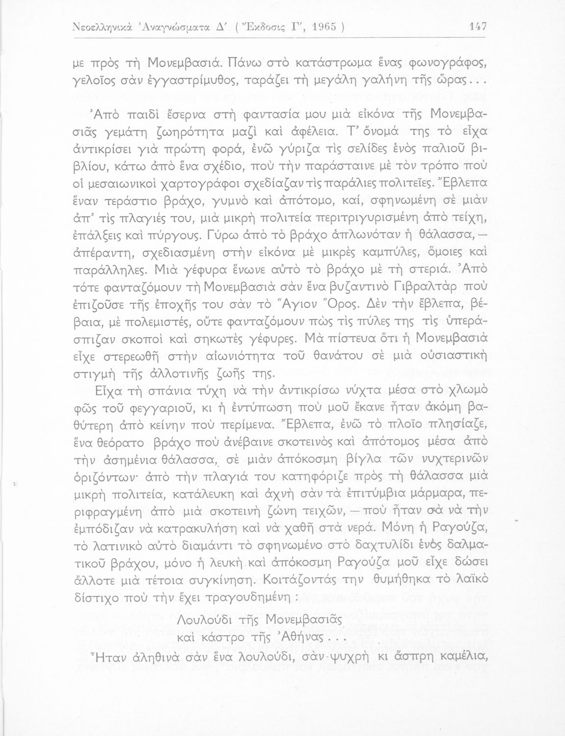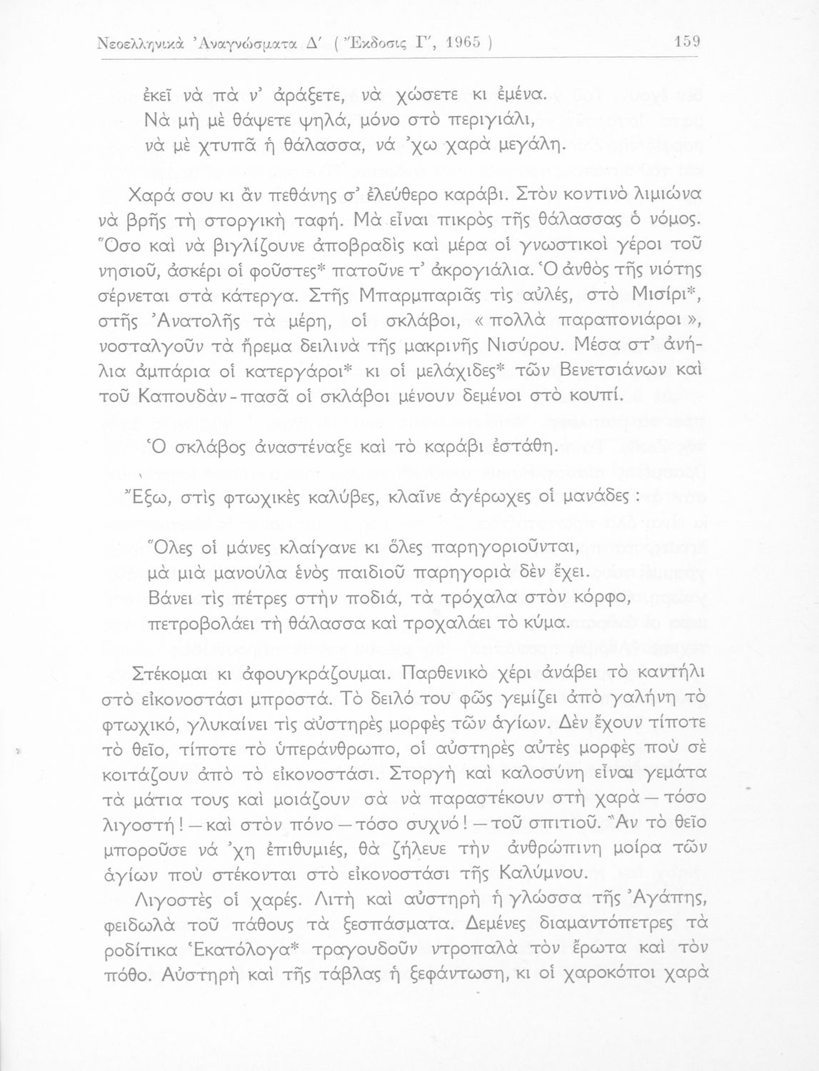 Σχολικό εγχειρίδιο Νέων Ελληνικών Δ΄ Γυμνασίου Θηλέων που περιλαμβάνει πεζά, ποιήματα και δημοτικά τραγούδια εμπνευσμένα από την σύγχρονη ελληνική ιστορία και την οικογενειακή και θρησκευτική ζωή. Περιέχει και